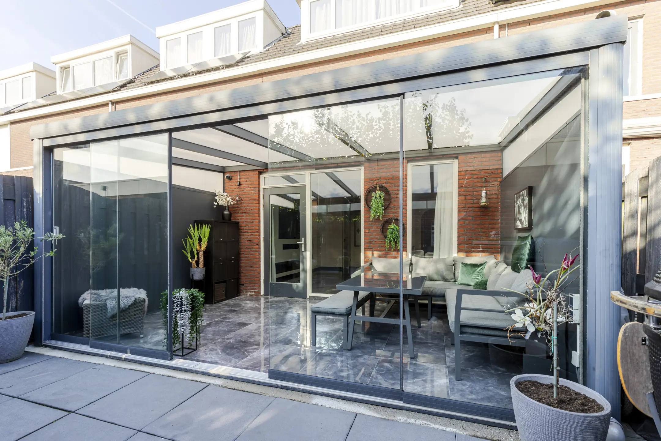 - Serre met glazen wanden, geschikt voor gebruik in alle seizoenen