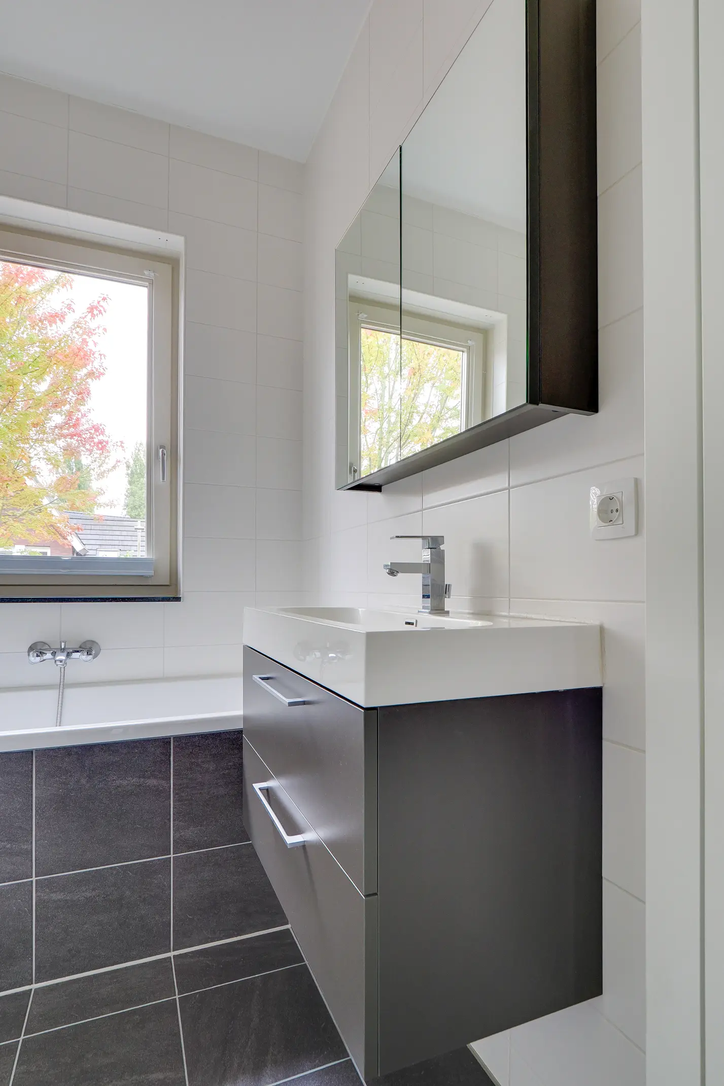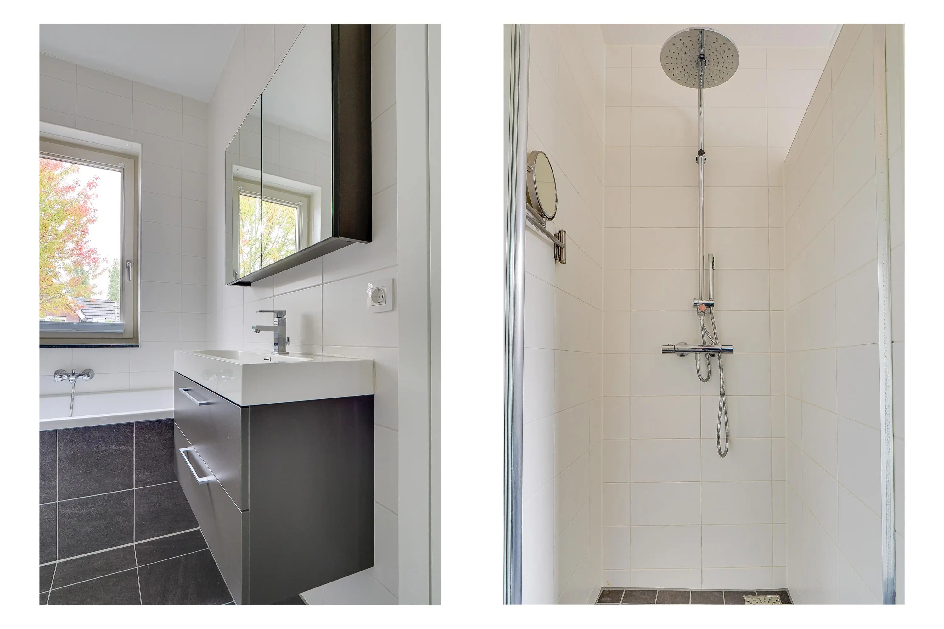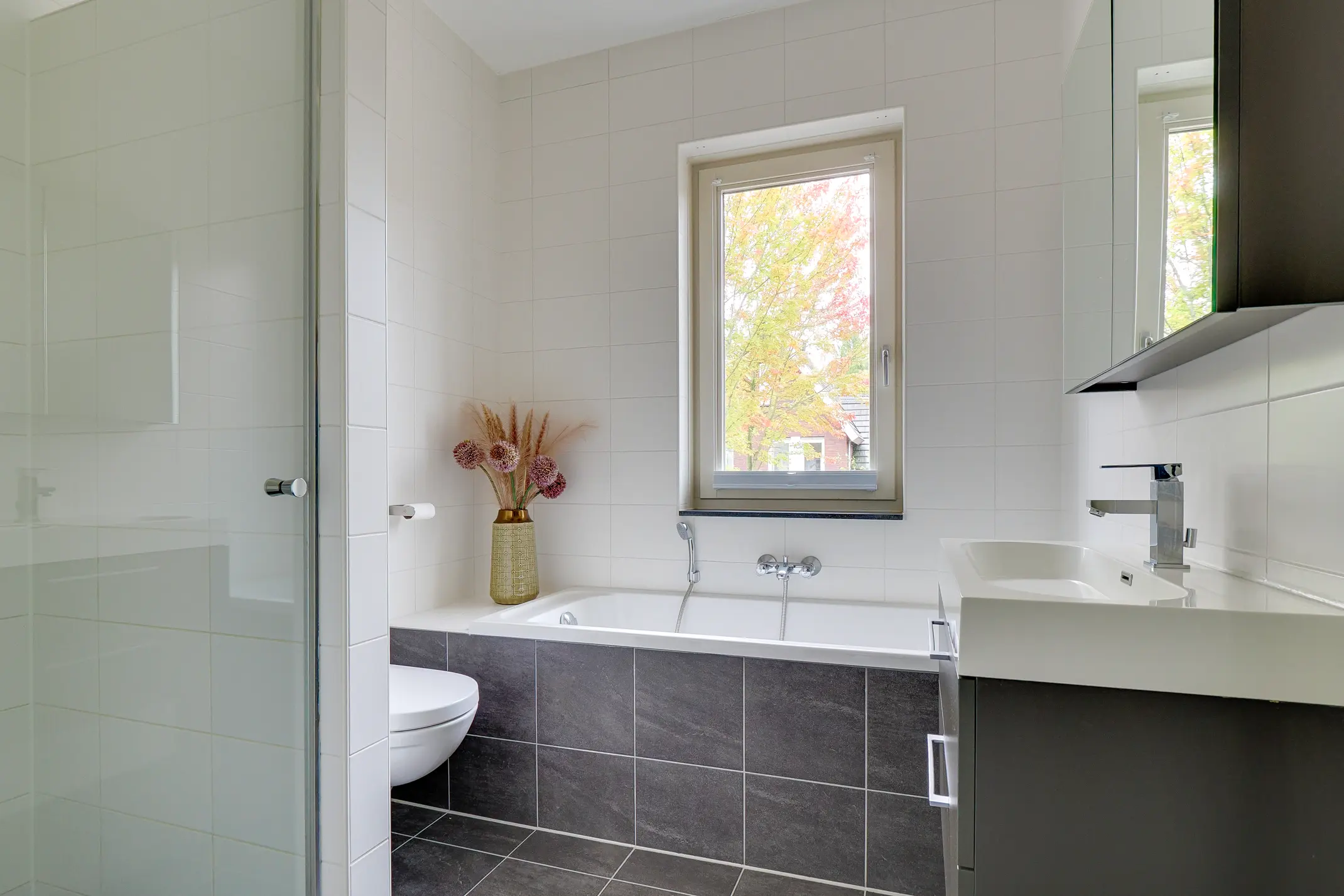 De moderne, goed onderhouden badkamer is uitgerust met een ligbad, inloopdouche, toilet en een stijlvol wastafelmeubel.