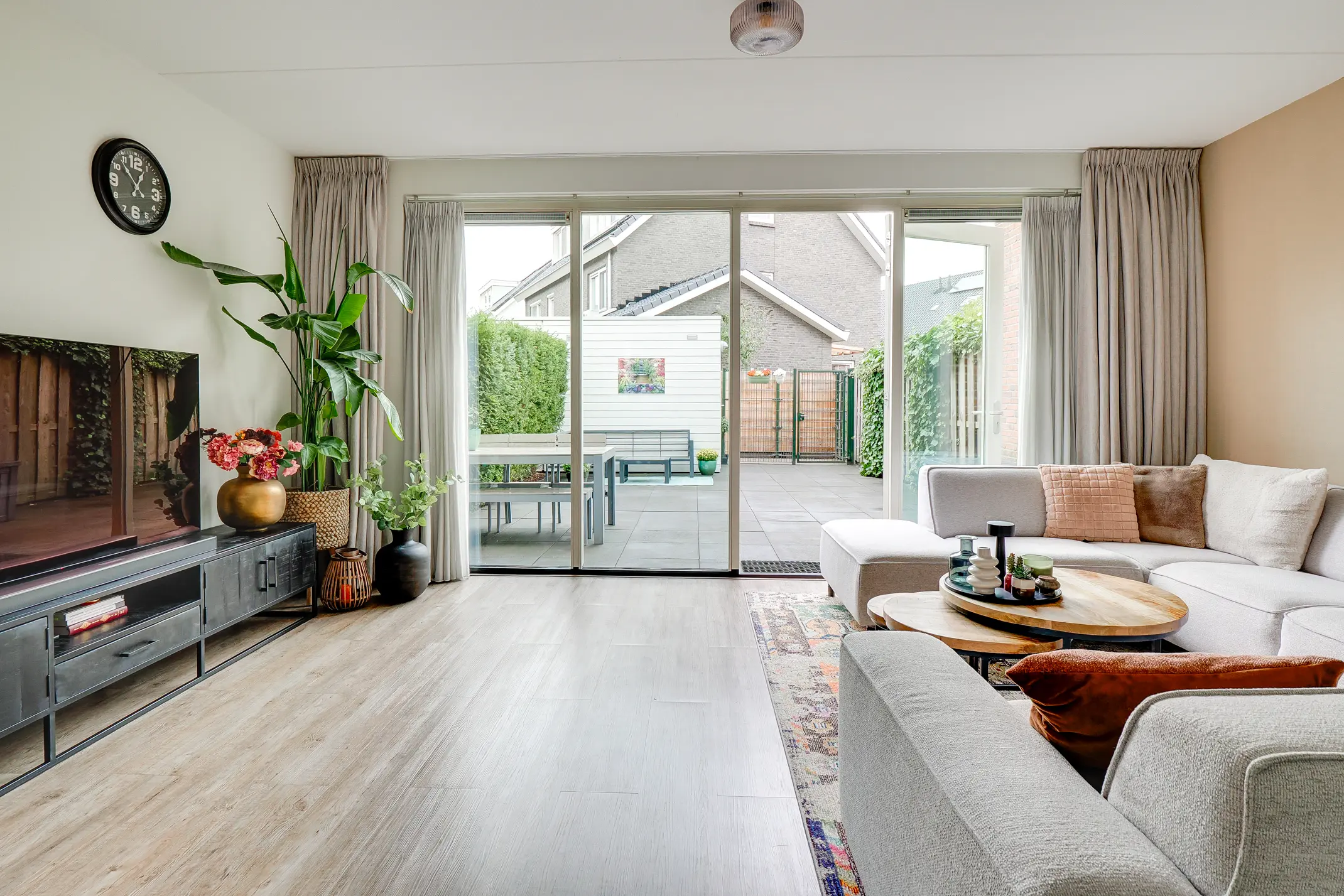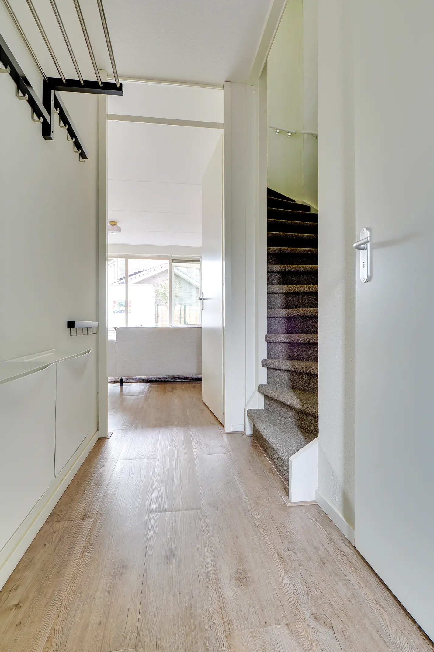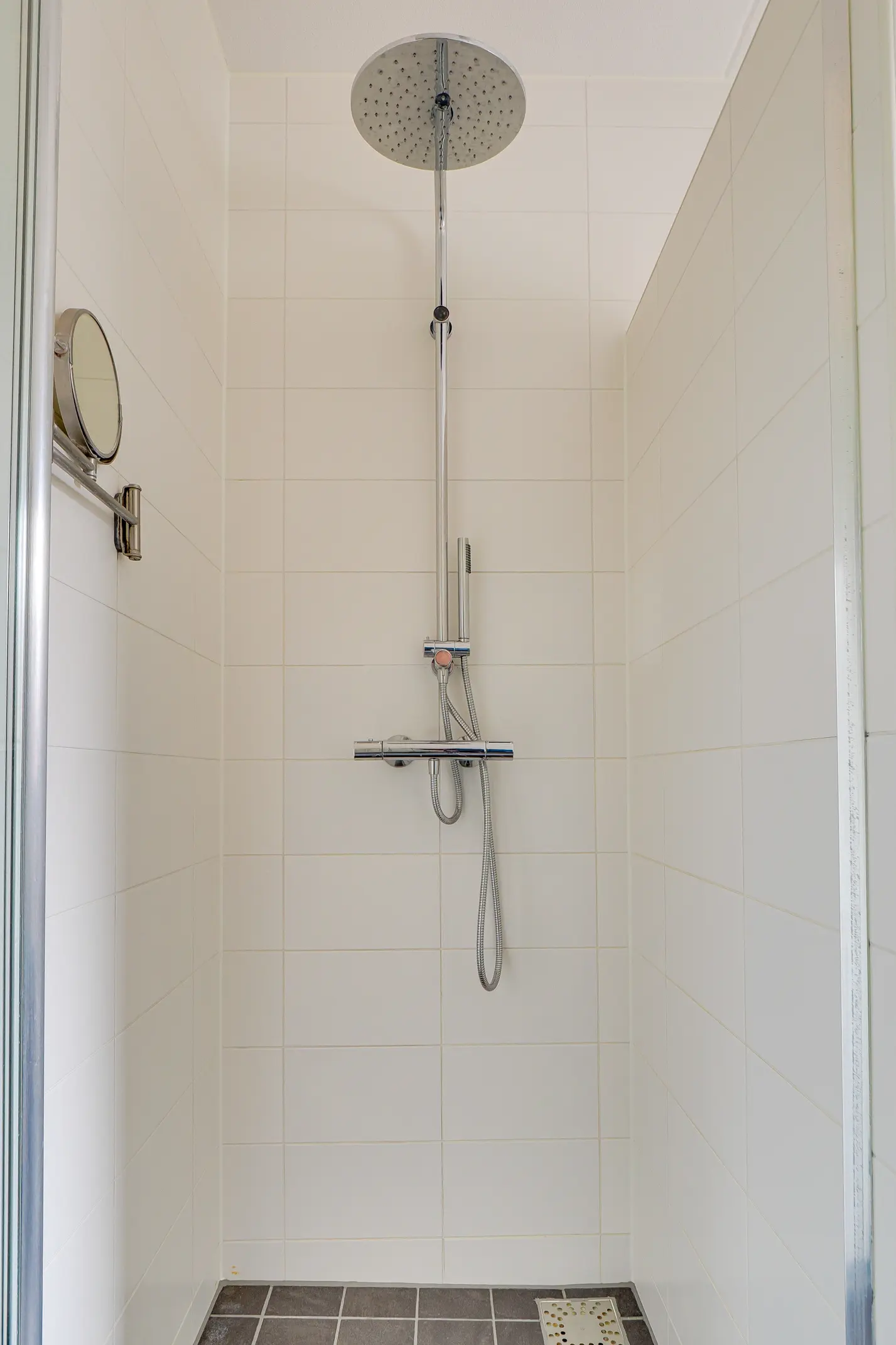 Direct achter de woning ligt het mandelige binnenterrein met een eigen parkeerplaats, zodat je altijd een vaste plek hebt voor de auto. De servicekosten voor het terrein bedragen €130 per jaar. Voor gezinnen is de gezamenlijke speeltuin op dit terrein een groot pluspunt – veilig, overzichtelijk en gezellig voor de kinderen.