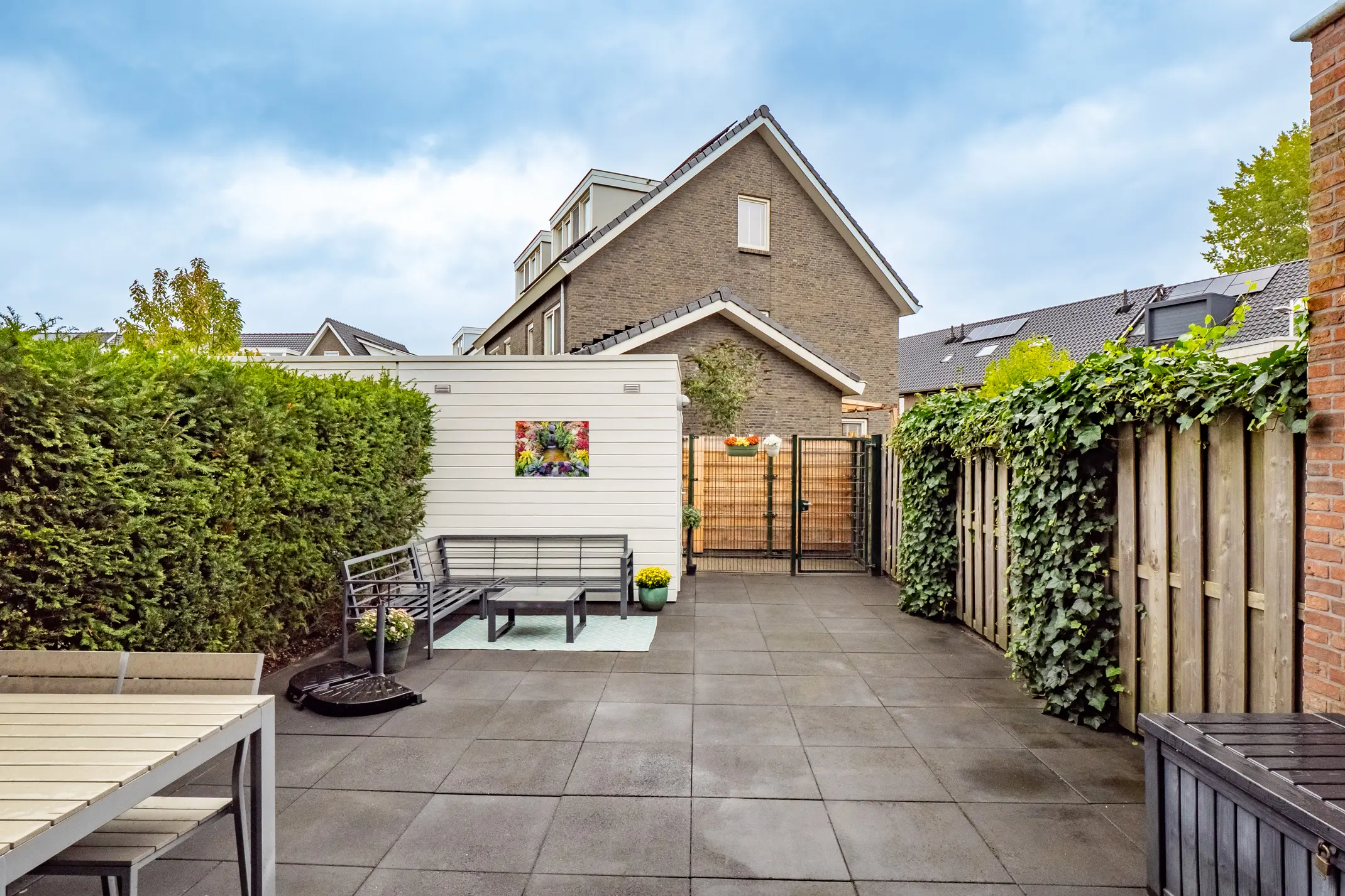 De achtertuin, gelegen op het noordoosten, is met circa 49 m² ruim en verzorgd aangelegd. Hier kun je zowel in de ochtendzon als in de namiddag heerlijk ontspannen. In de tuin staat een vrijstaande houten berging met elektra, ideaal voor fietsen of tuingereedschap.