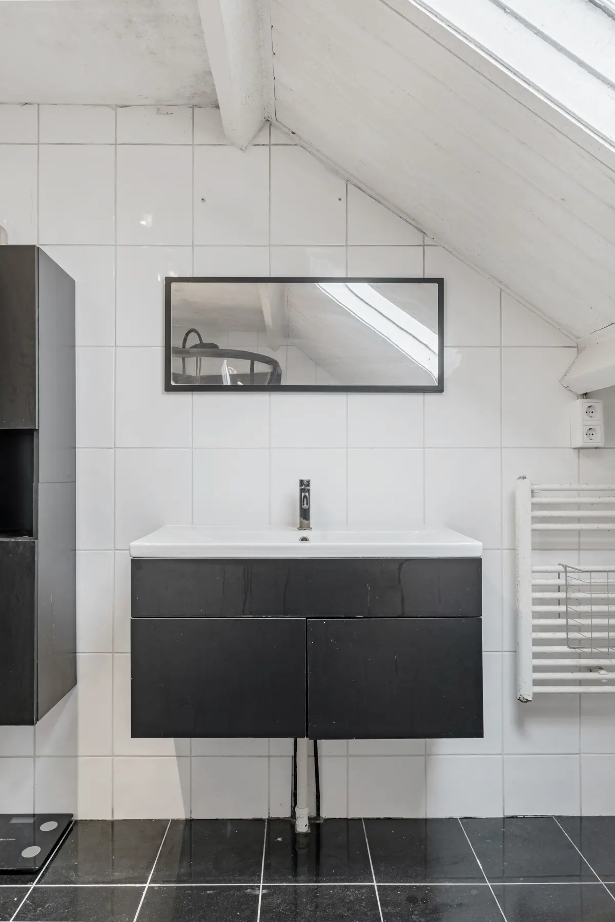 Derde verdieping met royale slaapkamer van circa 26 m² en een complete badkamer met ligbad, douche, wastafel en meubel.