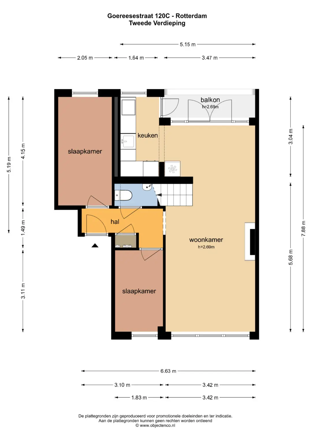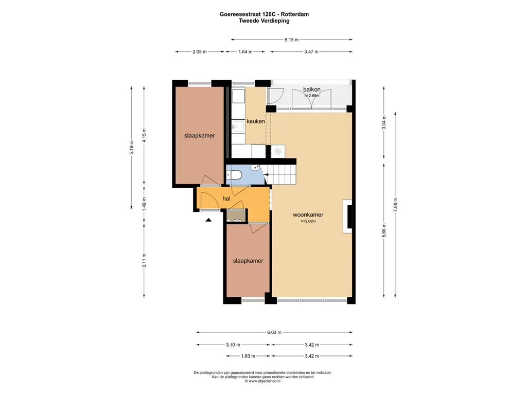 Via het open portiek bereik je de eigen voordeur op de tweede verdieping. Overloop met toilet en toegang tot alle vertrekken. Lichte woonkamer van circa 27 m² over de volledige breedte van de woning. Open keuken met inbouwapparatuur en toegang tot het balkon aan de achterzijde op het oosten. Twee slaapkamers van circa 9 m² en 7 m².