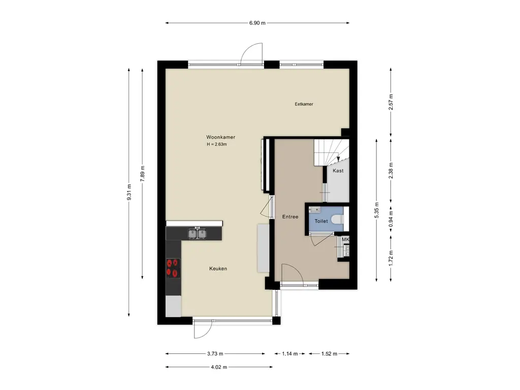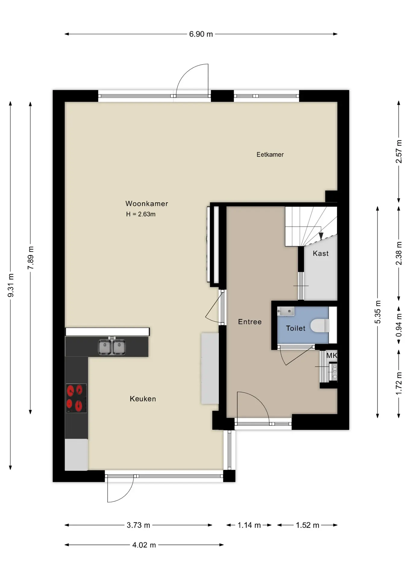 Entree, hal met meterkast en modern toilet (wandcloset met fonteintje). Aan de voorzijde bevindt zich de luxe open keuken met composieten werkblad en hoogwaardige inbouwapparatuur, waaronder een 5-pits inductiekookplaat, combi-oven (o.a. Bosch) en vaatwasser.