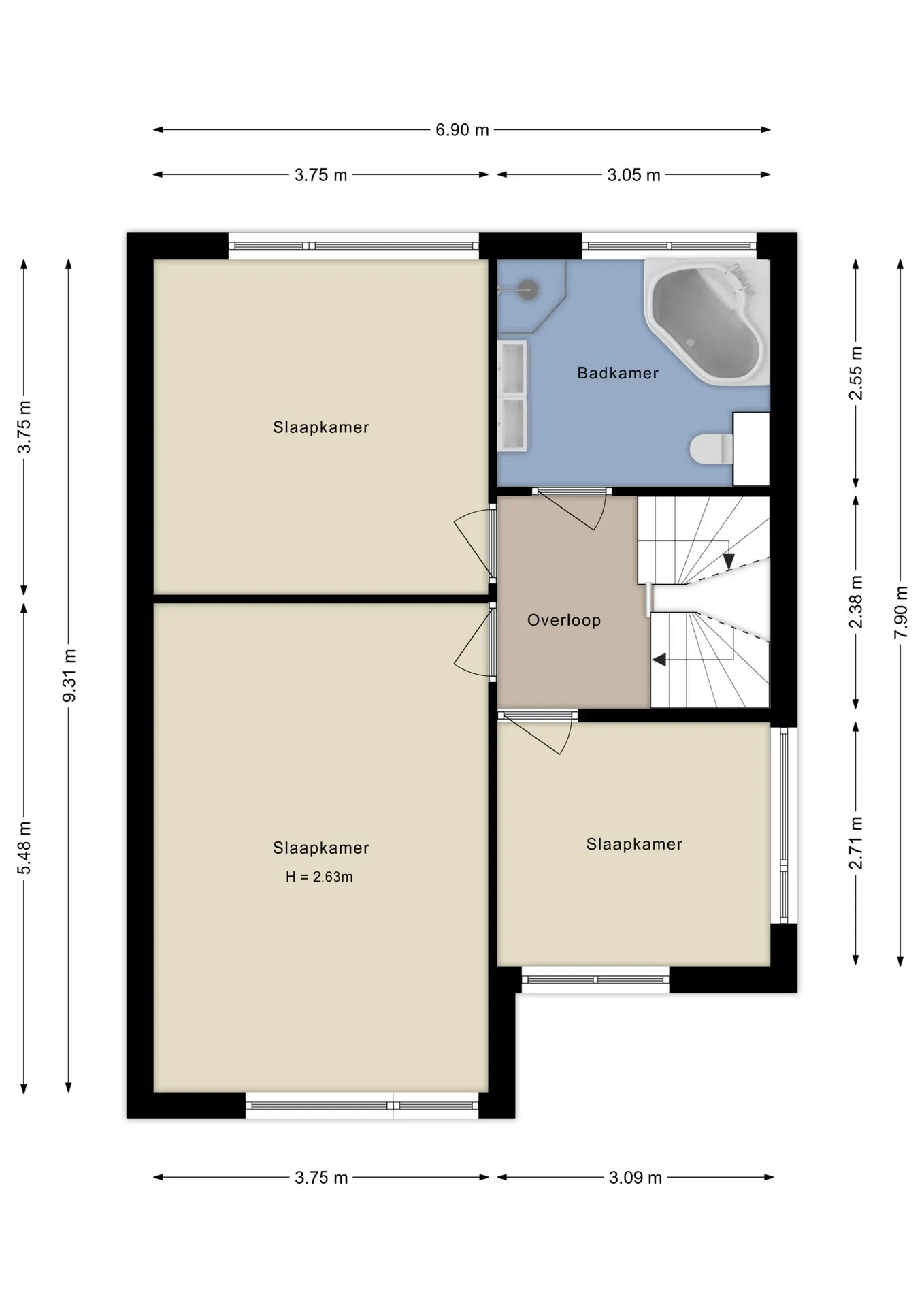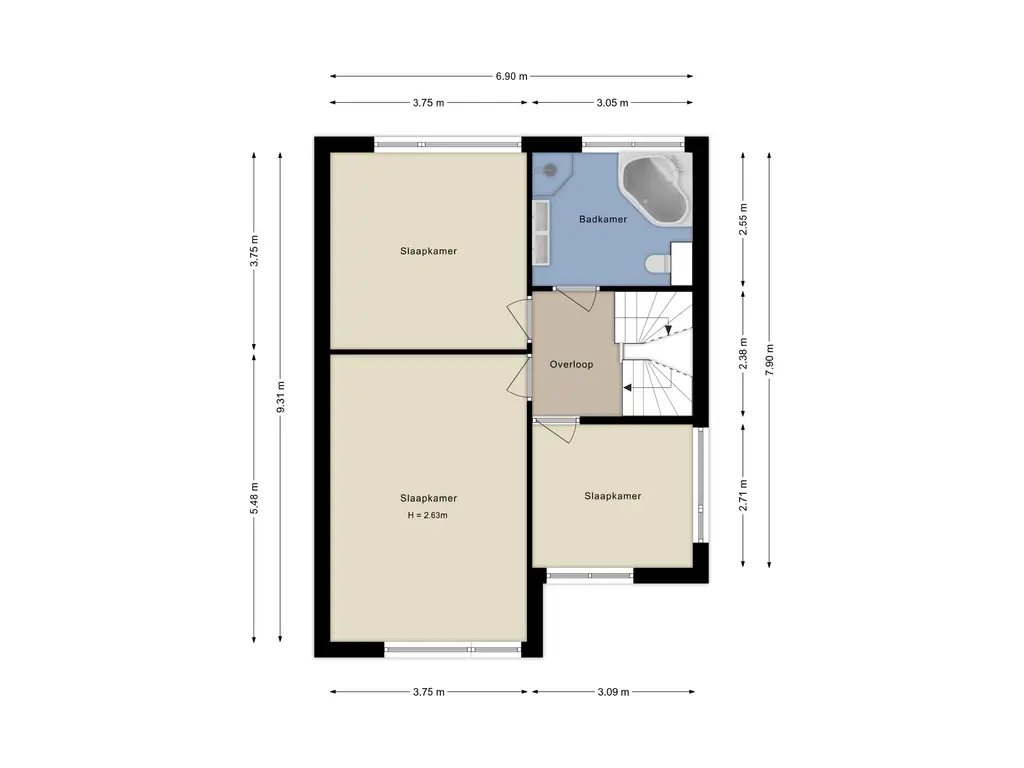 Overloop met toegang tot drie ruime slaapkamers en een luxe, recent vernieuwde badkamer. Deze is compleet uitgerust met een ligbad, inloopdouche, tweede toilet, wastafelmeubel en een raam voor natuurlijke ventilatie.