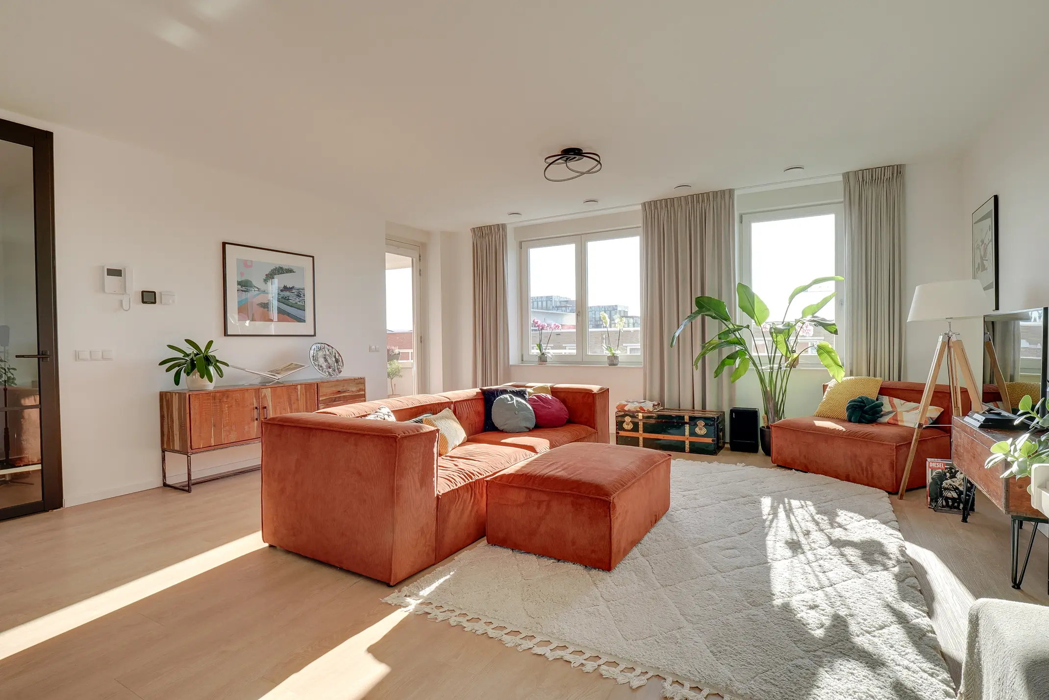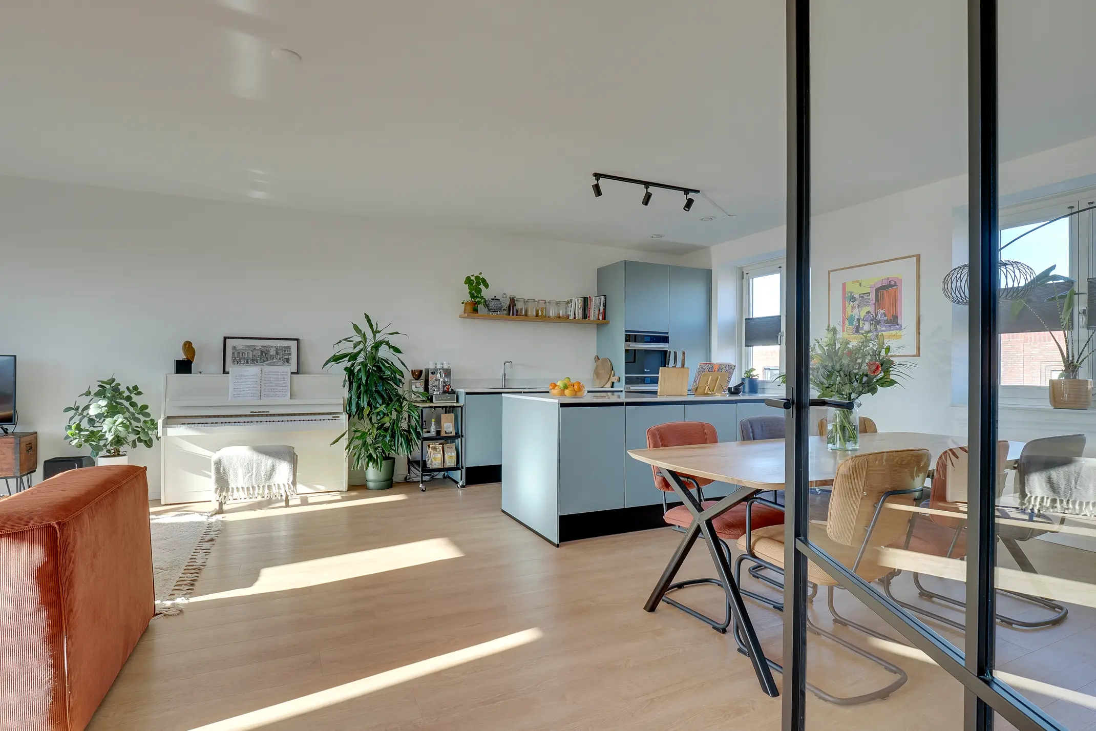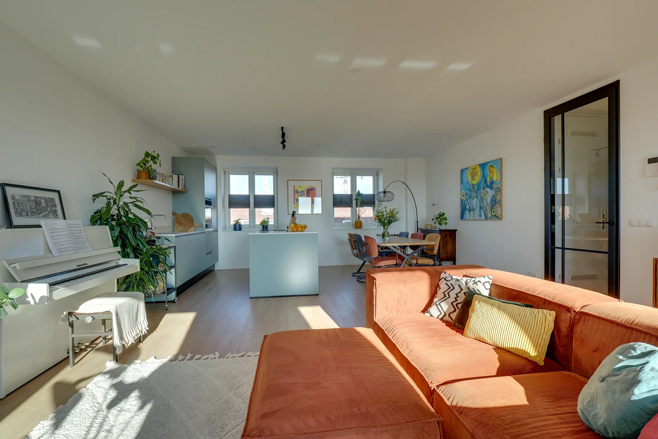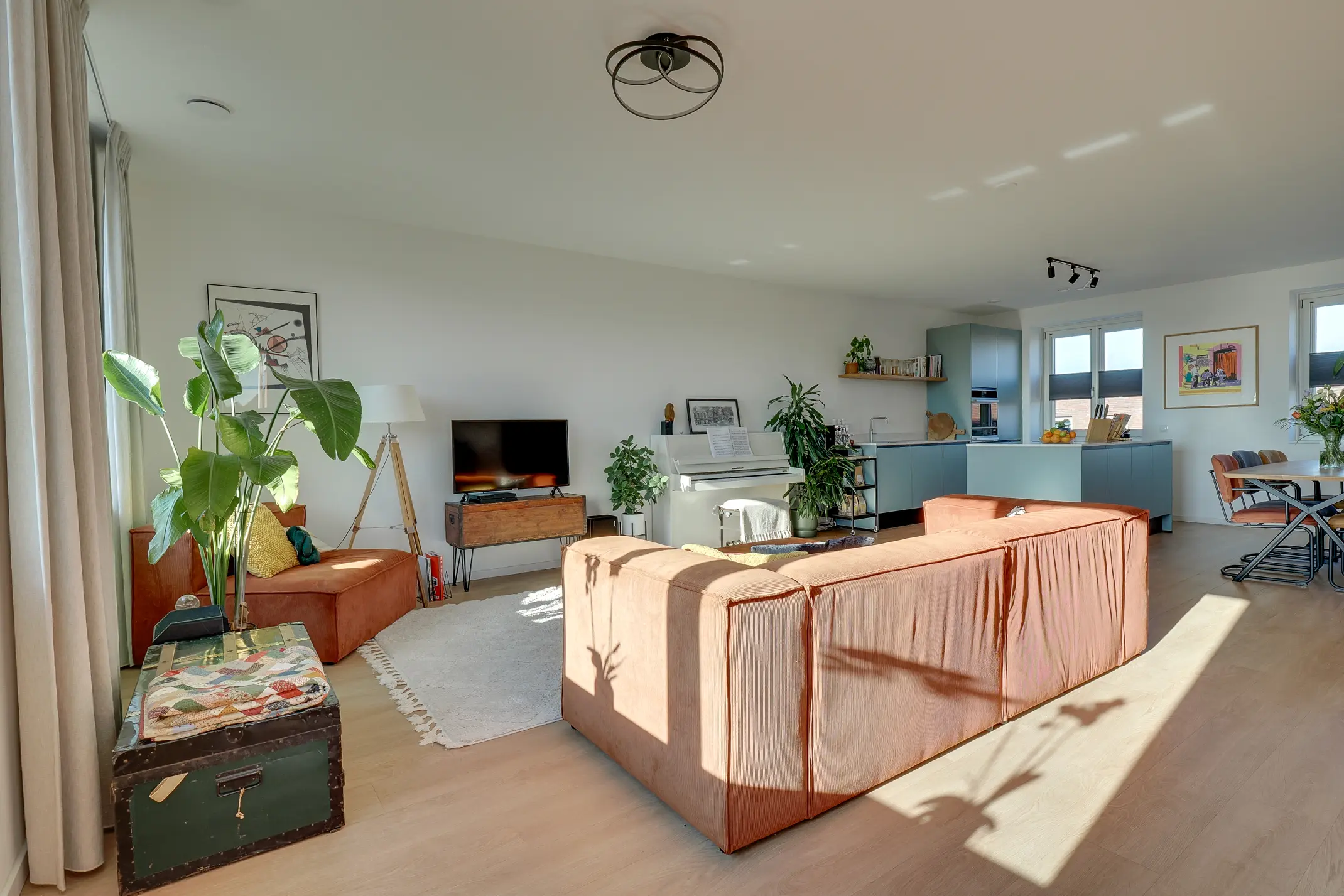 Bij binnenkomst valt meteen de hoge kwaliteit van afwerking op. De royale woonkamer van circa 52 m² vormt het hart van de woning: een heerlijke, lichte leefruimte met grote raampartijen en een open verbinding naar de keuken. De keuken is luxe uitgevoerd met hoogwaardige apparatuur, waaronder een Quooker, stoomoven en combimagnetron. Dankzij de slimme indeling is er veel werkruimte en voldoende kastruimte aanwezig. Vanuit de woonkamer stap je via een deur het balkon van ongeveer 7 m² op, waar je op zonnige momenten heerlijk kunt zitten en uitkijkt over de rustige omgeving.