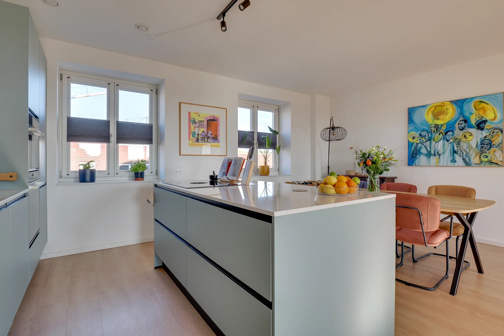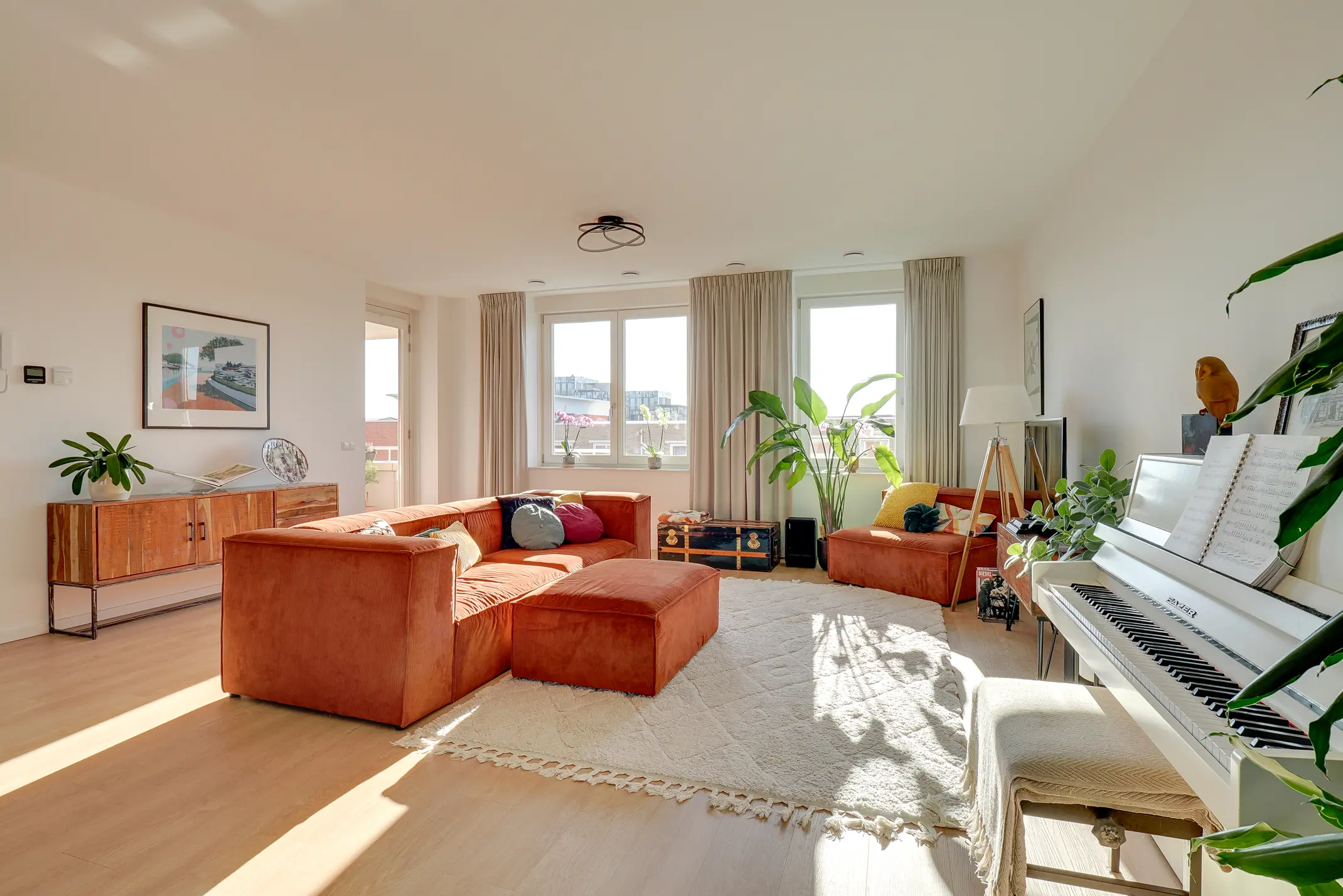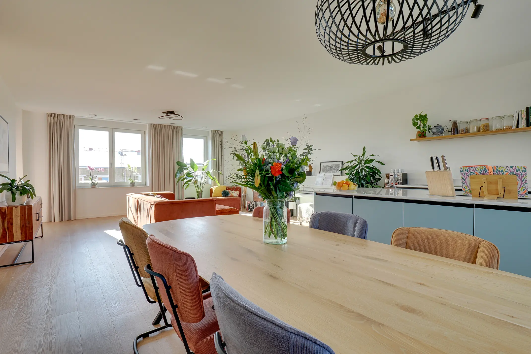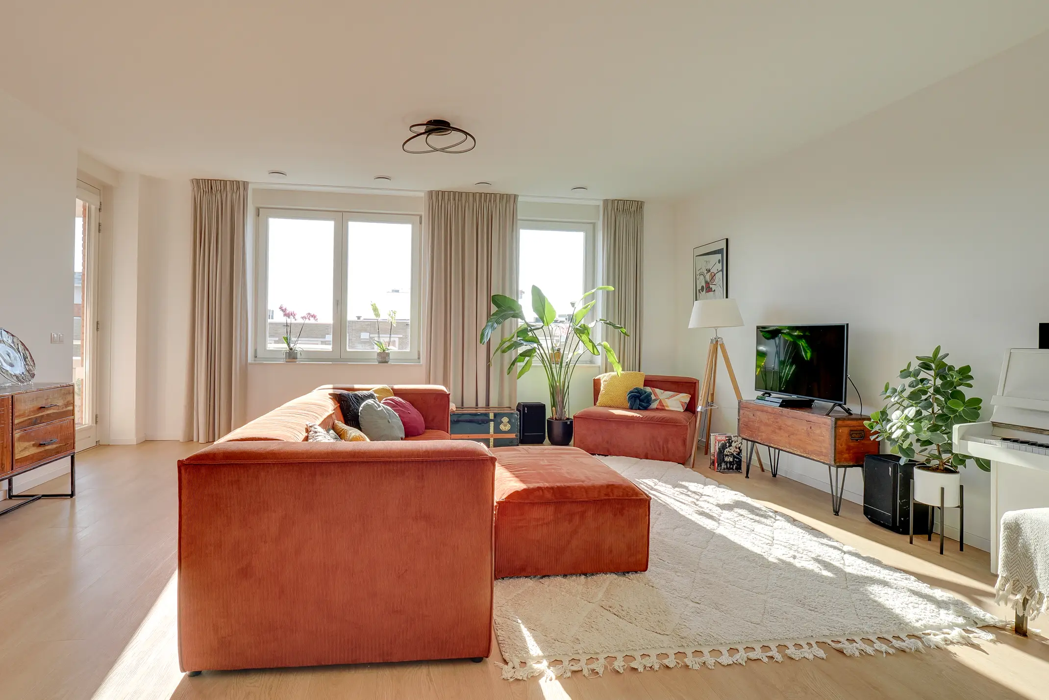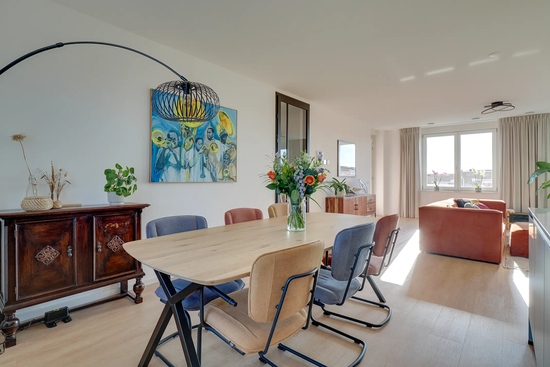 Bij binnenkomst valt meteen de hoge kwaliteit van afwerking op. De royale woonkamer van circa 52 m² vormt het hart van de woning: een heerlijke, lichte leefruimte met grote raampartijen en een open verbinding naar de keuken. De keuken is luxe uitgevoerd met hoogwaardige apparatuur, waaronder een Quooker, stoomoven en combimagnetron. Dankzij de slimme indeling is er veel werkruimte en voldoende kastruimte aanwezig. Vanuit de woonkamer stap je via een deur het balkon van ongeveer 7 m² op, waar je op zonnige momenten heerlijk kunt zitten en uitkijkt over de rustige omgeving.