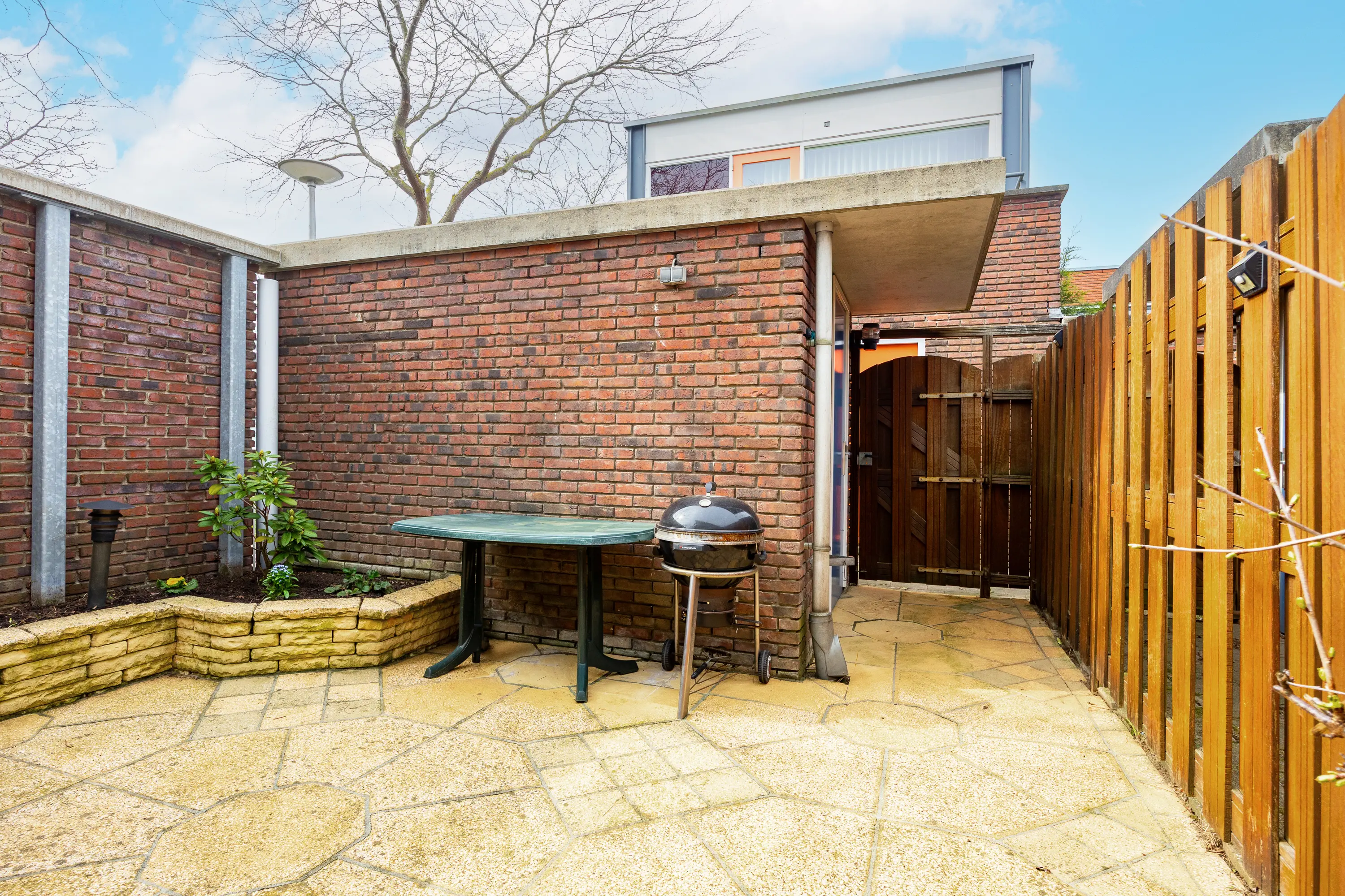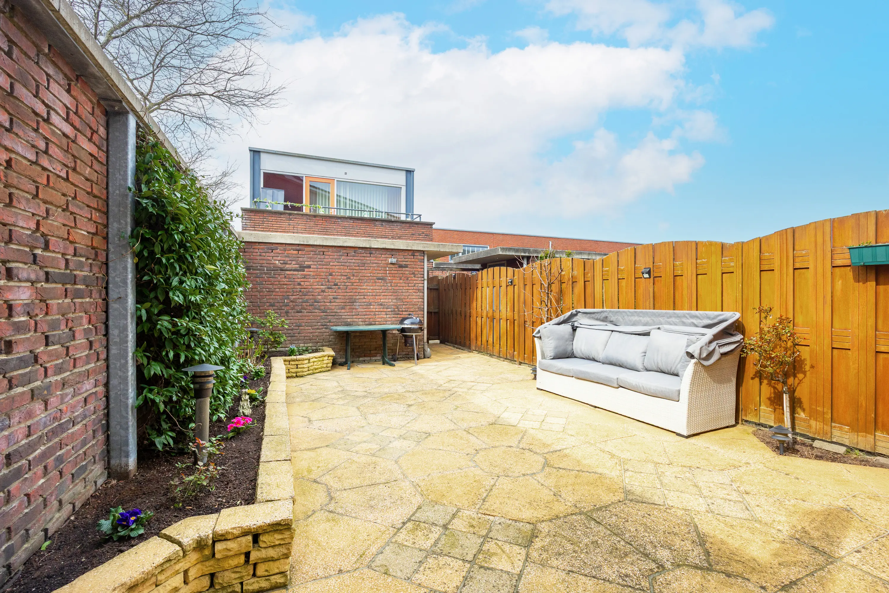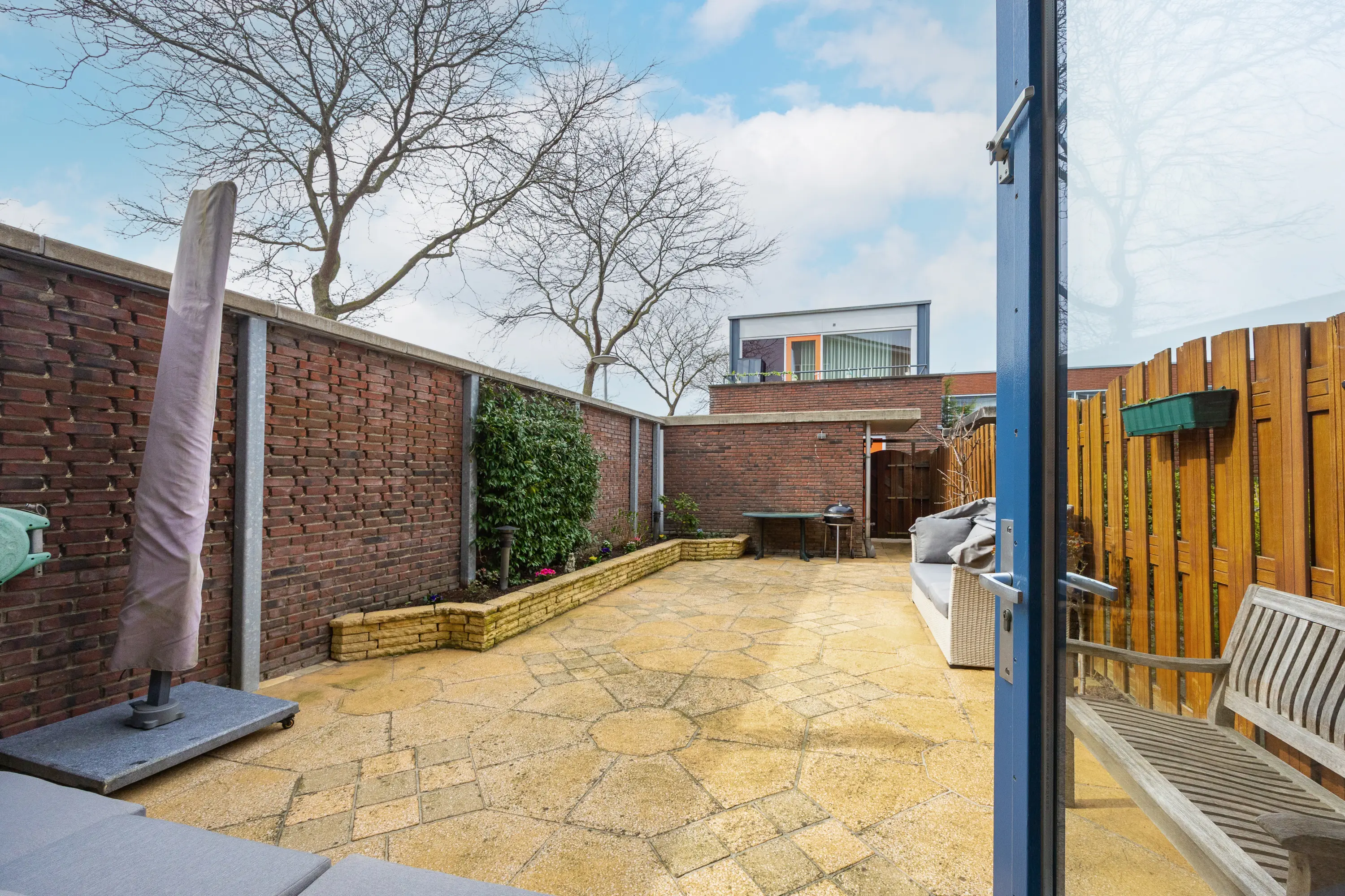 De achtertuin is licht en ruim opgezet, waardoor je hier optimaal van de zon kunt genieten. Een fijne plek voor een lange lunch, een gezellige borrel of gewoon om even tot rust te komen. De vrijstaande berging (ca. 8 m²) biedt voldoende ruimte voor fietsen en opslag.