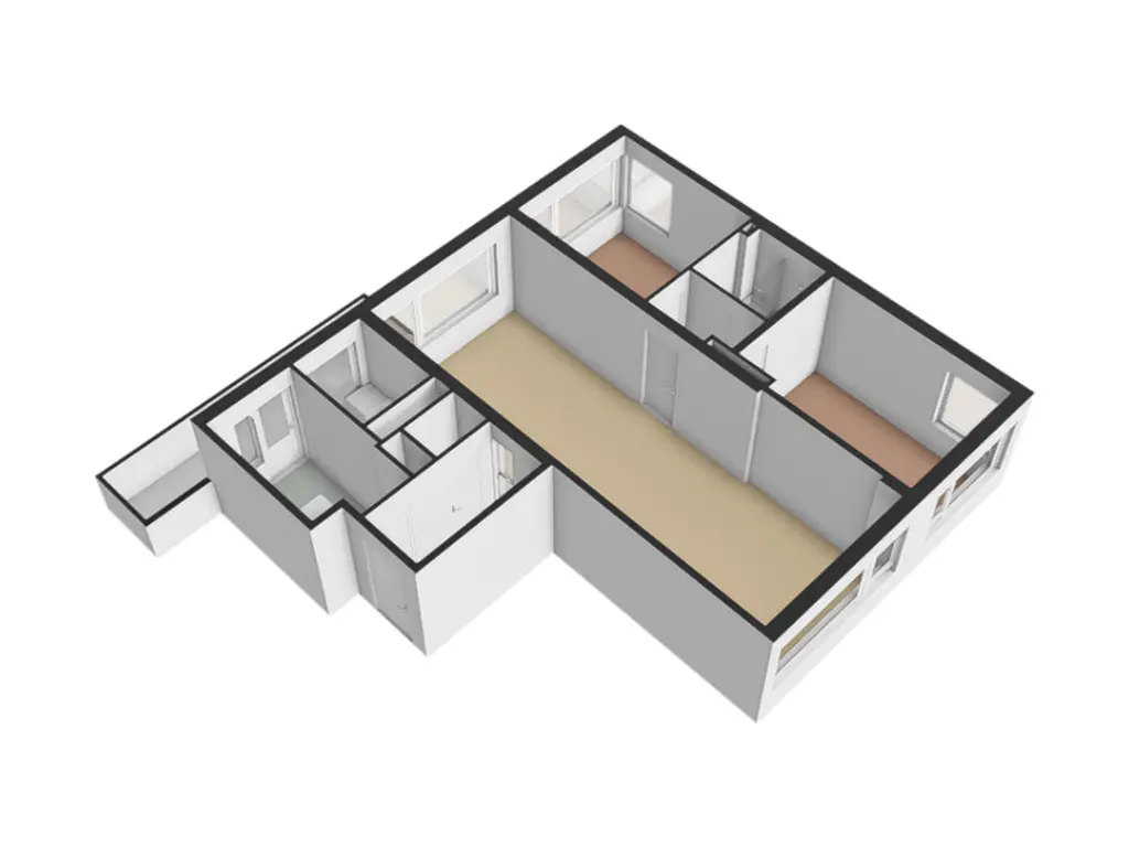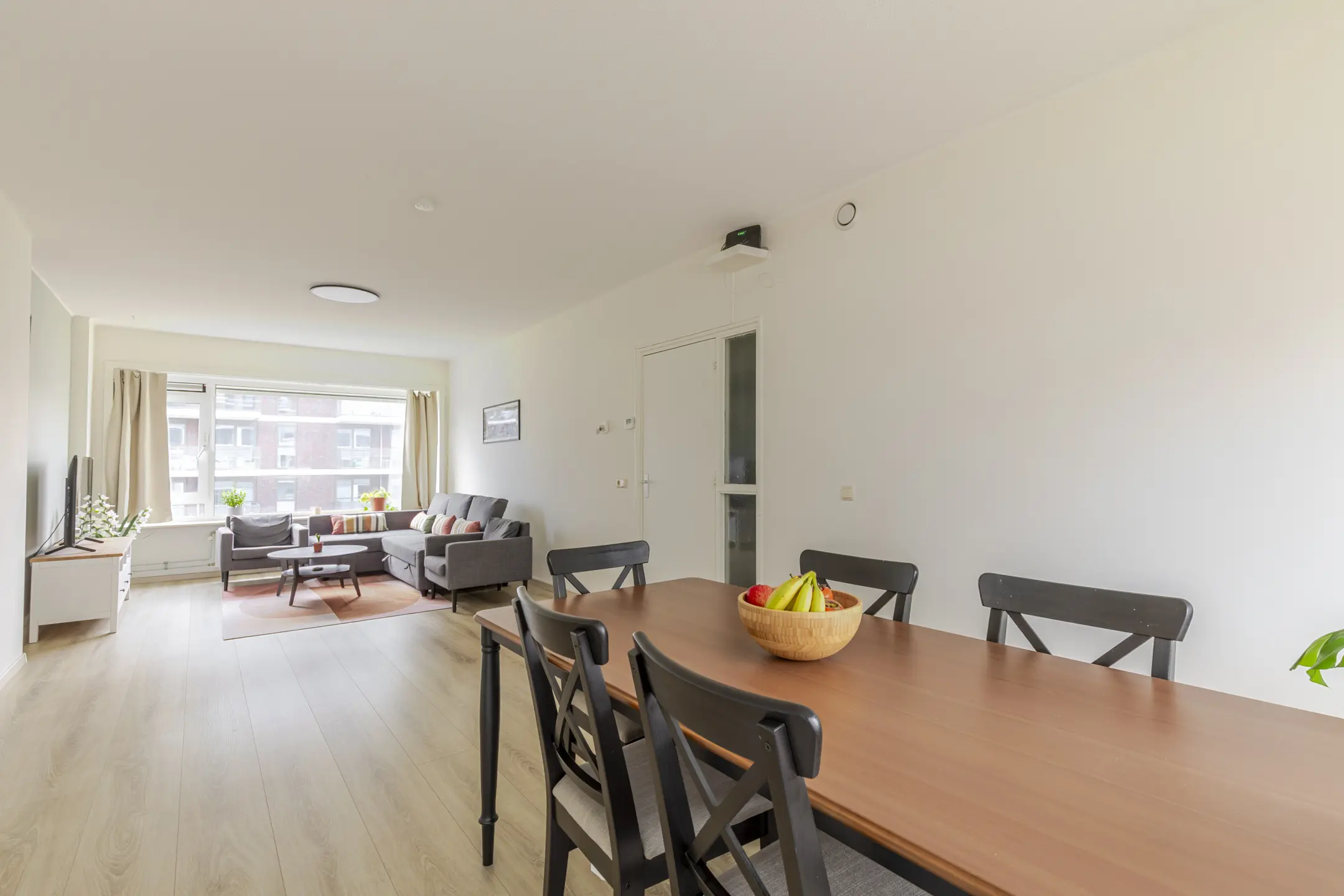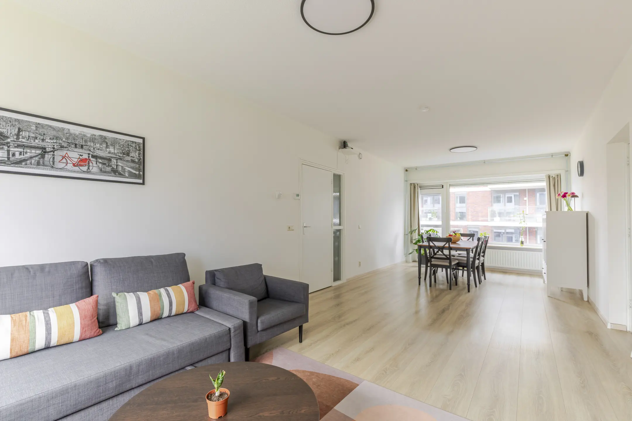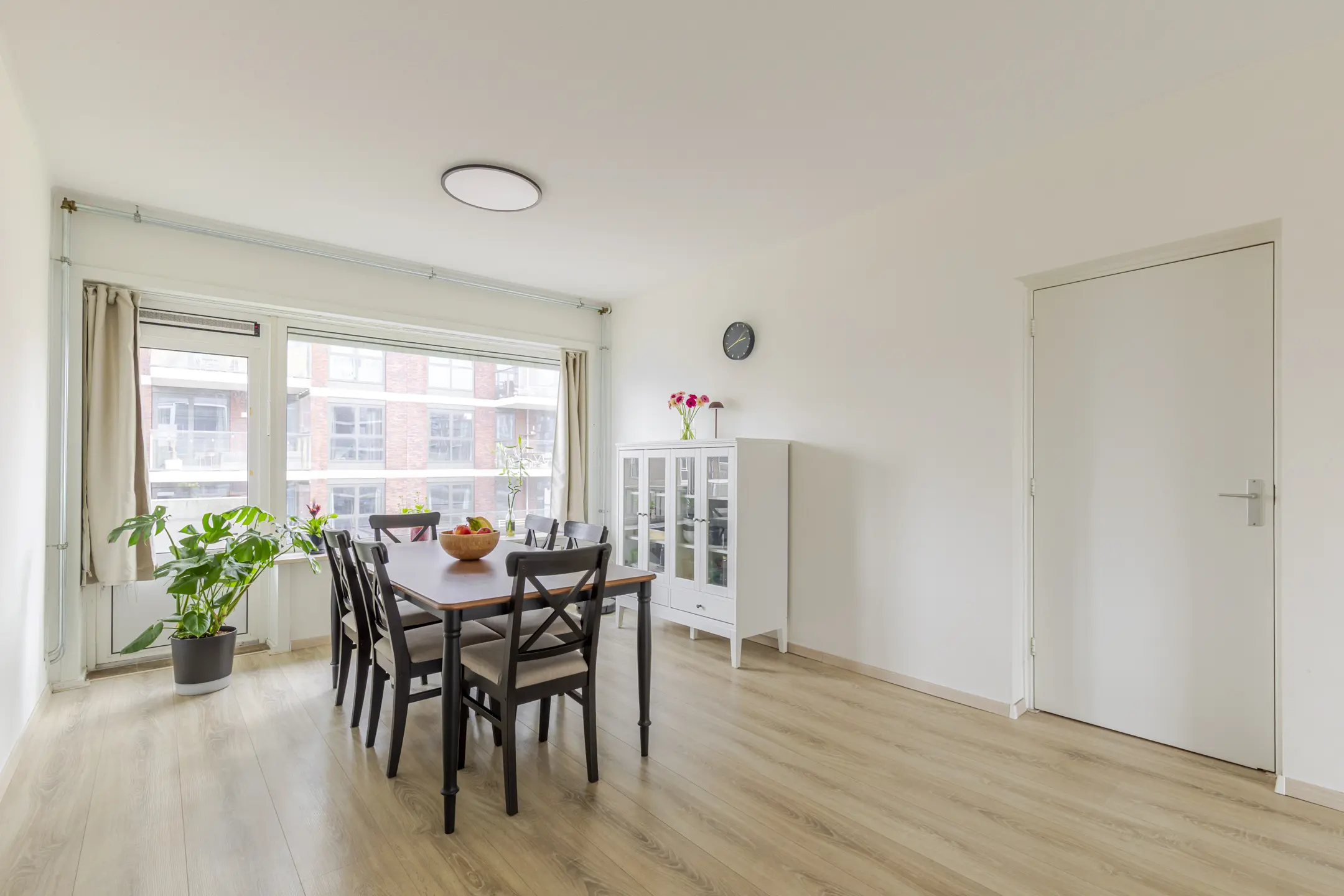 Derde verdieping: Bij binnenkomst geeft de hal toegang tot meerdere kamers. De ruime woonkamer van circa 32 m² vormt het hart van het appartement en biedt voldoende ruimte voor zowel een zit- als een eethoek. Dankzij de noord- en oostoriëntatie geniet de woonkamer de hele dag van aangenaam natuurlijk licht.