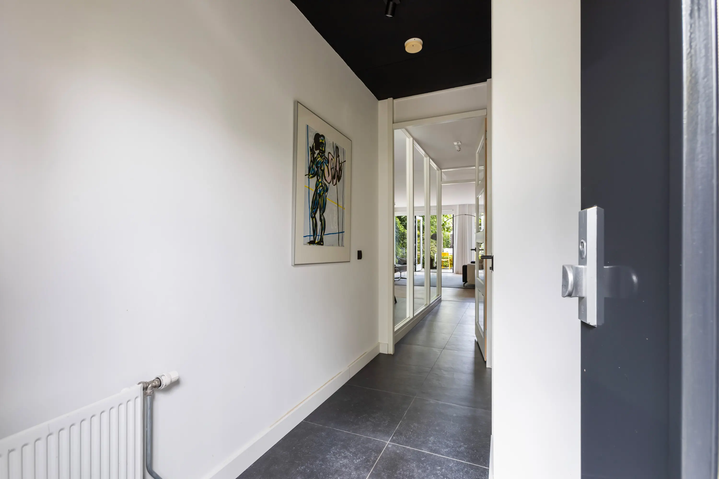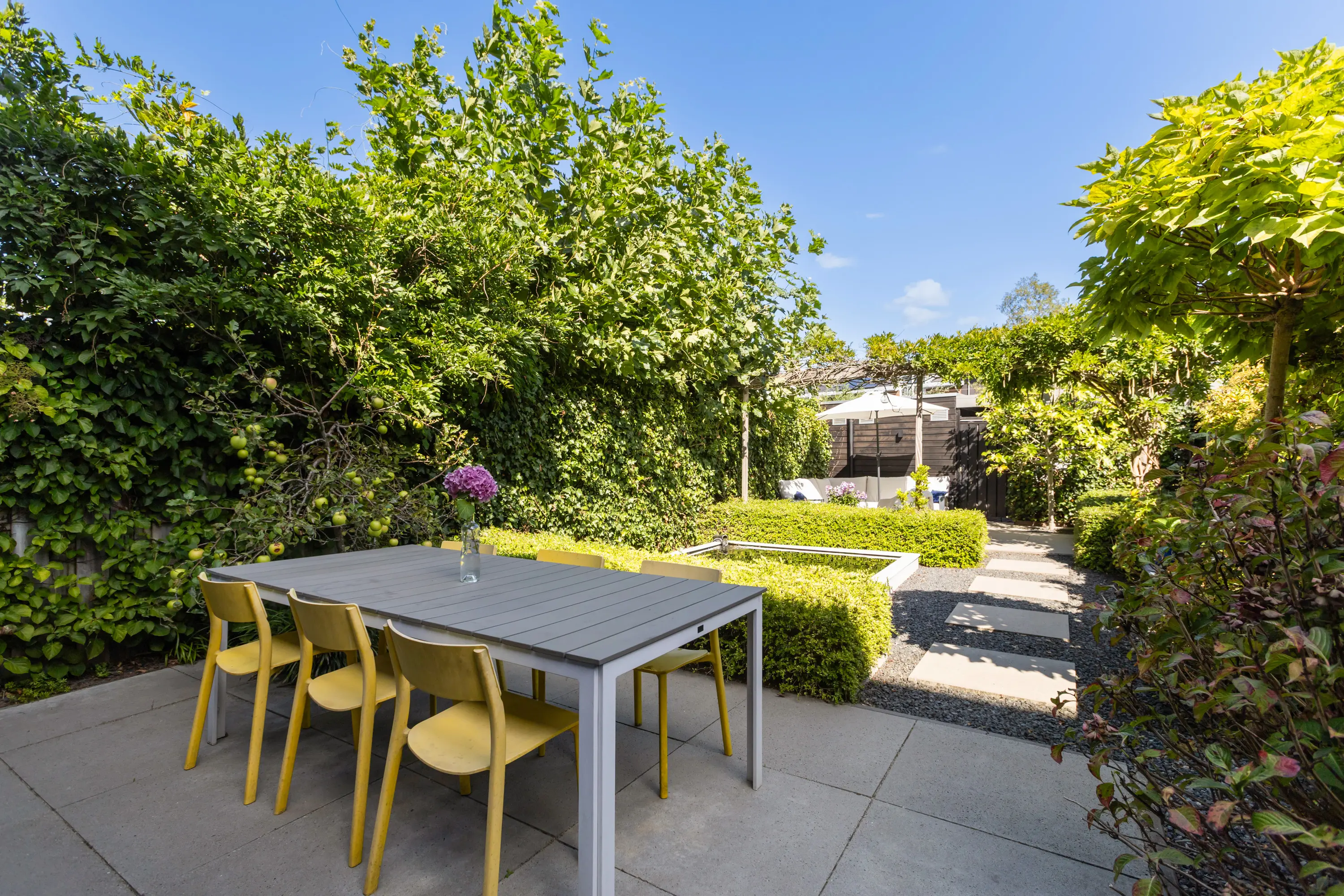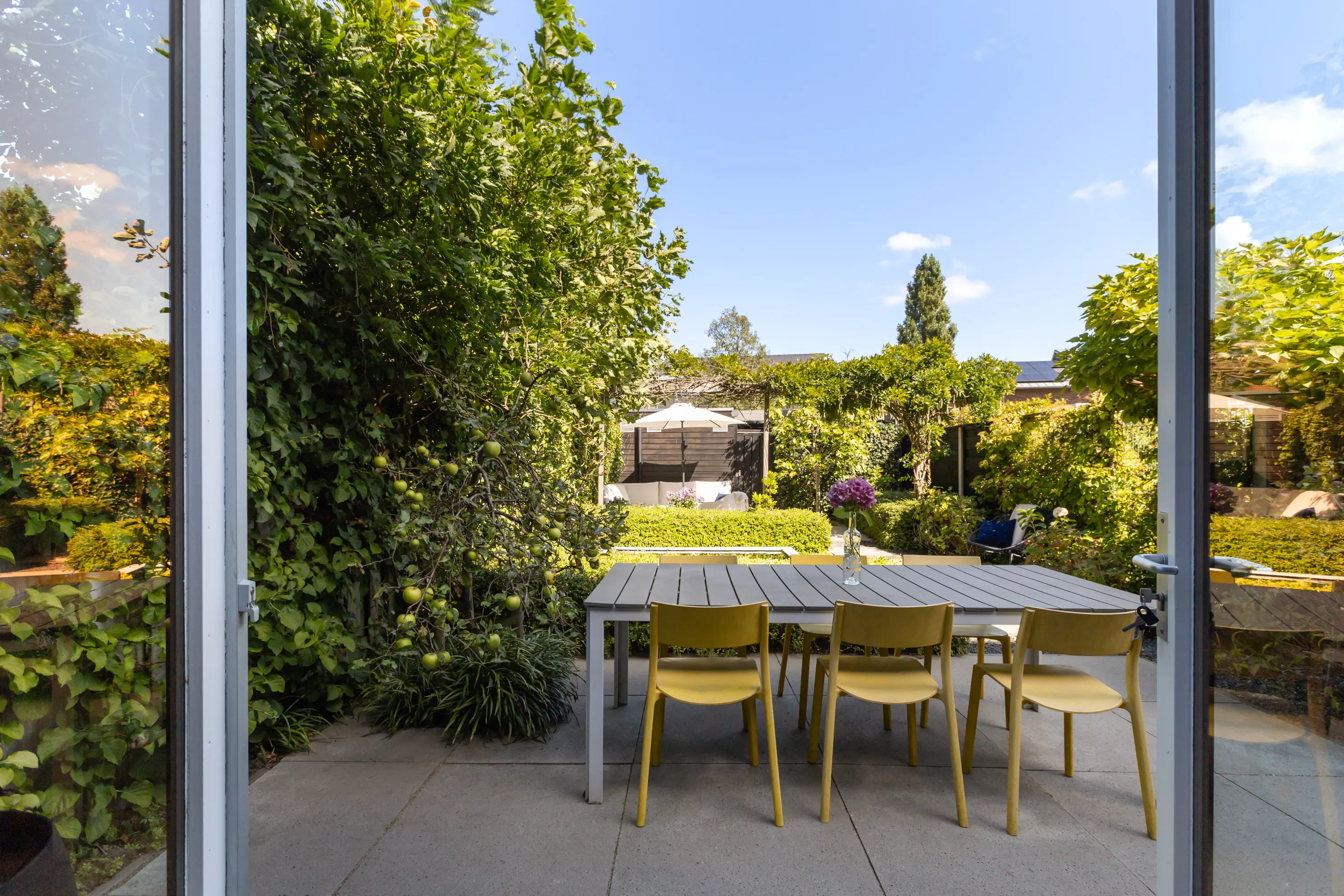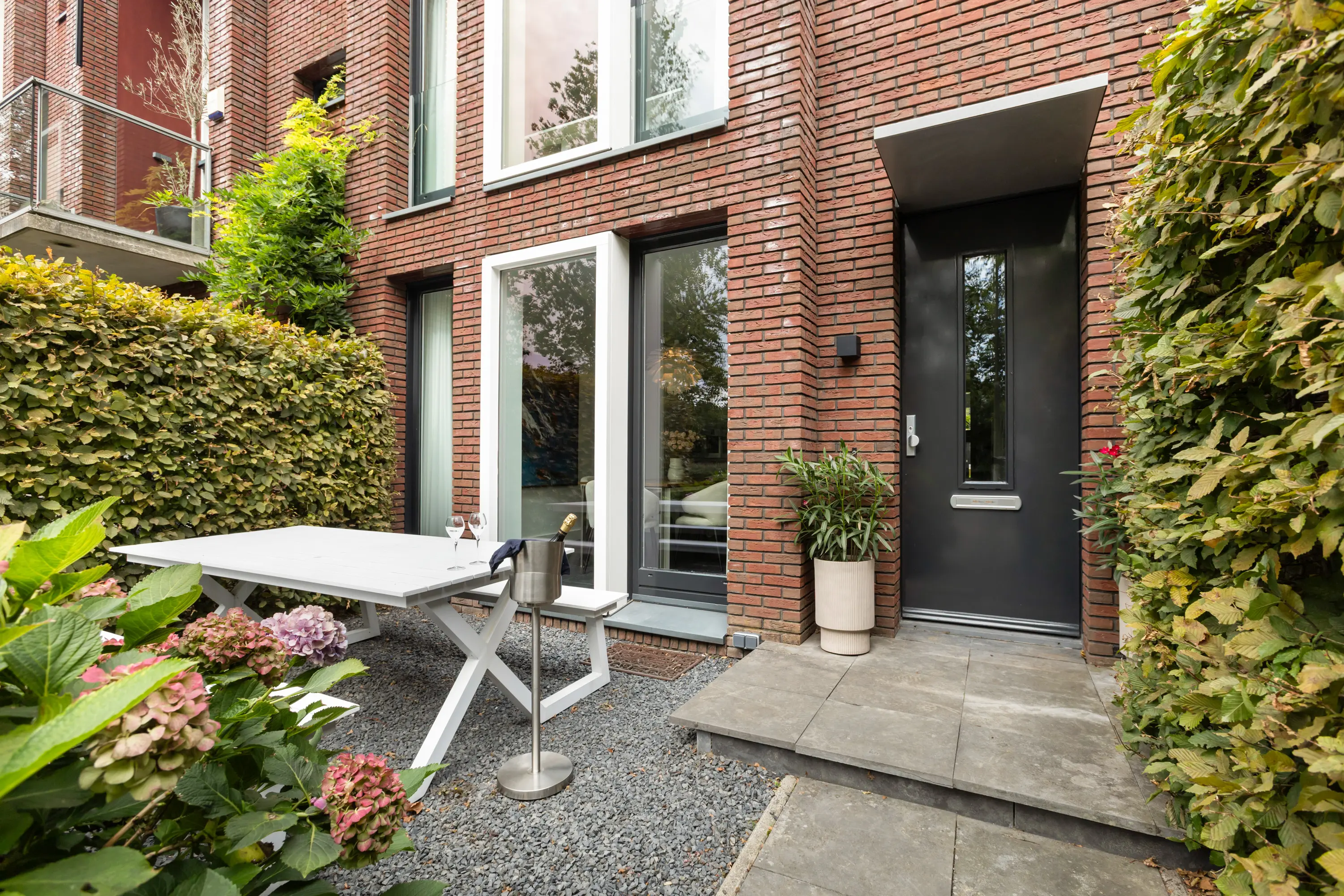 Via de verzorgde voortuin stap je de woning binnen. In de ruime hal vind je de meterkast, garderobe en een modern toilet met fontein. De lichte, tuingerichte woonkamer (ca. 44 m²) heeft grote ramen en openslaande deuren naar de achtertuin, waardoor binnen en buiten mooi in elkaar overlopen. Aan de voorzijde ligt de luxe open keuken met inbouwapparatuur, veel kastruimte en een prettig werkblad. Hier heb je ook direct toegang tot de voortuin.