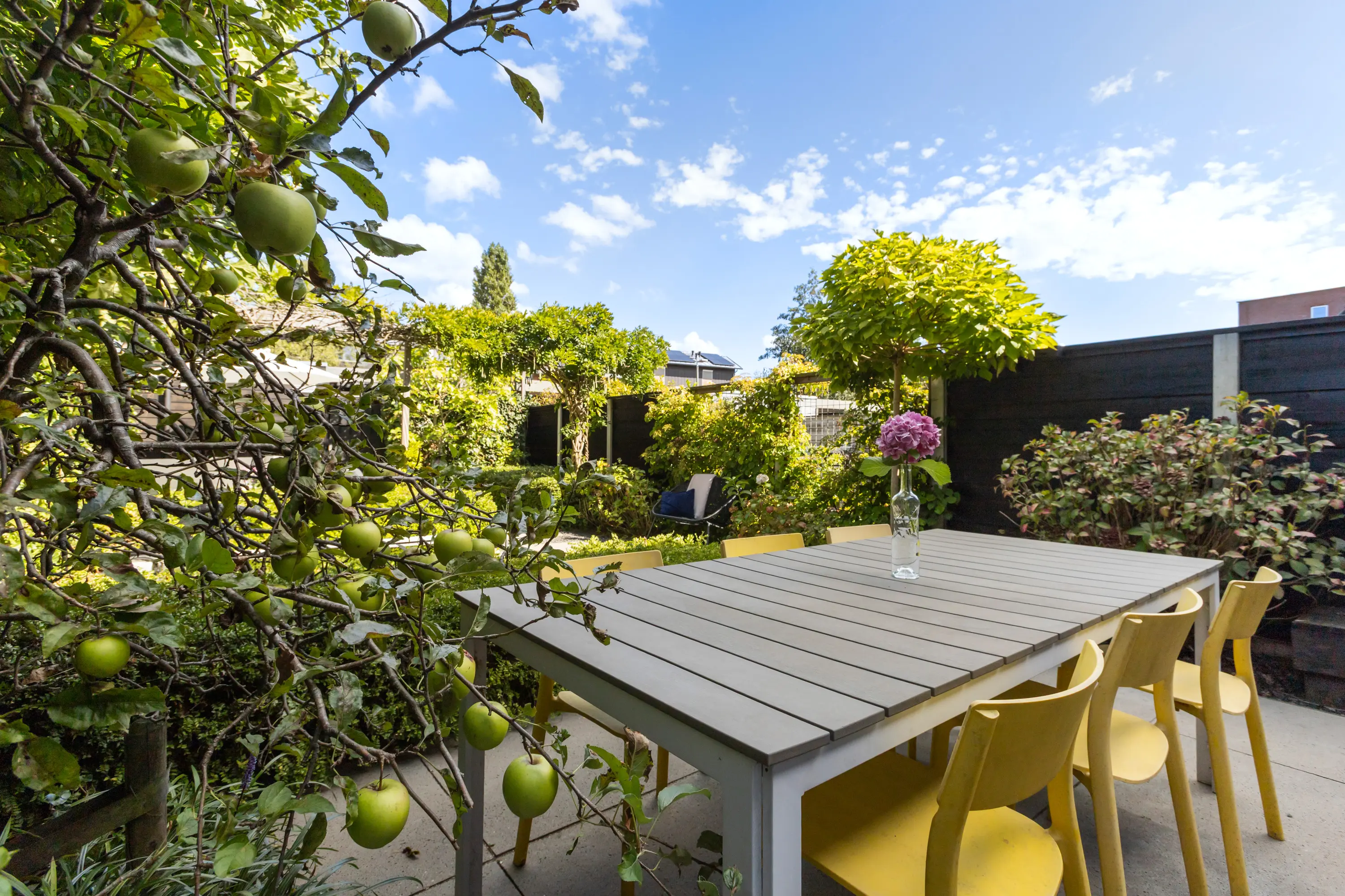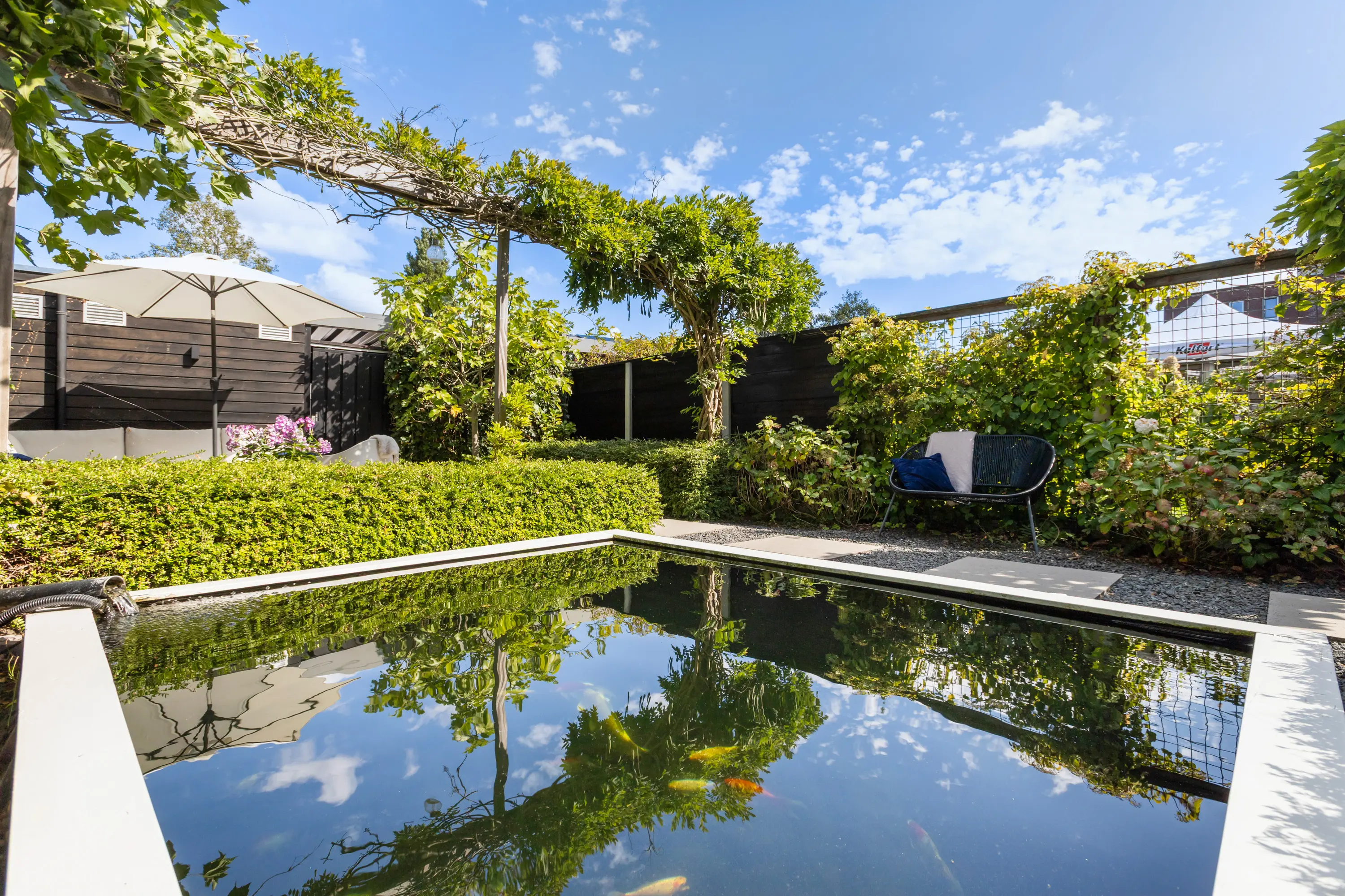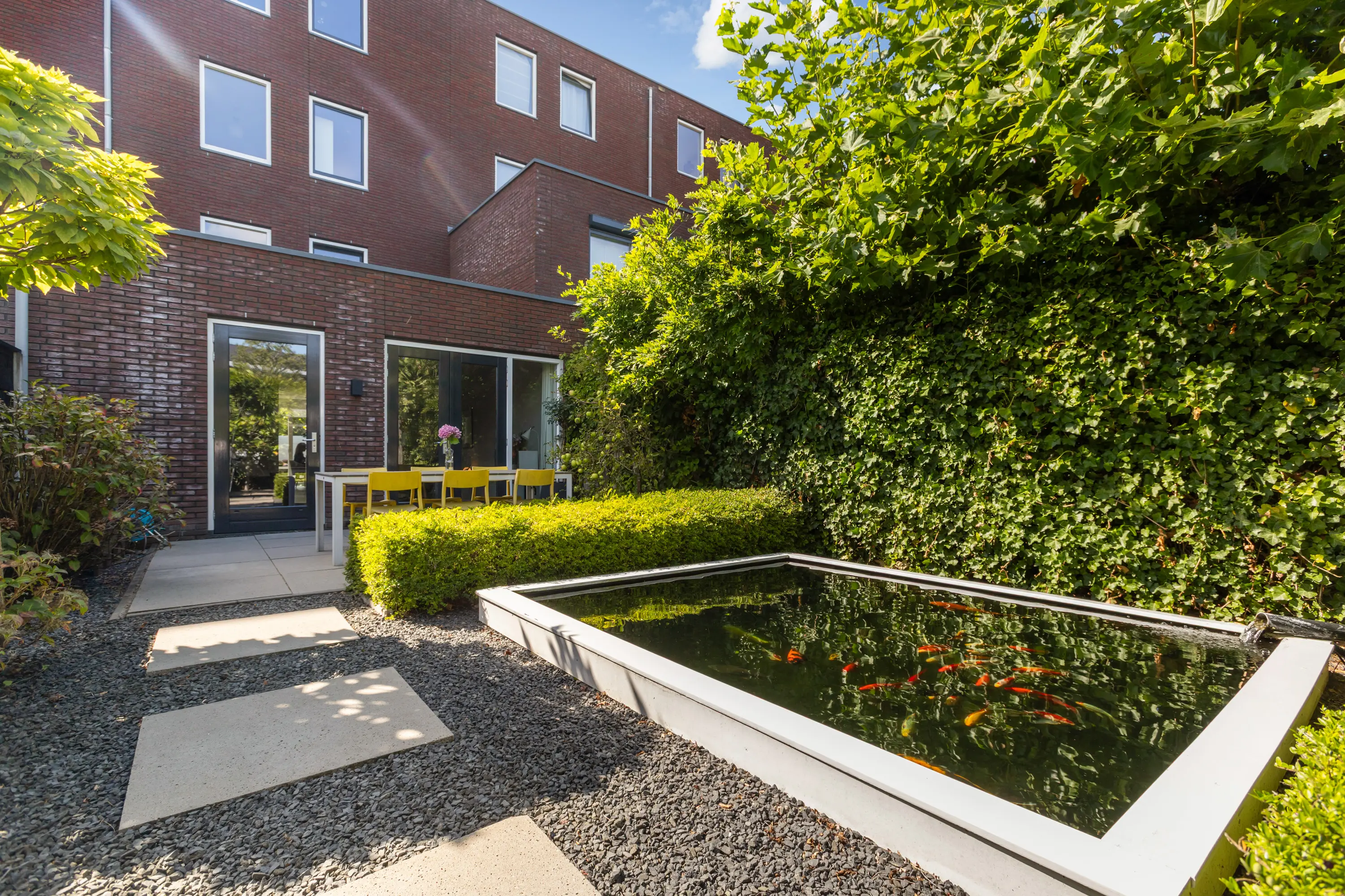 Via de verzorgde voortuin stap je de woning binnen. In de ruime hal vind je de meterkast, garderobe en een modern toilet met fontein. De lichte, tuingerichte woonkamer (ca. 44 m²) heeft grote ramen en openslaande deuren naar de achtertuin, waardoor binnen en buiten mooi in elkaar overlopen. Aan de voorzijde ligt de luxe open keuken met inbouwapparatuur, veel kastruimte en een prettig werkblad. Hier heb je ook direct toegang tot de voortuin.