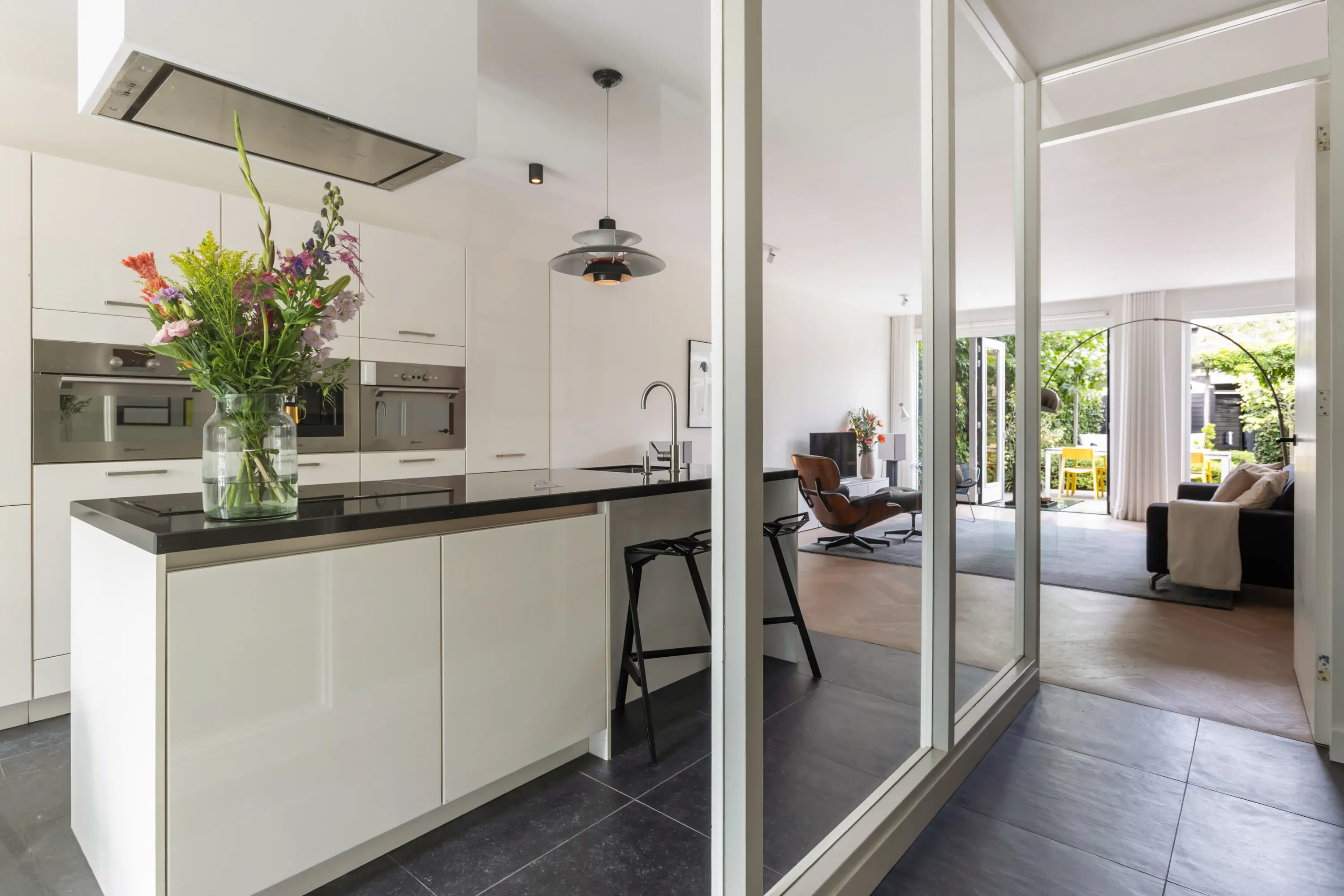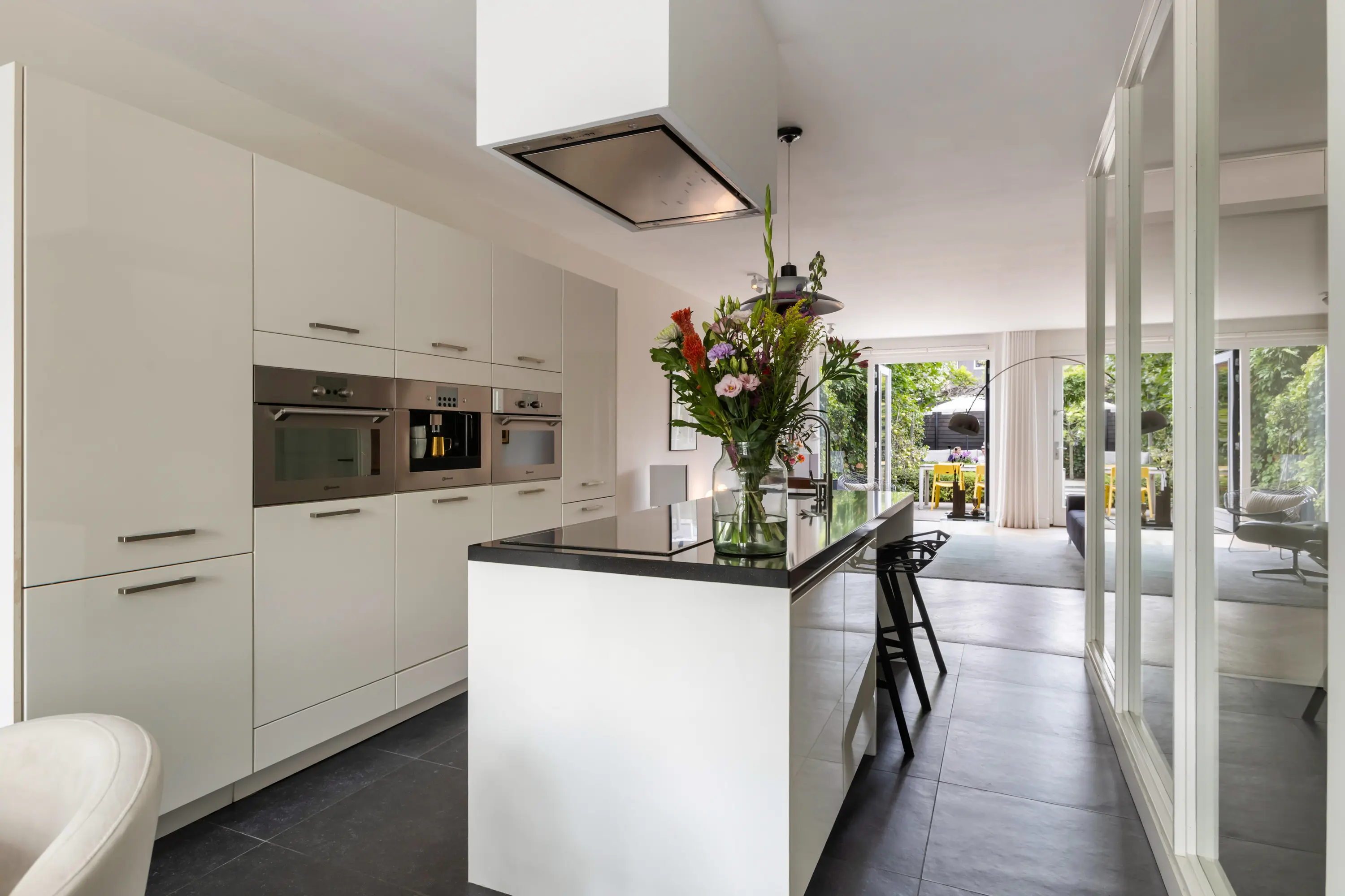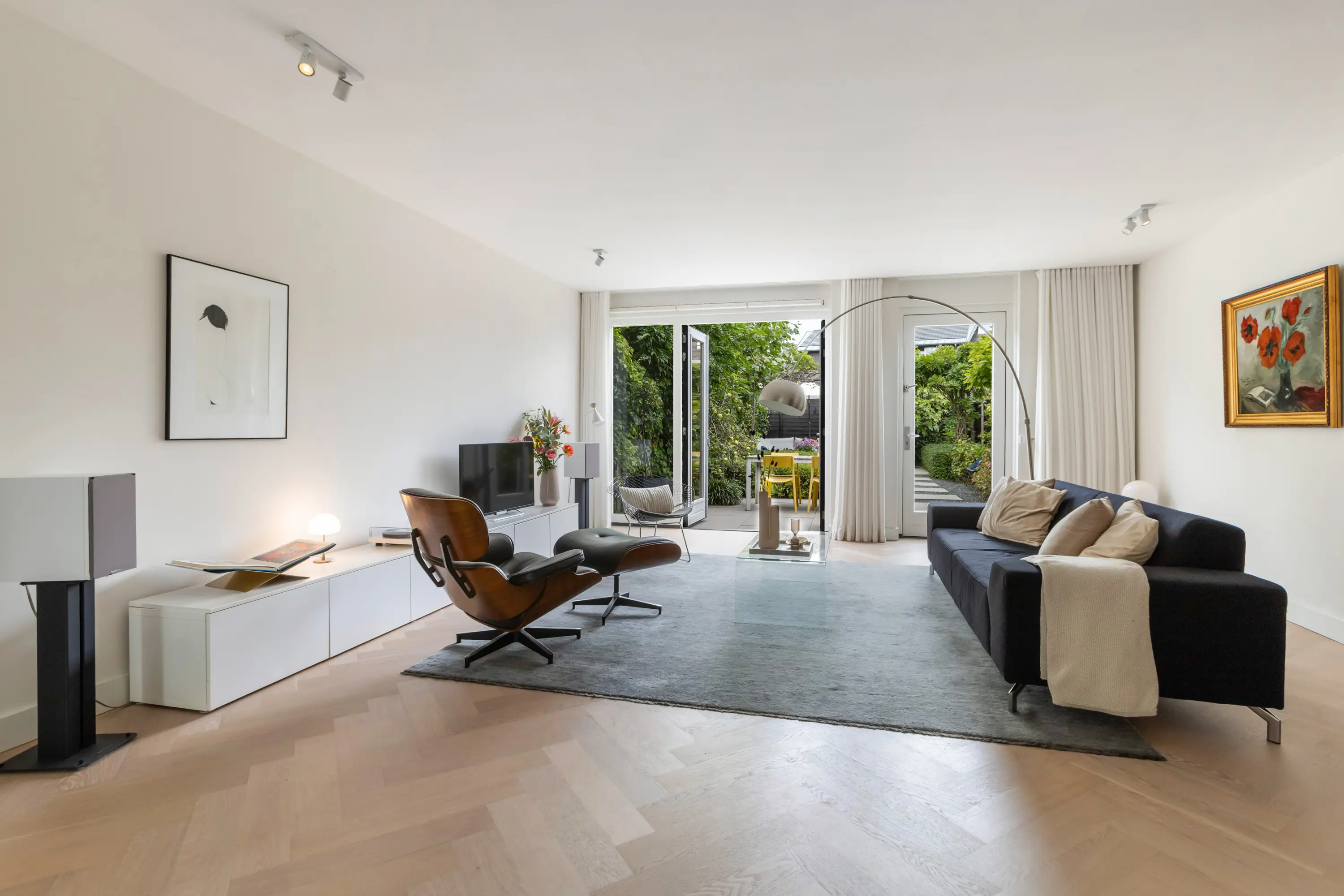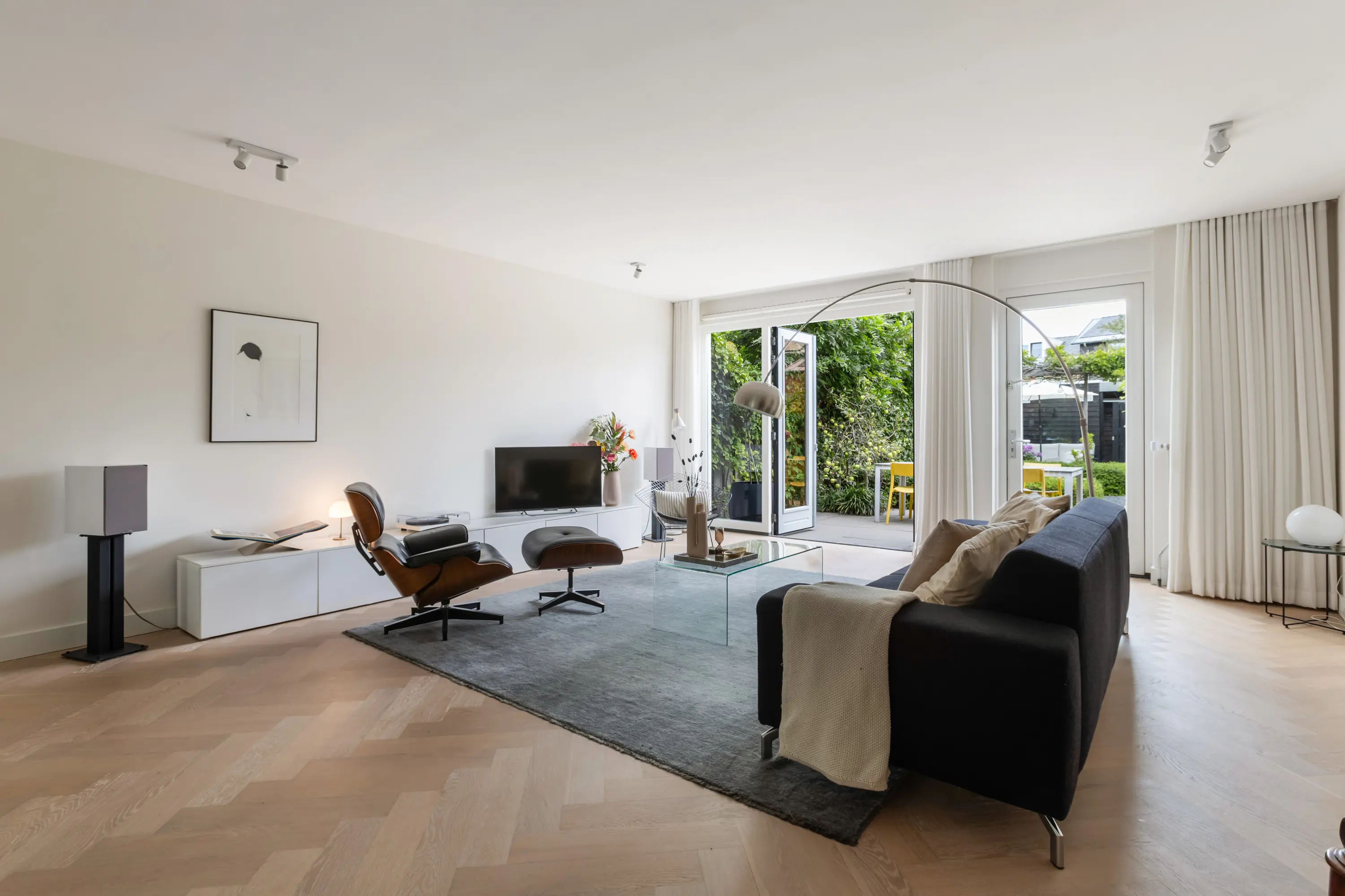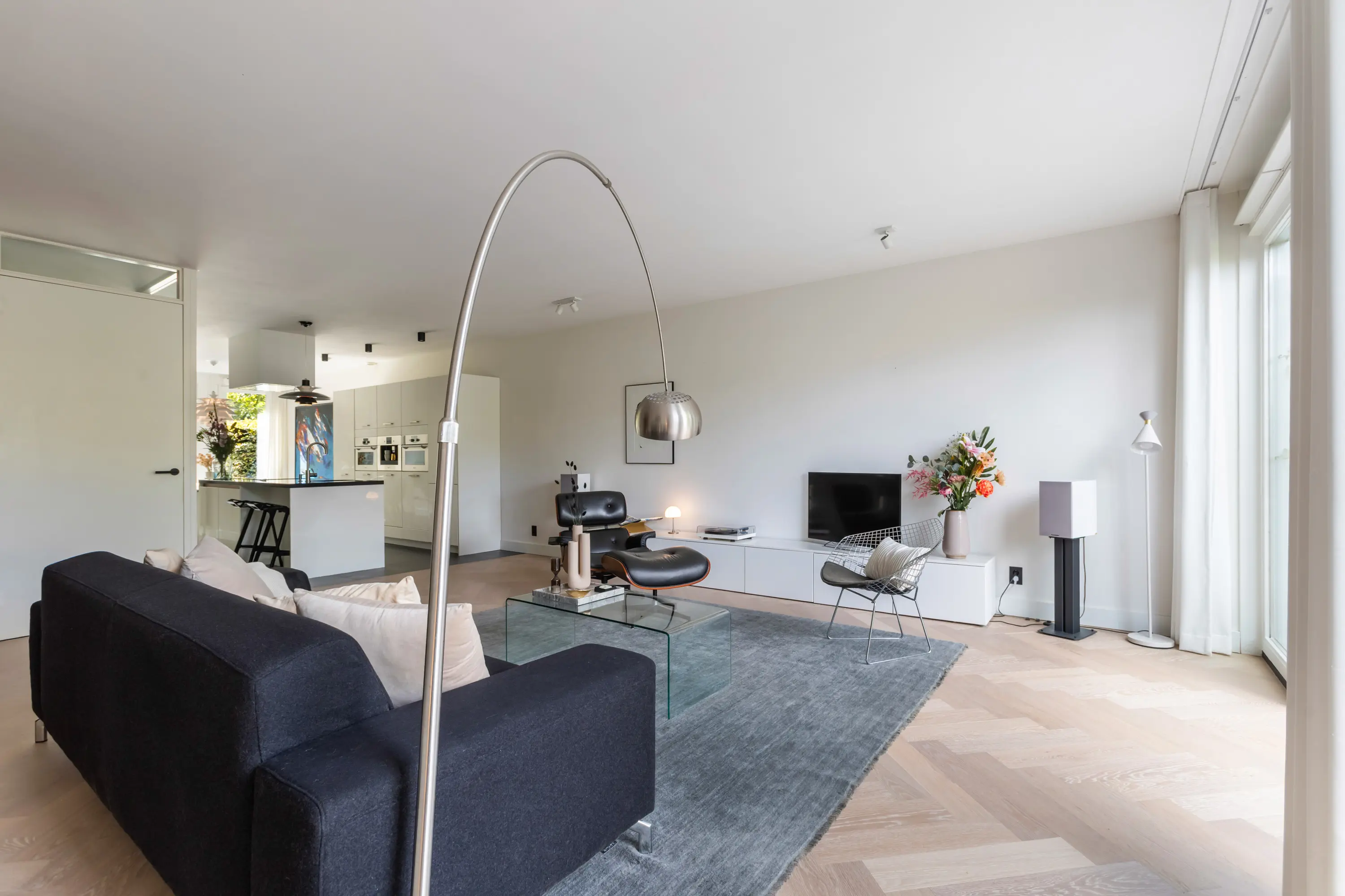 De royale en lichte woonkamer van 44 m² is prachtig afgewerkt en voorzien van een open keuken met moderne inbouwapparatuur. Dankzij de grote raampartijen valt veel daglicht binnen en via de openslaande deuren bereik je de achtertuin. De keuken grenst aan de voortuin, zodat je ook hier een fijn uitzicht hebt.