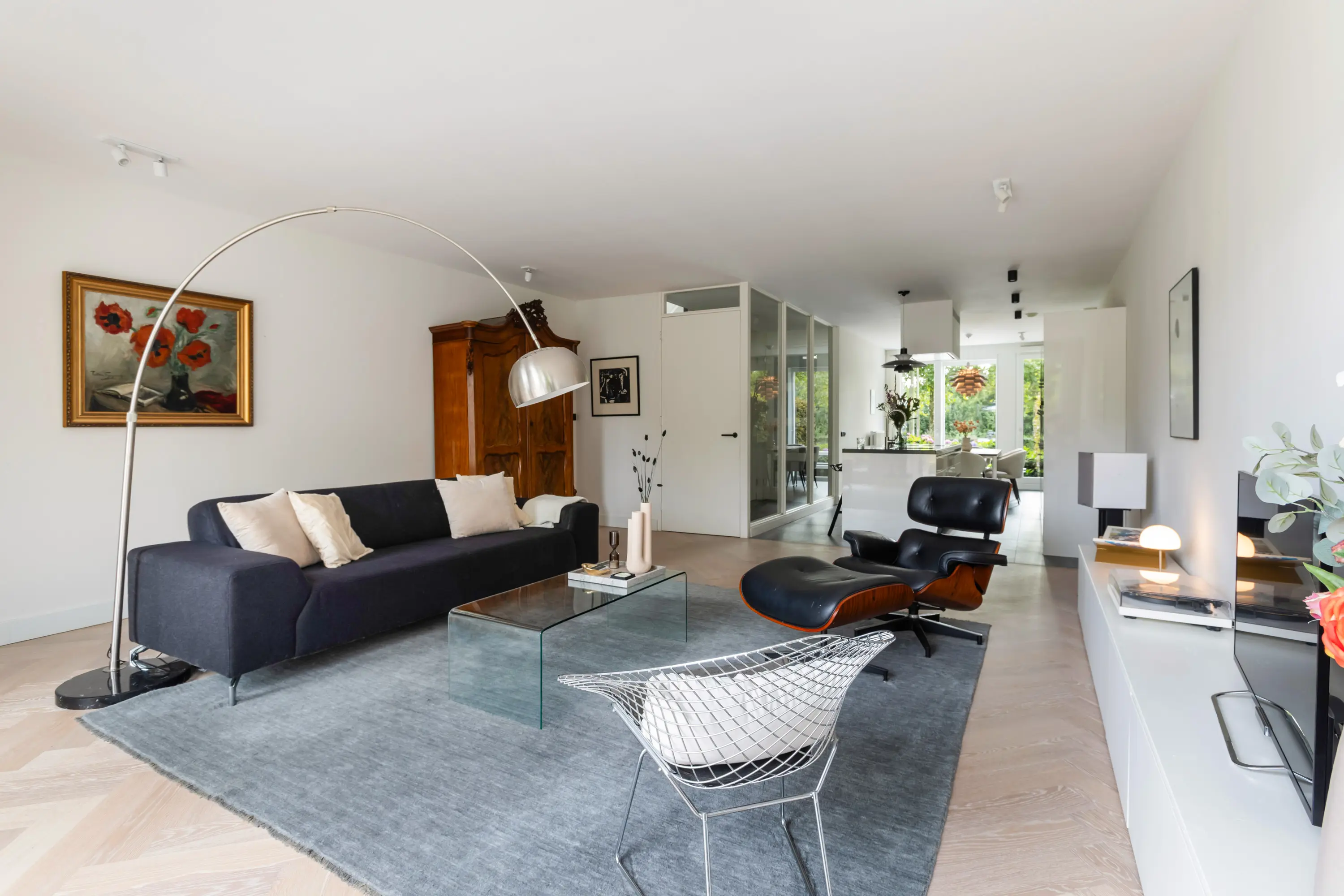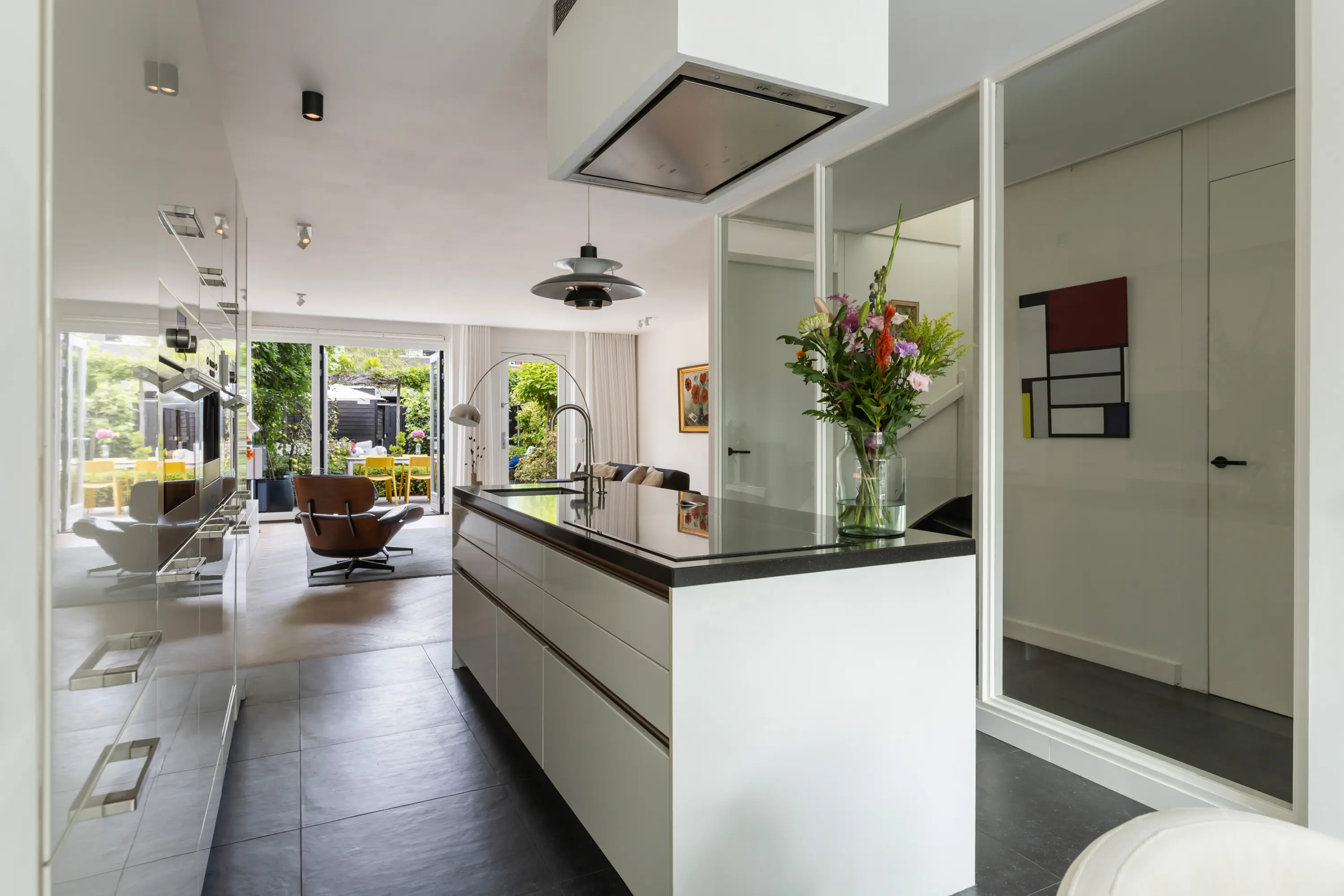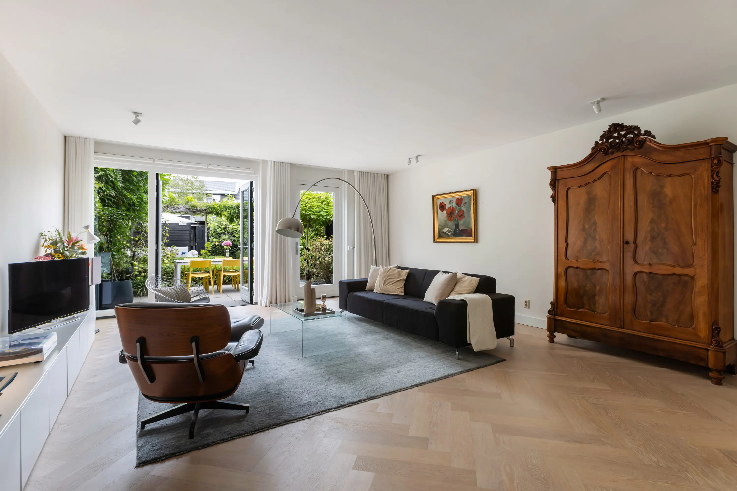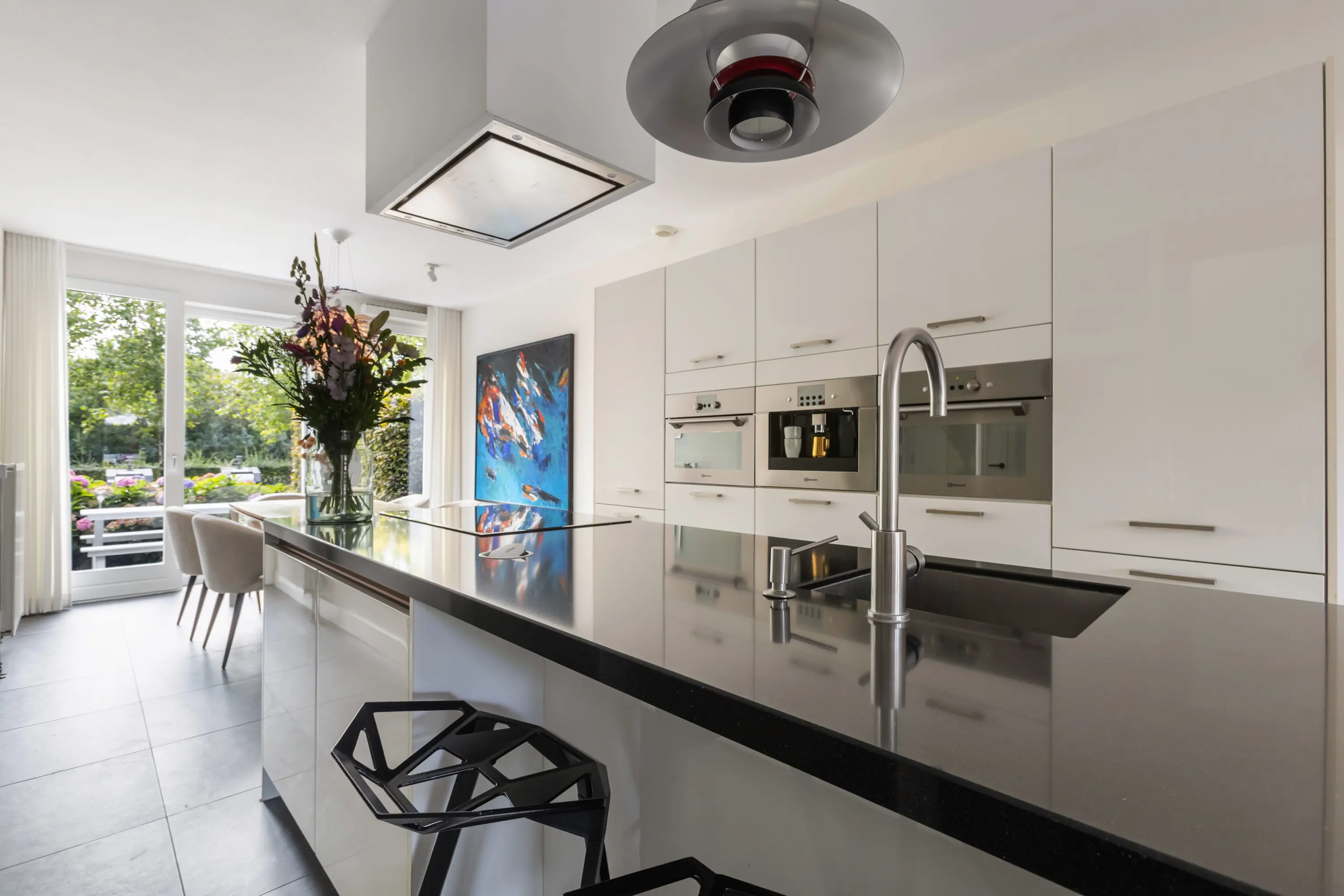 De royale en lichte woonkamer van 44 m² is prachtig afgewerkt en voorzien van een open keuken met moderne inbouwapparatuur. Dankzij de grote raampartijen valt veel daglicht binnen en via de openslaande deuren bereik je de achtertuin. De keuken grenst aan de voortuin, zodat je ook hier een fijn uitzicht hebt.