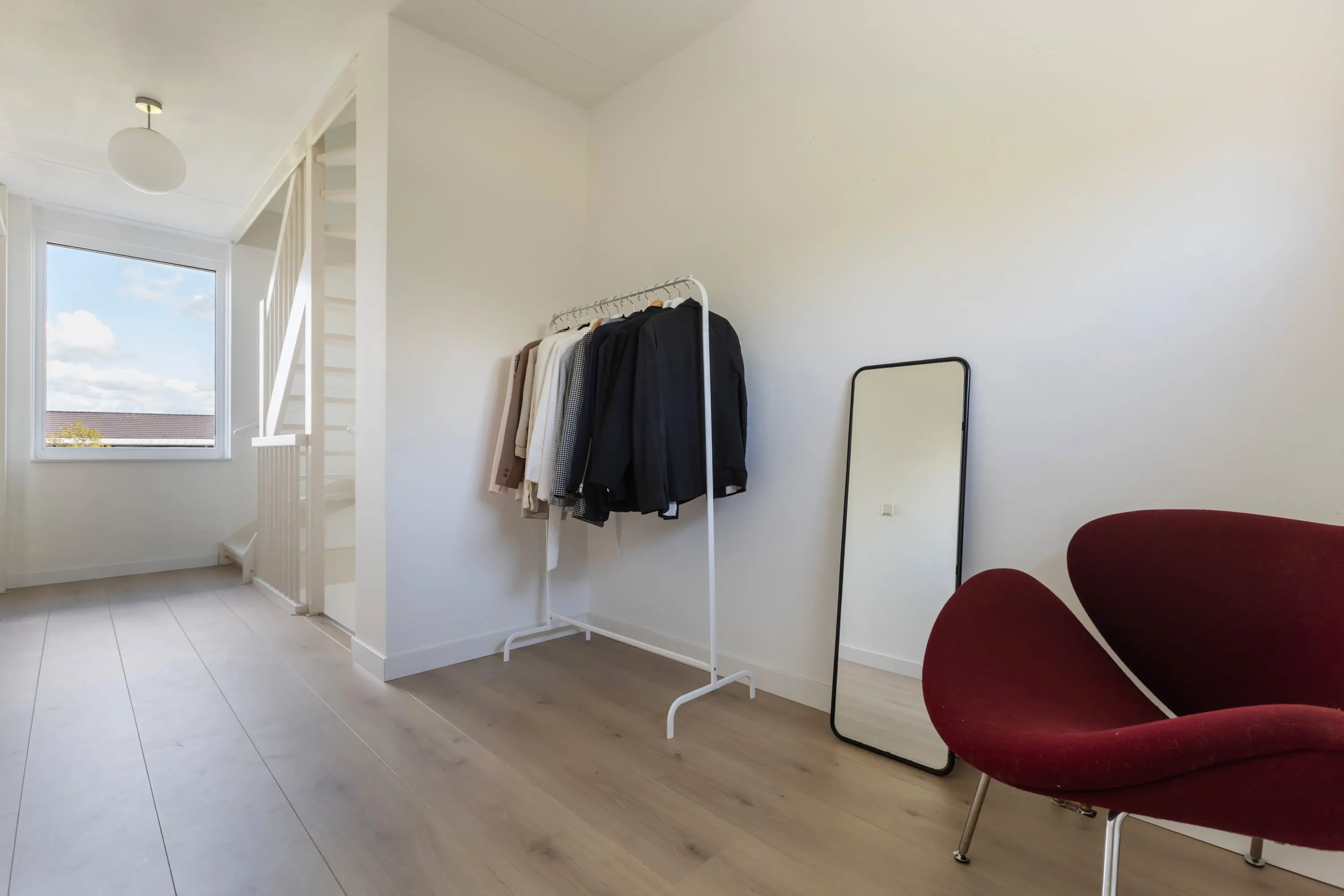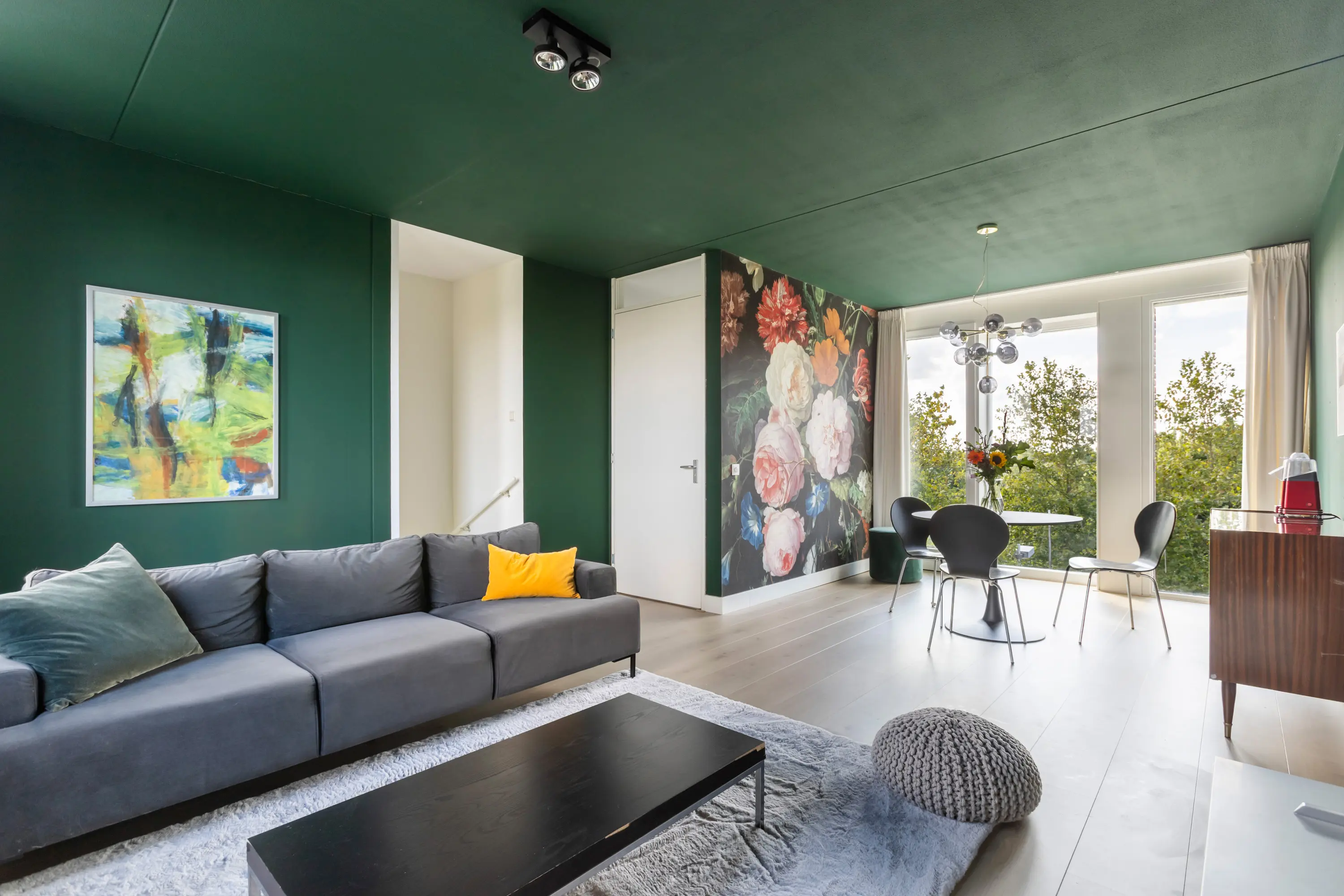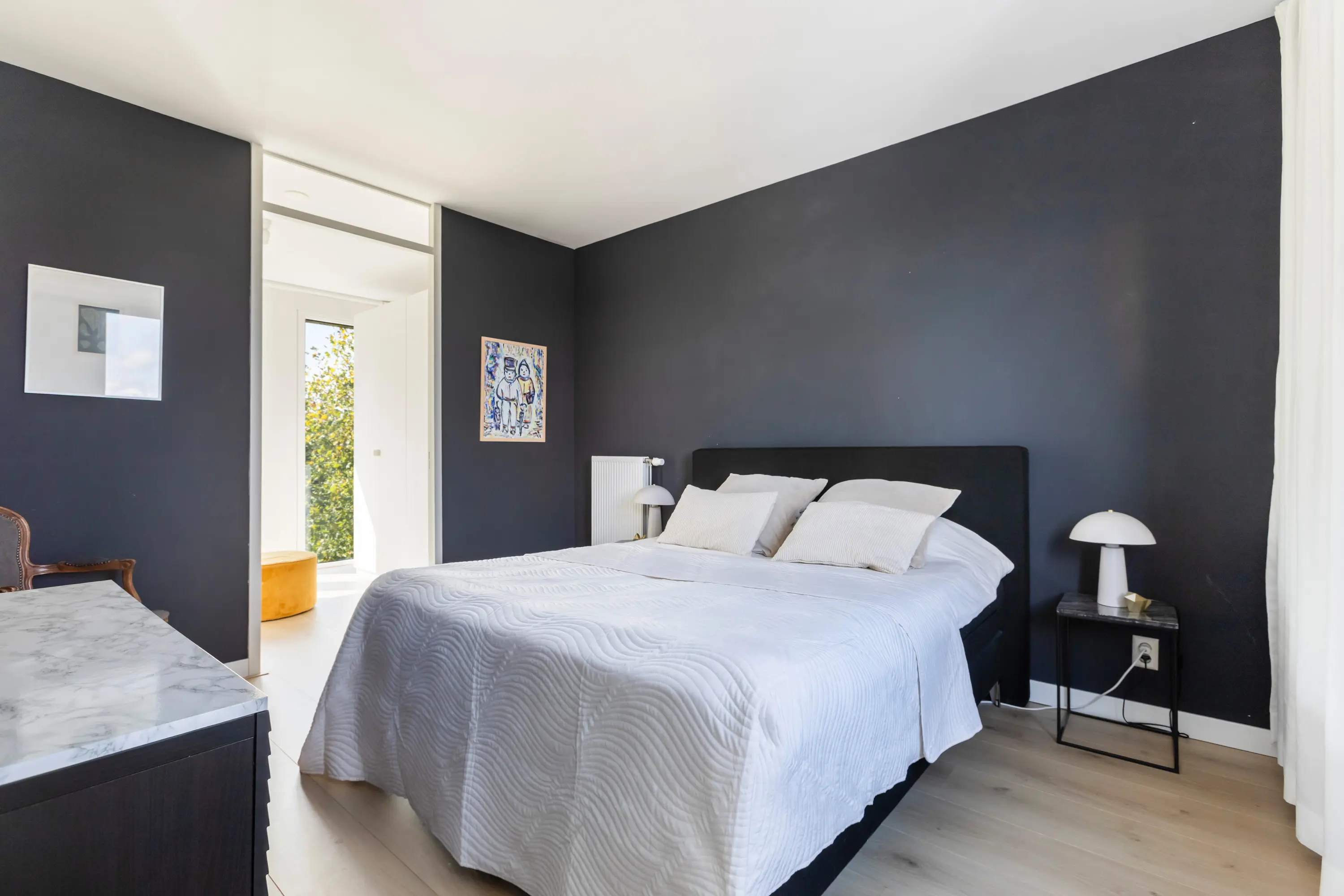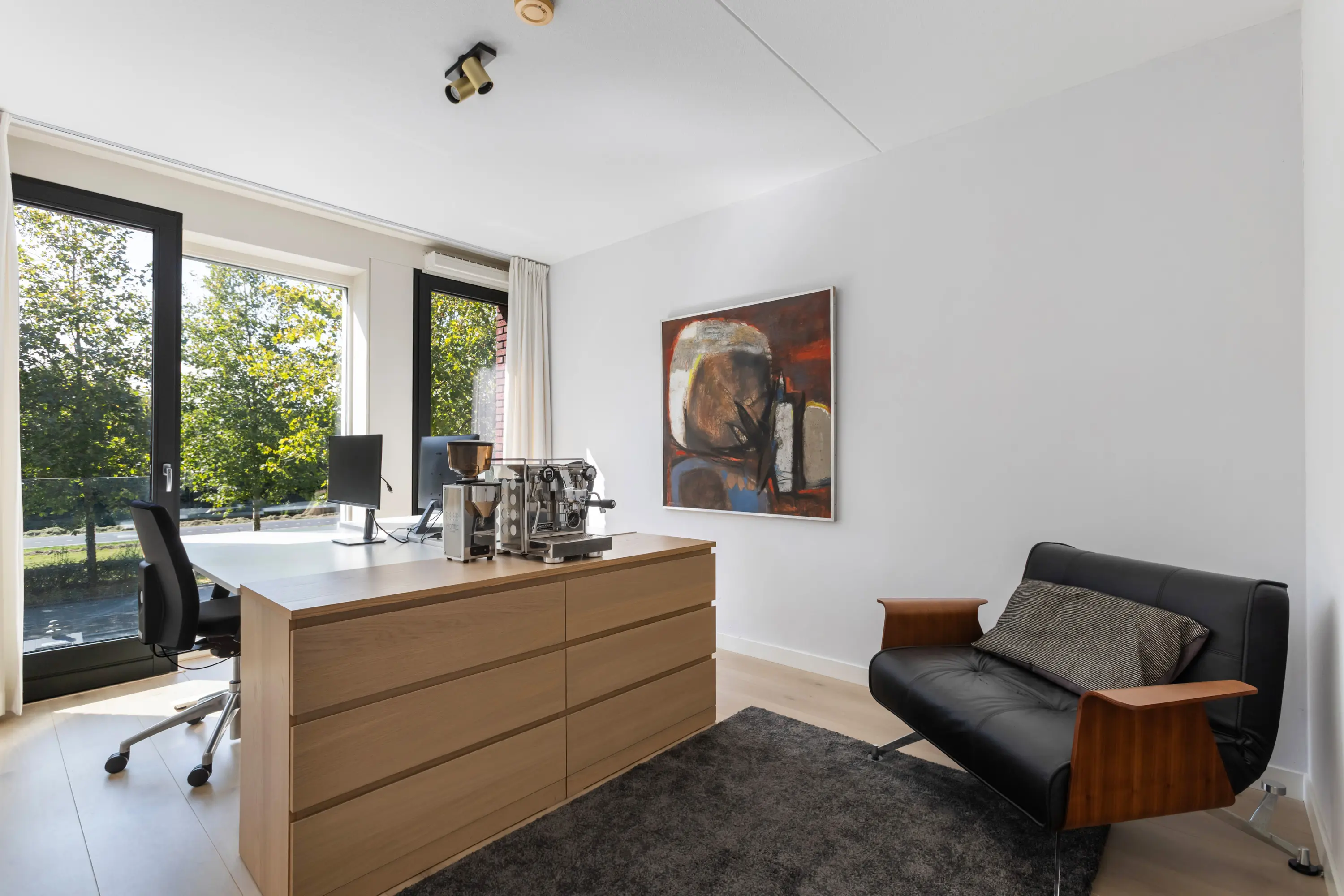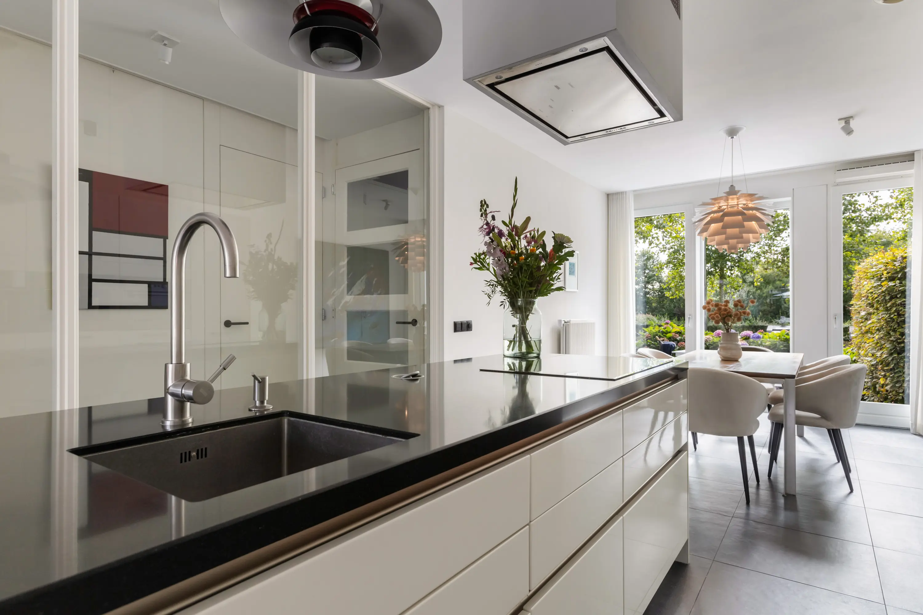 De royale en lichte woonkamer van 44 m² is prachtig afgewerkt en voorzien van een open keuken met moderne inbouwapparatuur. Dankzij de grote raampartijen valt veel daglicht binnen en via de openslaande deuren bereik je de achtertuin. De keuken grenst aan de voortuin, zodat je ook hier een fijn uitzicht hebt.