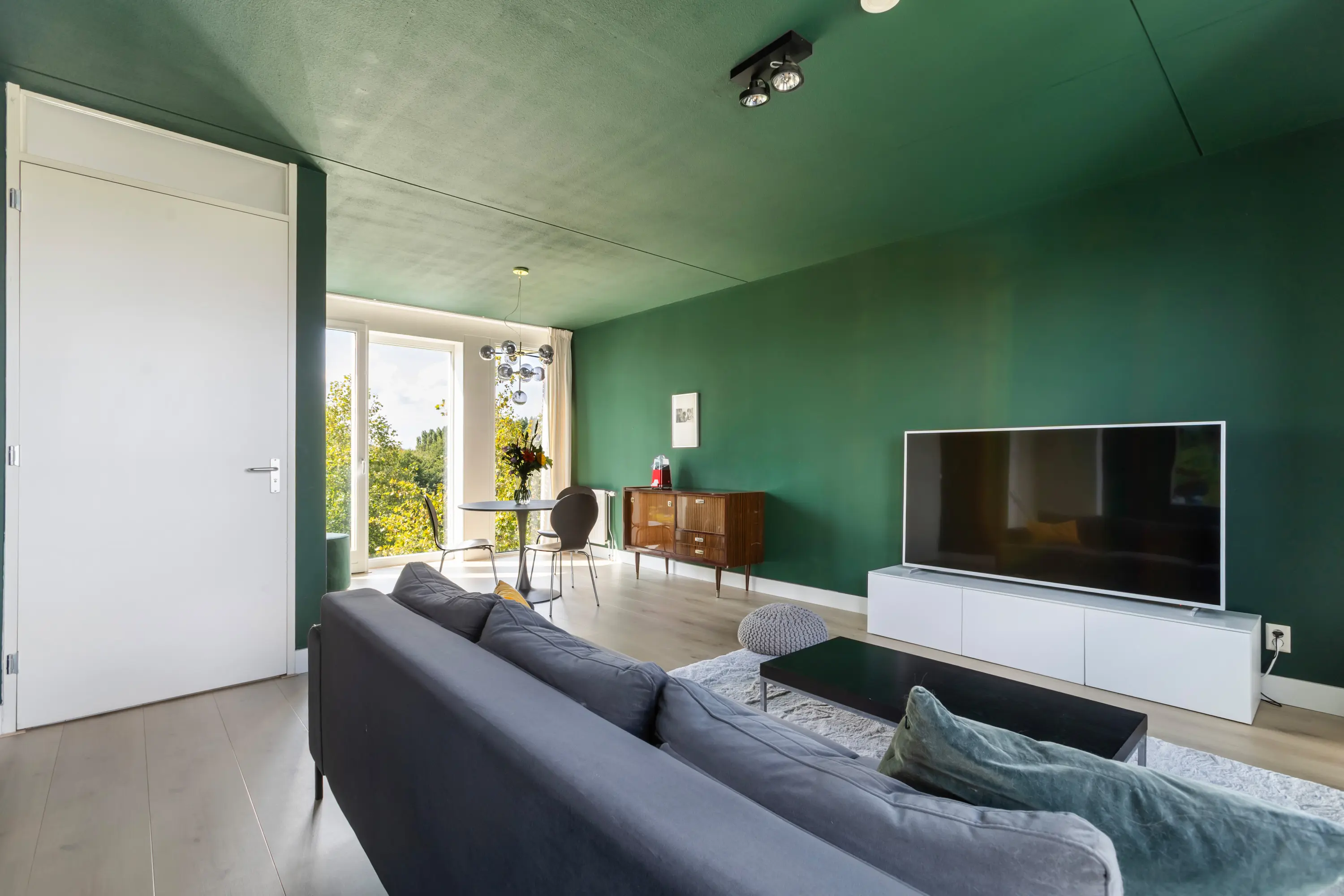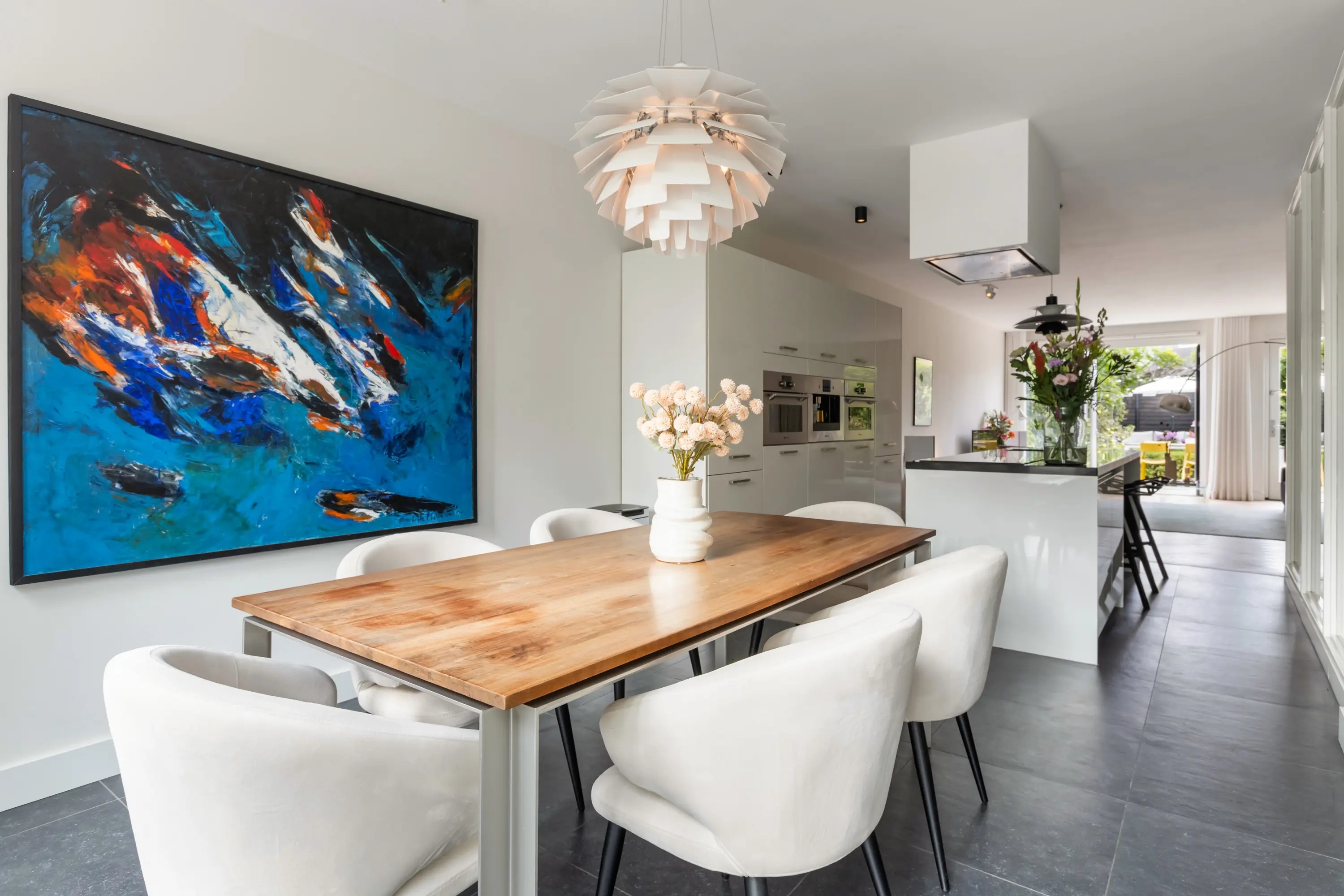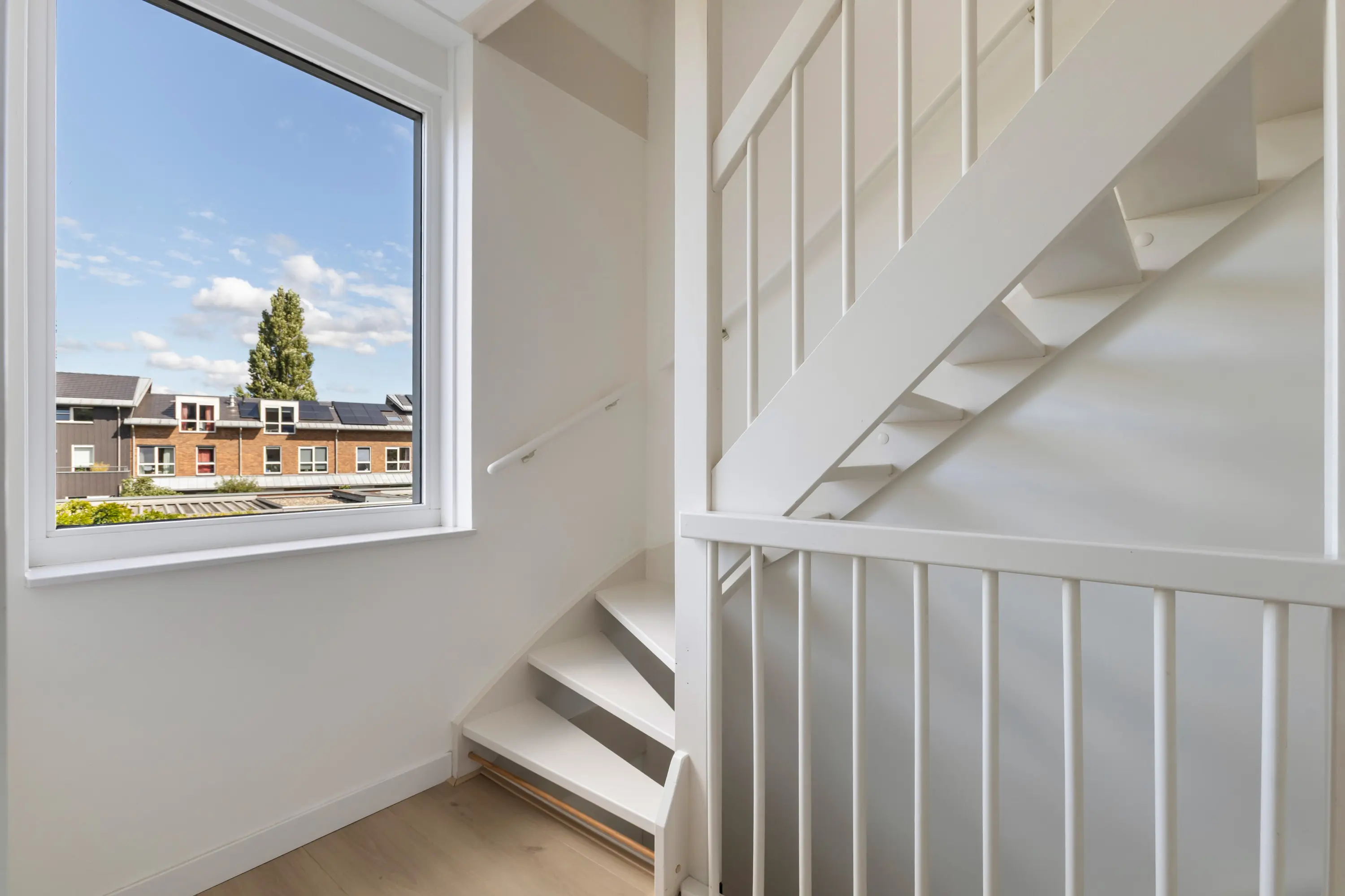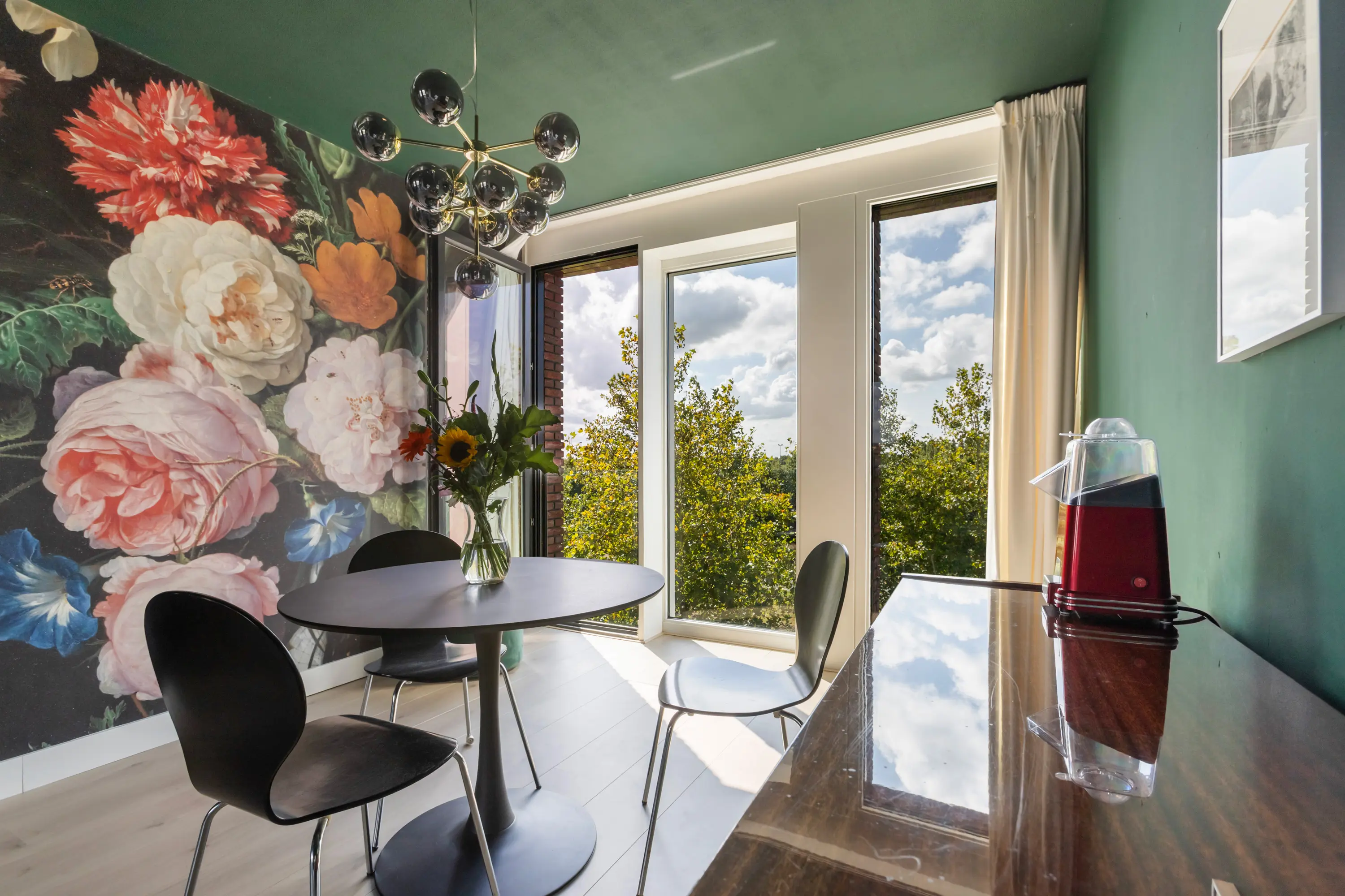 De royale en lichte woonkamer van 44 m² is prachtig afgewerkt en voorzien van een open keuken met moderne inbouwapparatuur. Dankzij de grote raampartijen valt veel daglicht binnen en via de openslaande deuren bereik je de achtertuin. De keuken grenst aan de voortuin, zodat je ook hier een fijn uitzicht hebt.