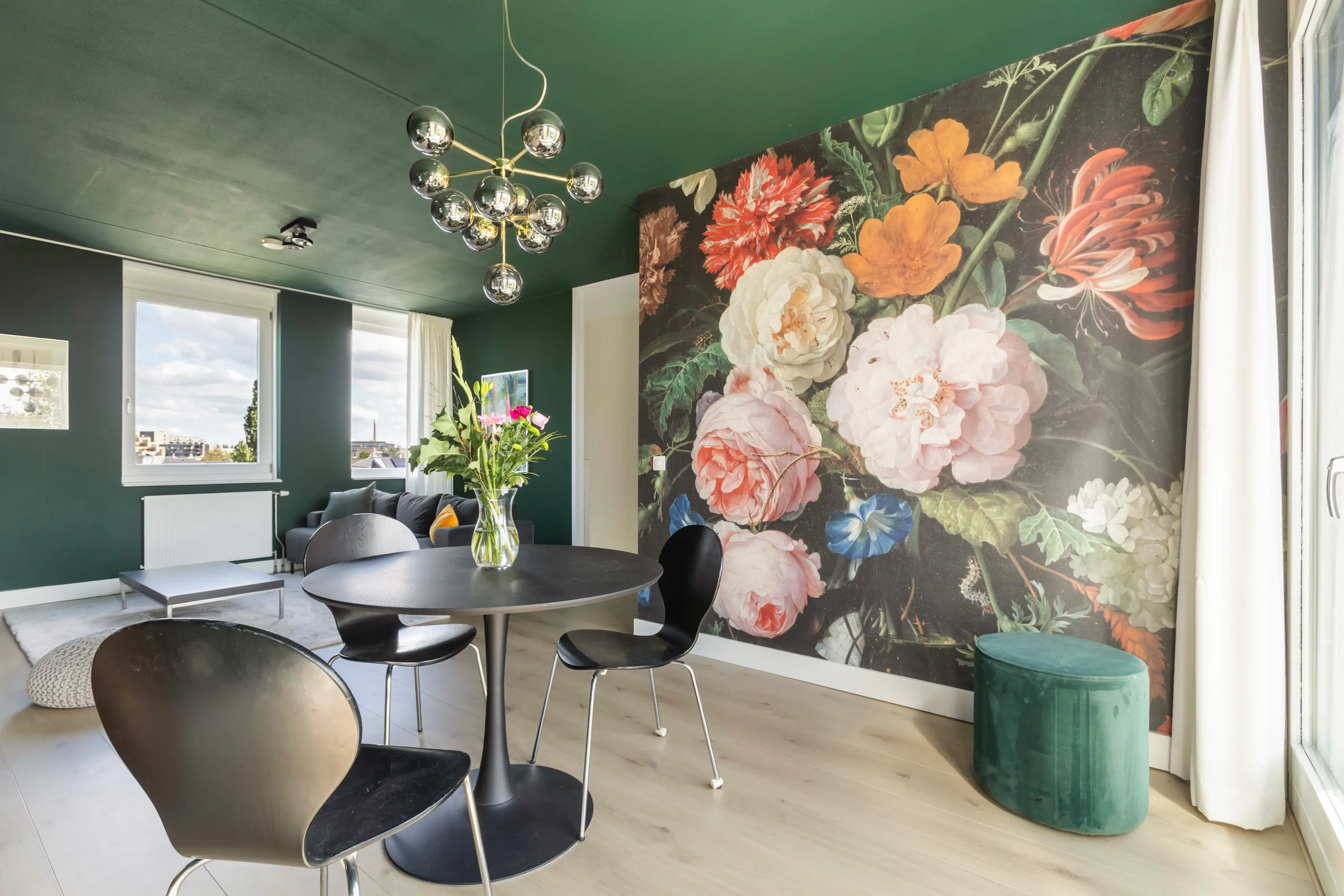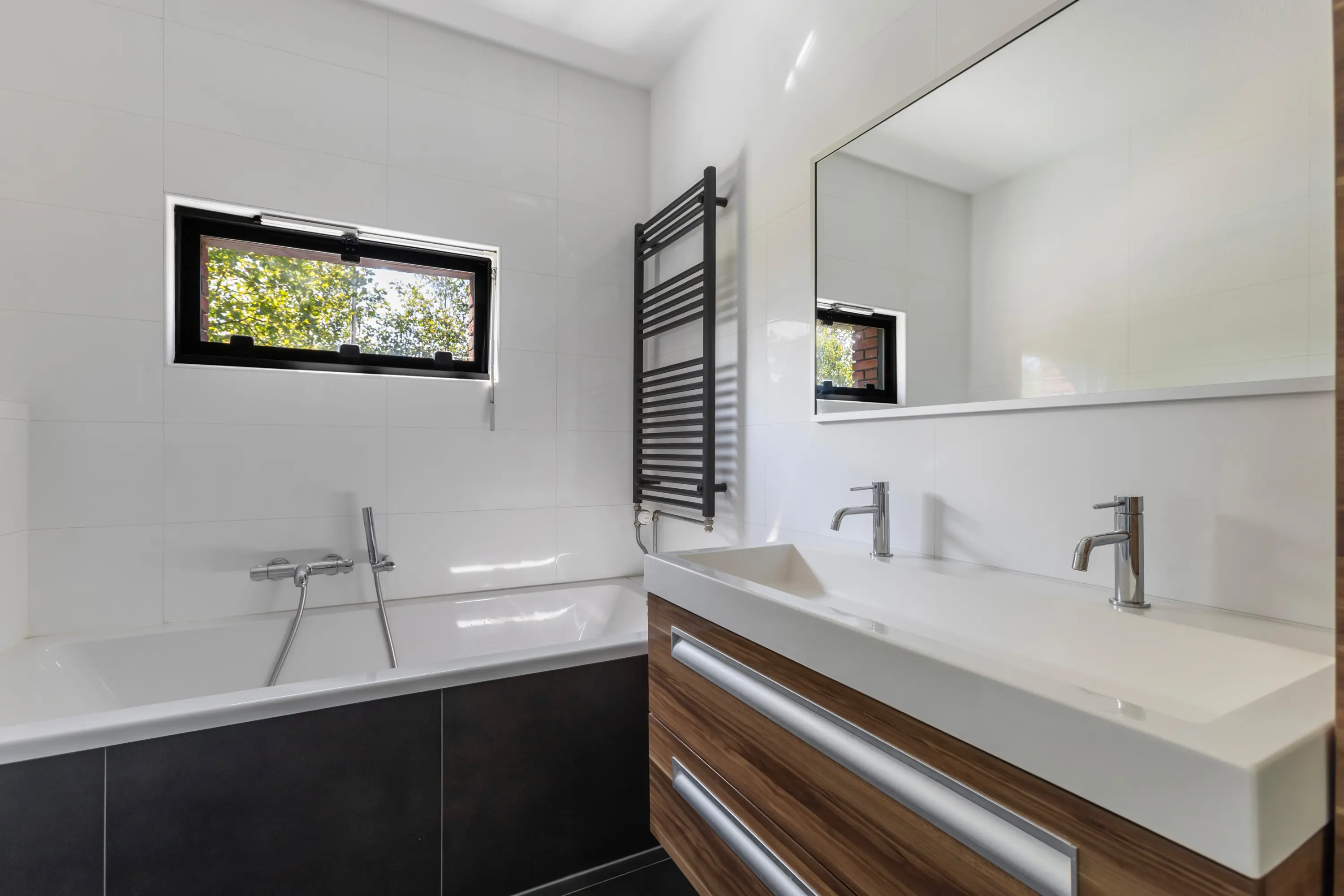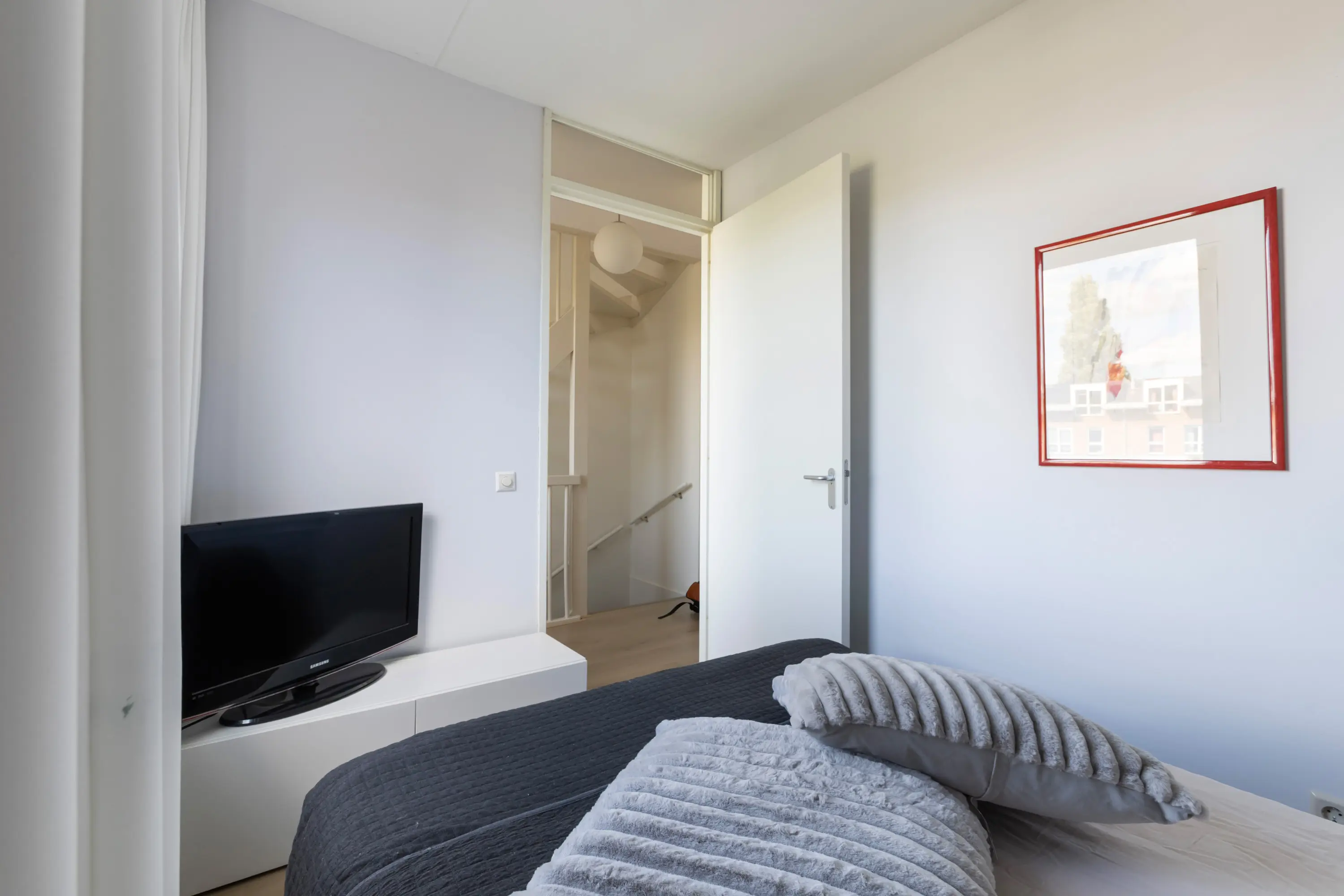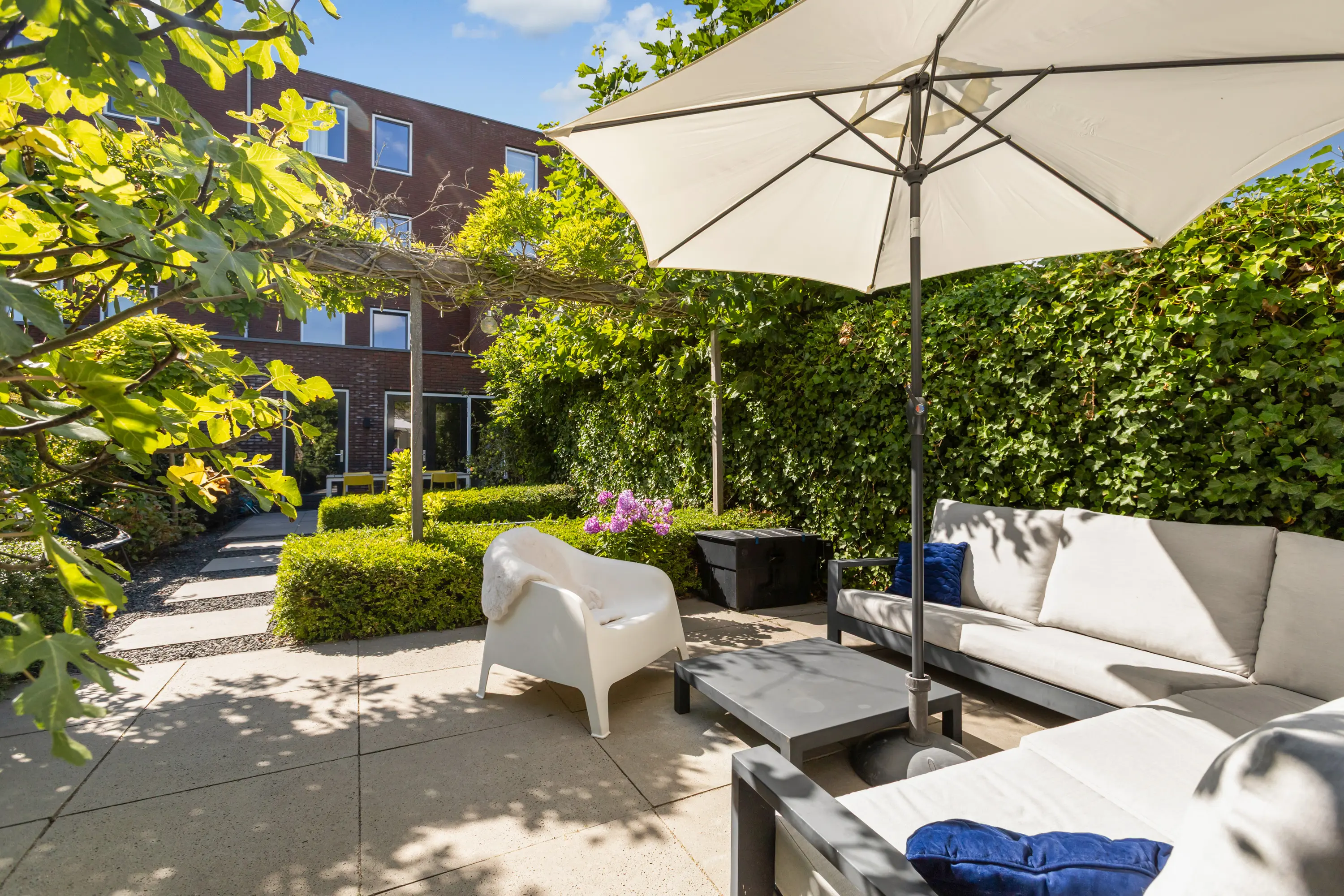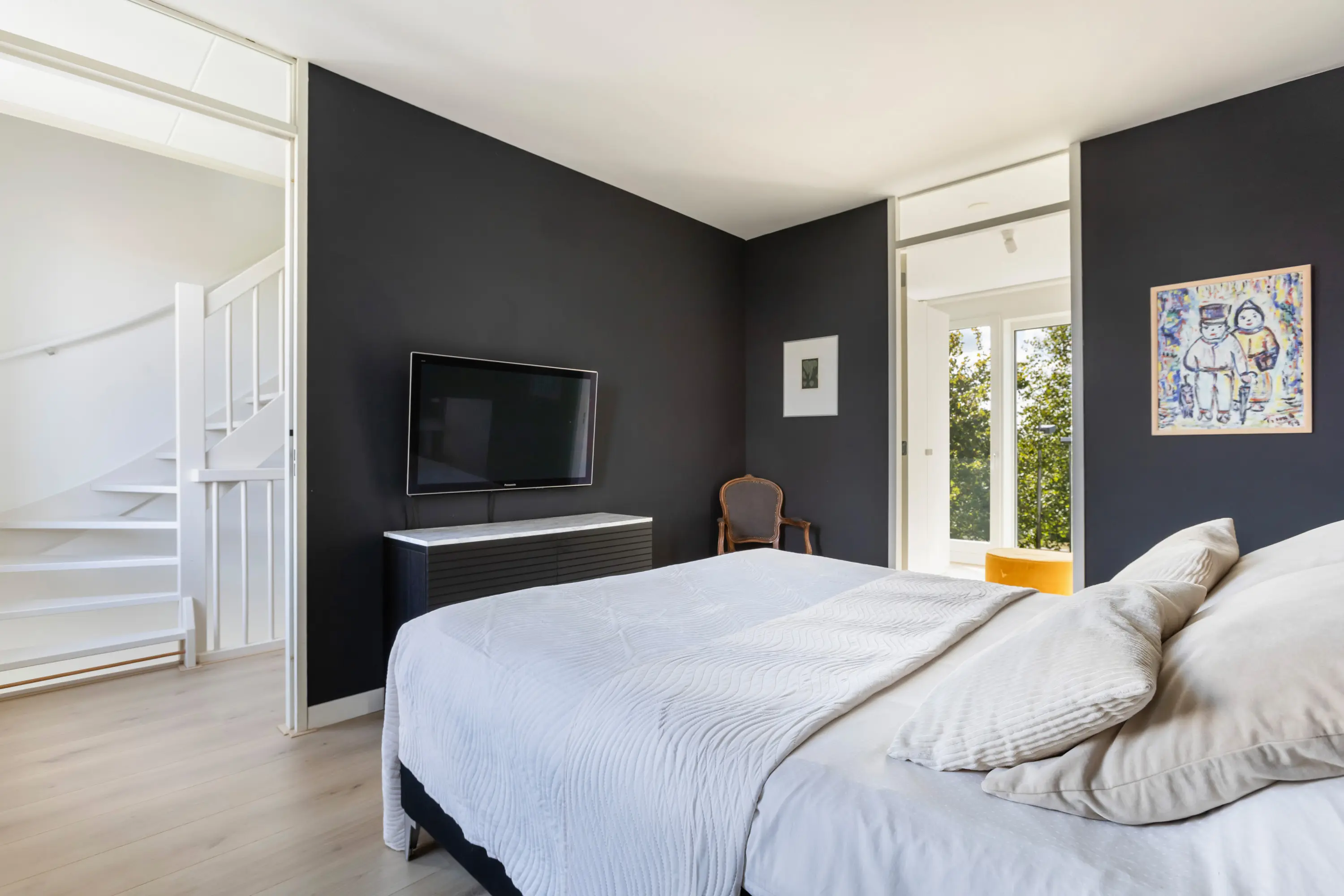 De royale en lichte woonkamer van 44 m² is prachtig afgewerkt en voorzien van een open keuken met moderne inbouwapparatuur. Dankzij de grote raampartijen valt veel daglicht binnen en via de openslaande deuren bereik je de achtertuin. De keuken grenst aan de voortuin, zodat je ook hier een fijn uitzicht hebt.
