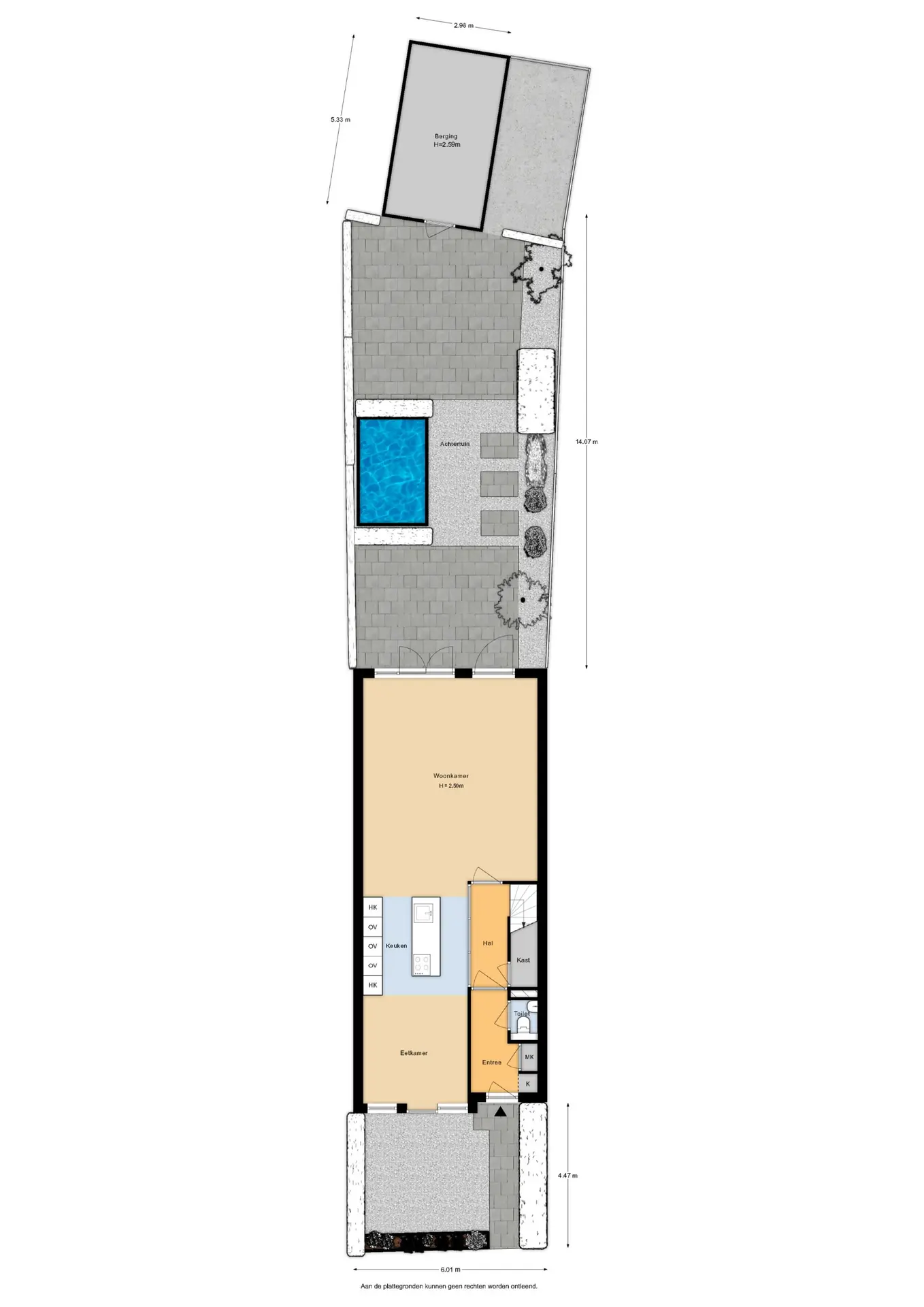 De woning beschikt over een verzorgde voortuin en een ruime achtertuin op het noordoosten (ca. 85 m²) met achterom, vrijstaande berging en carport. Deze carport is voorzien van een laadpaal.
