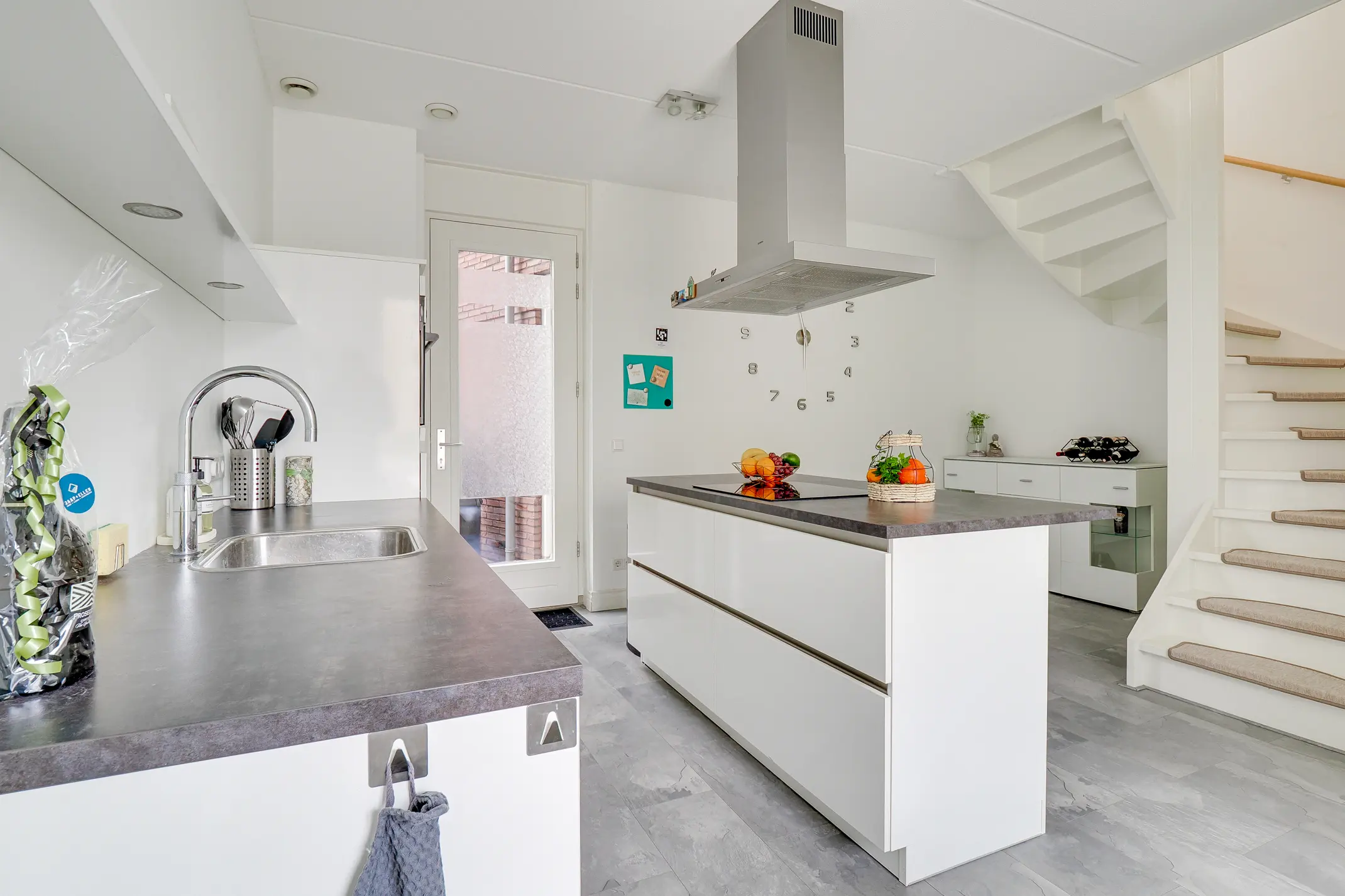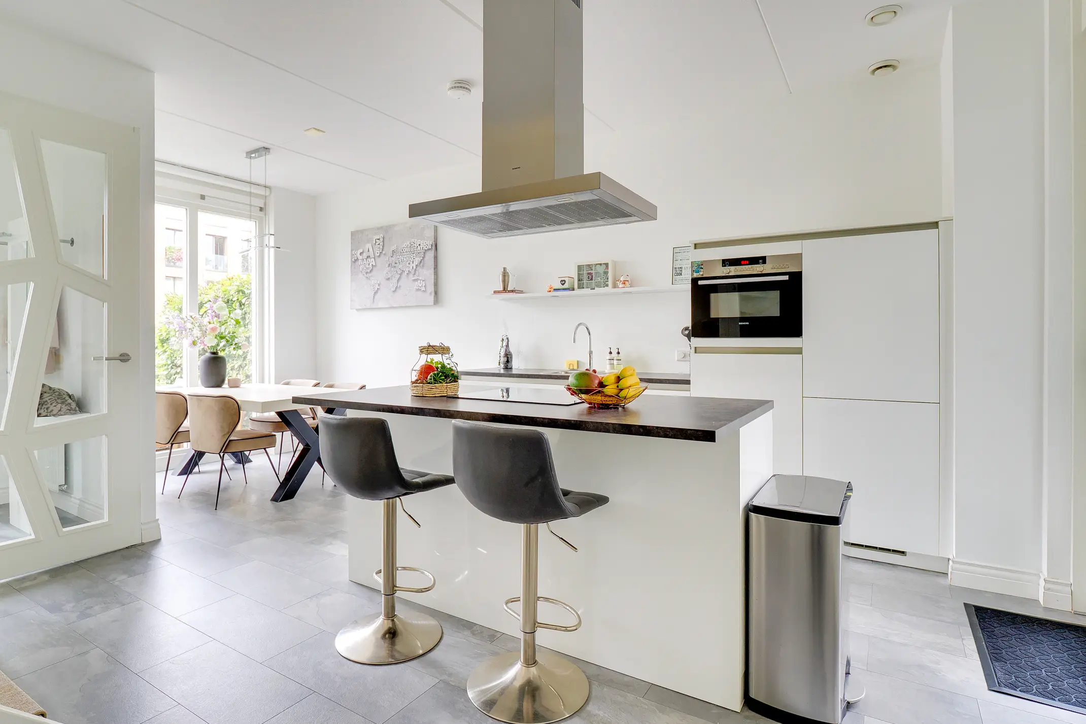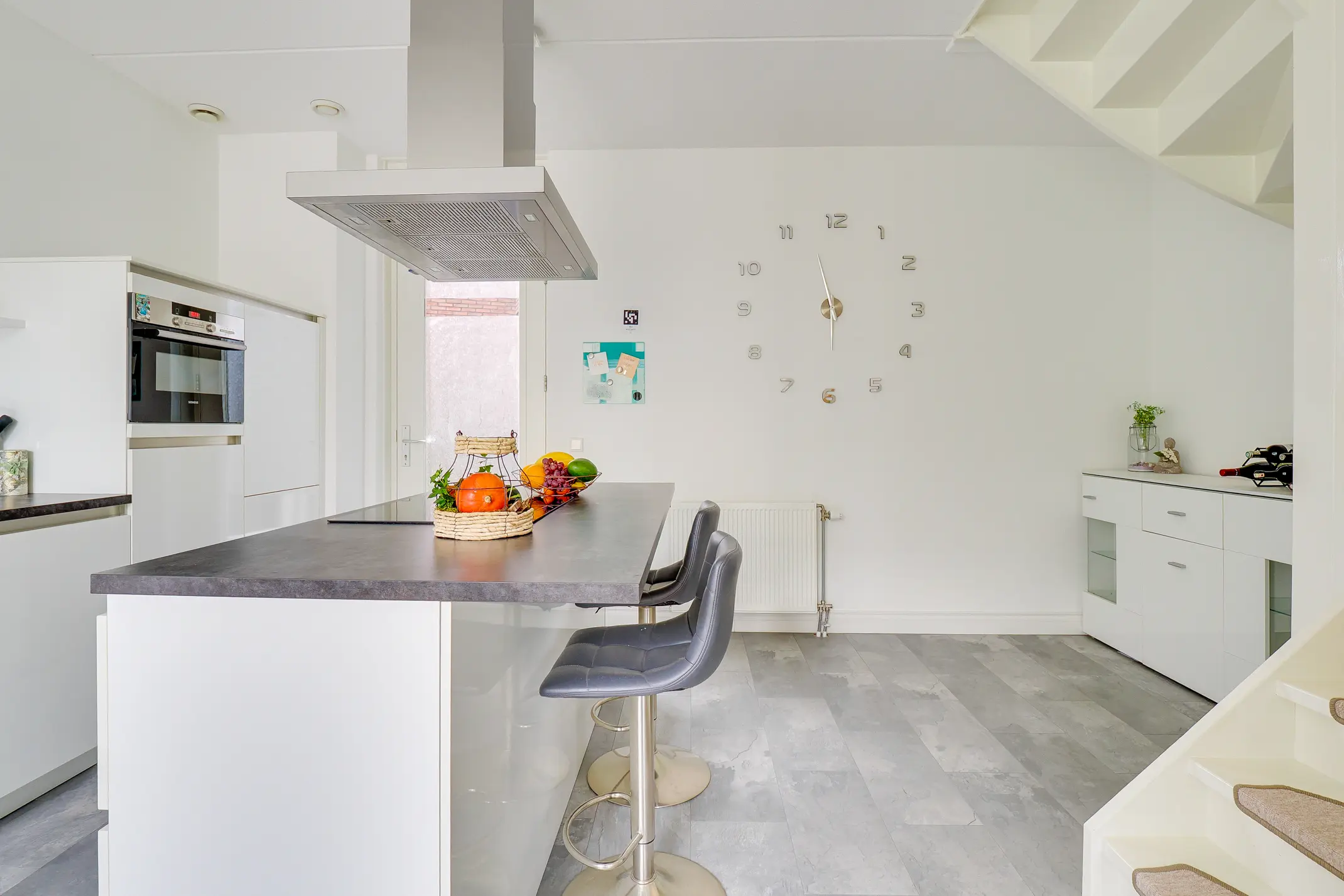 • Begane grond: royale, open leefkeuken (2015) van ca. 24 m² met Quooker en een gezellig bar-eiland. Deze keuken nodigt uit: koken én drinken samen aan het eiland, etentjes voorbereiden terwijl je gasten aanschuiven — precies die leefbare sfeer waar je blij van wordt. De deur geeft direct toegang tot de voortuin op het zuidwesten, heerlijk voor een zonnig ontbijt of een rustige middagkoffie.
