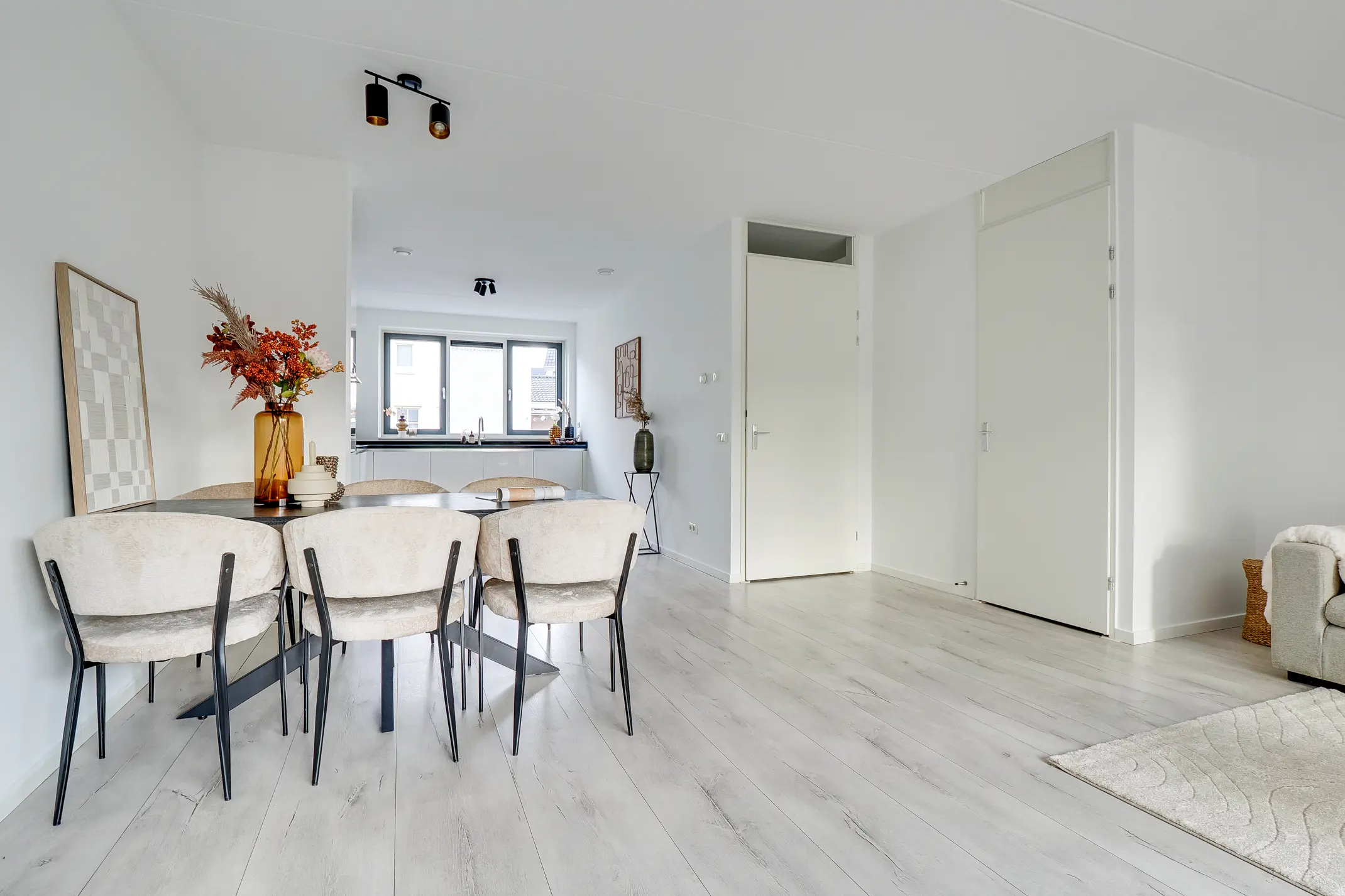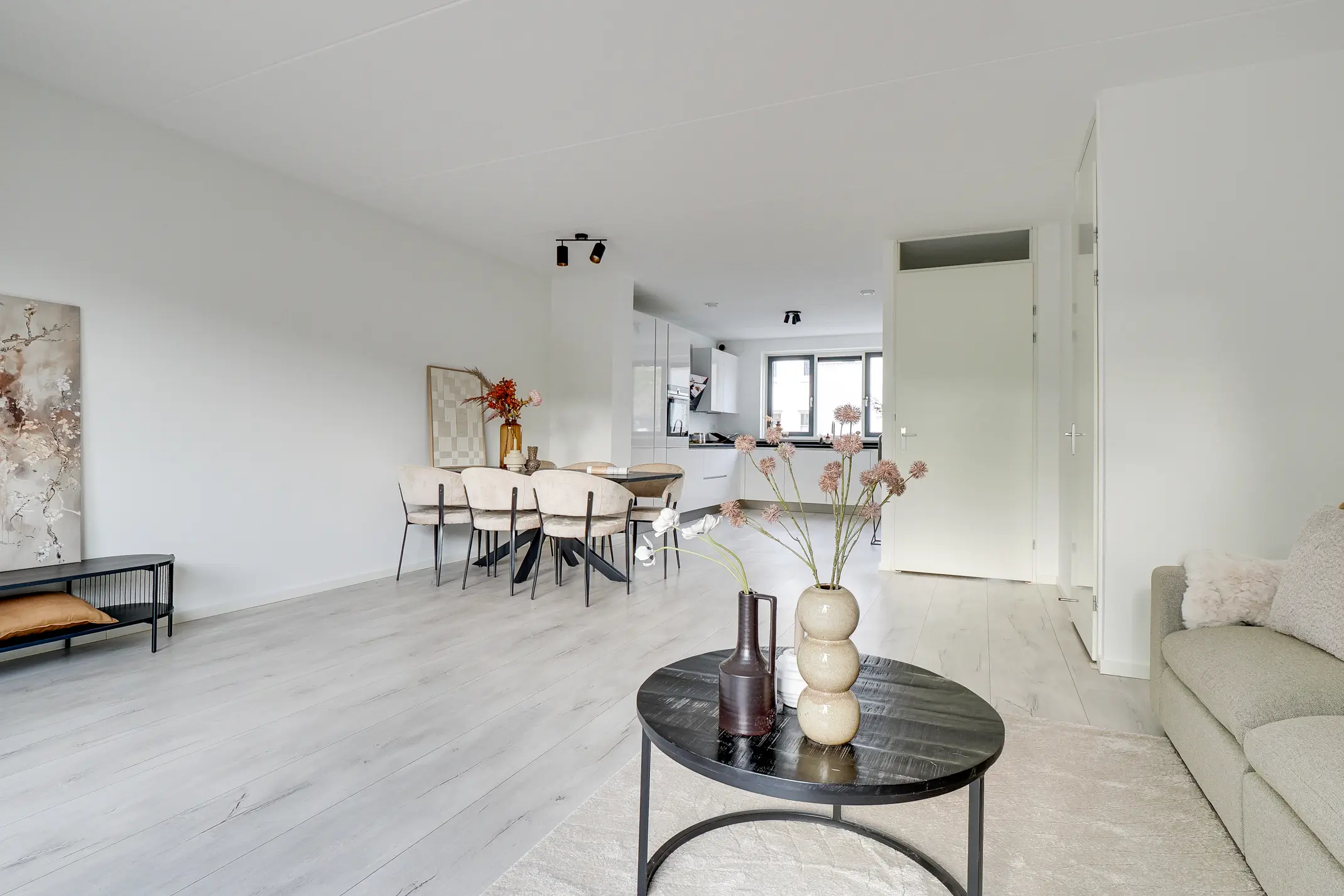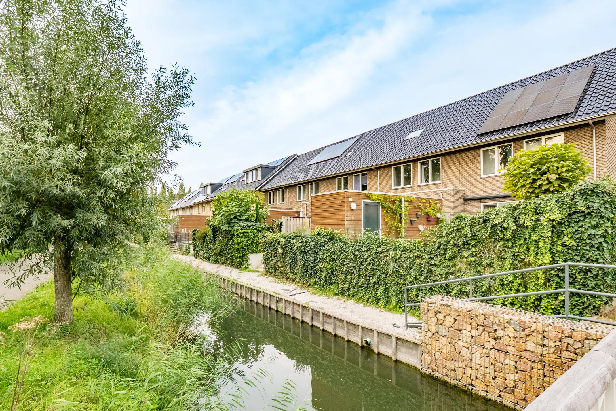 De uitgebouwde woonkamer is heerlijk licht en biedt volop ruimte voor een fijne zithoek en grote eettafel. Via de schuifpui bereik je de zonnige achtertuin met vrij uitzicht over water en groen. Hier geniet je in de zomermaanden van de ochtendzon tot laat in de middag.