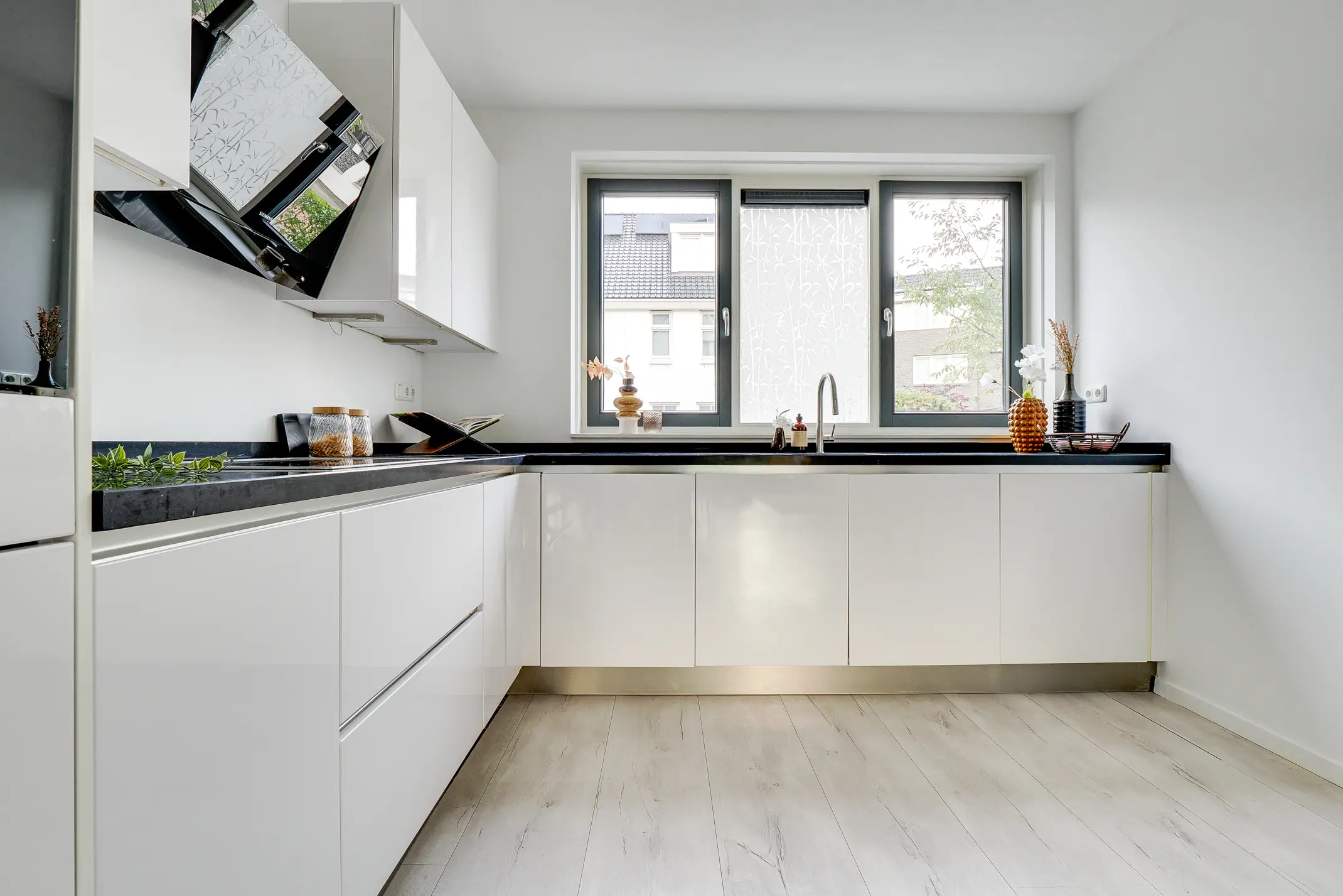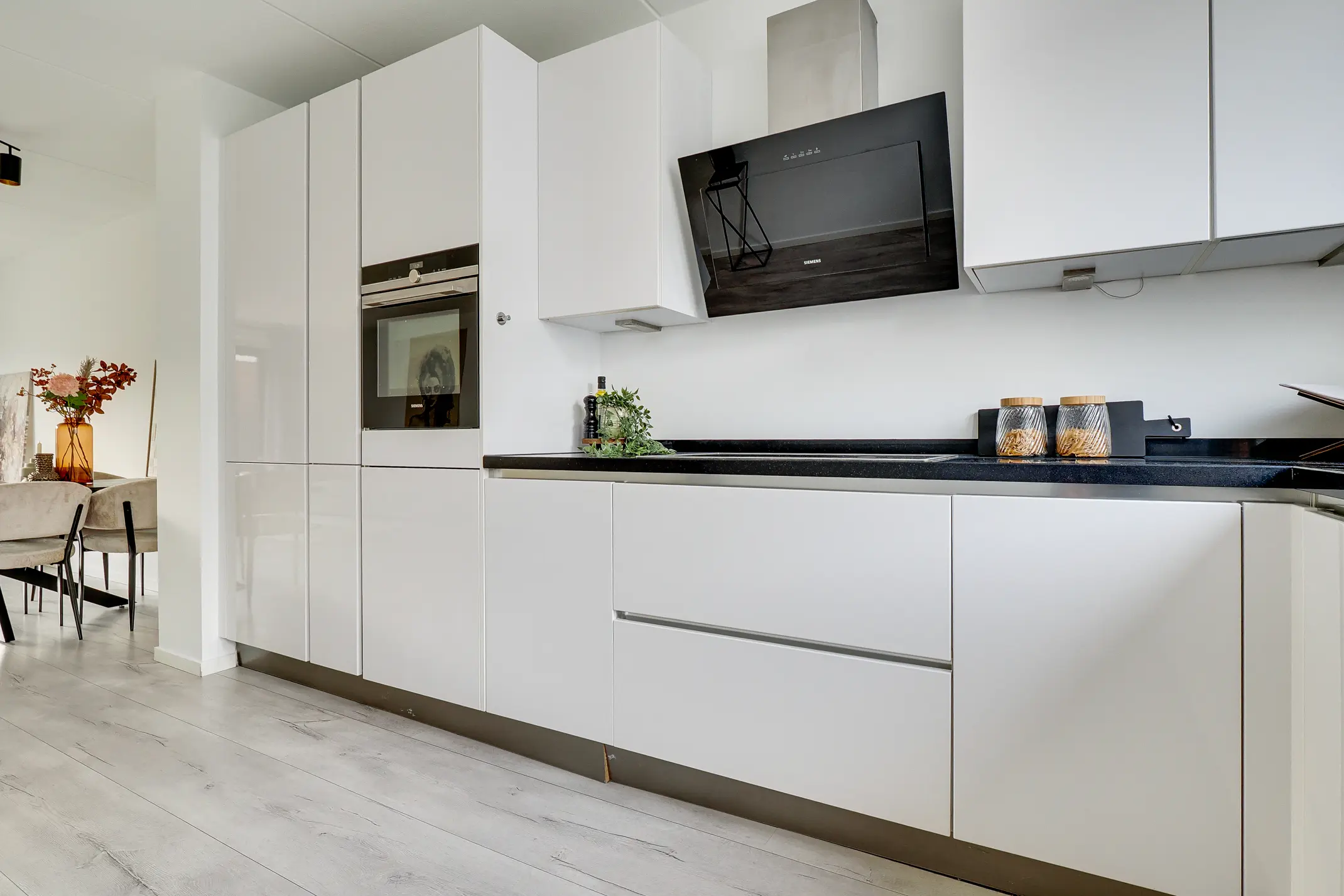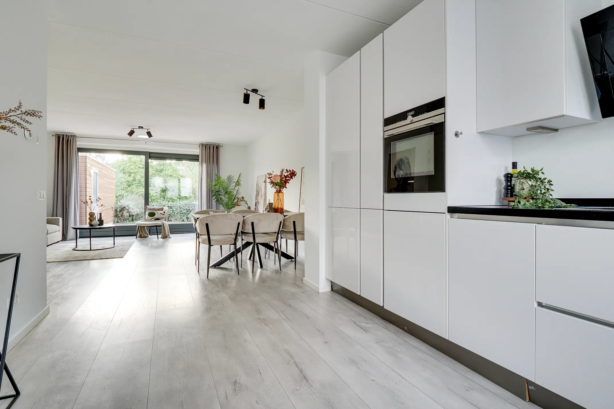 Aan de voorzijde ligt de moderne open Siemens keuken, volledig uitgerust met diverse Siemens inbouwapparatuur. De gehele begane grond is strak afgewerkt met een laminaatvloer en voorzien van vloerverwarming – comfortabel en onderhoudsvriendelijk.