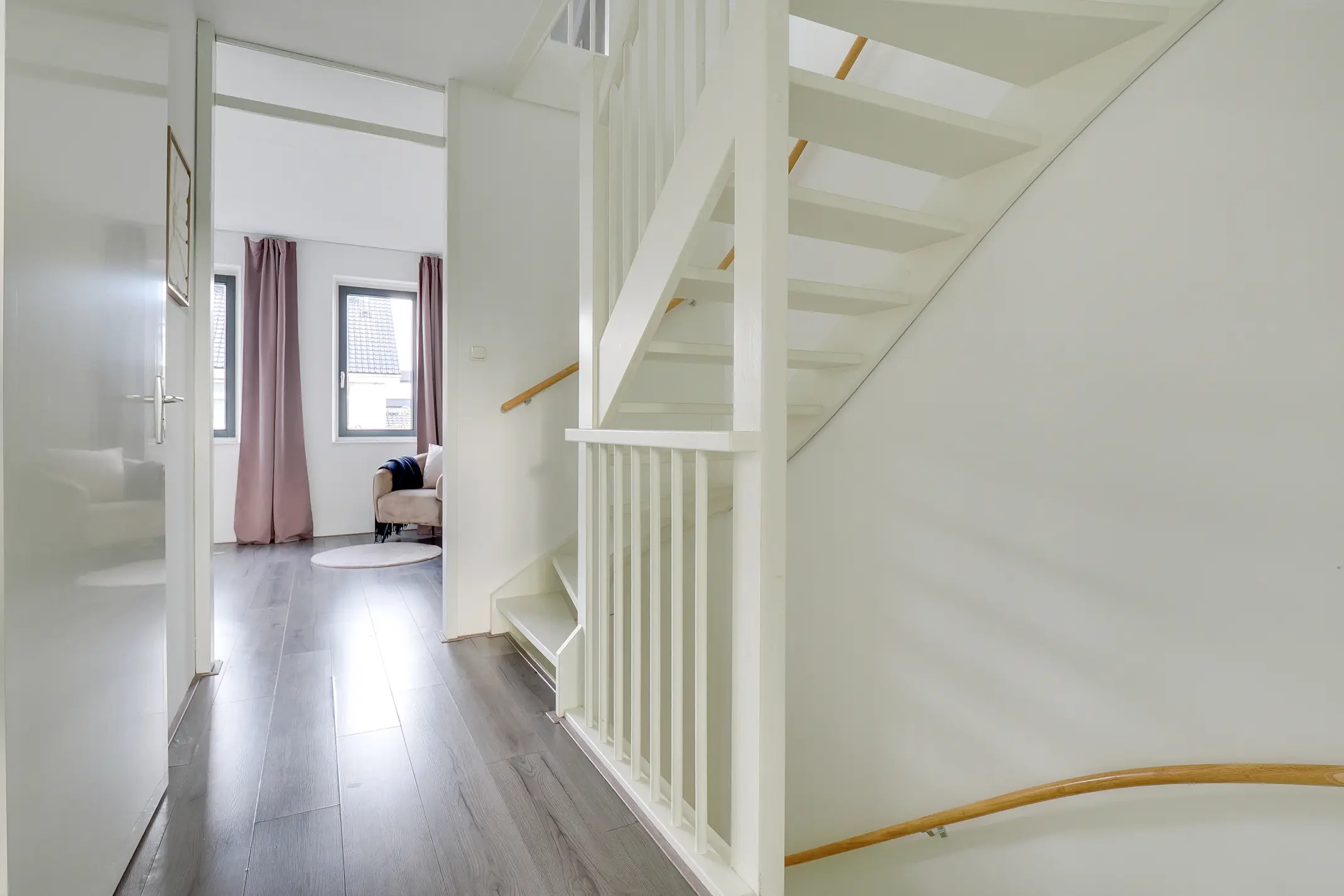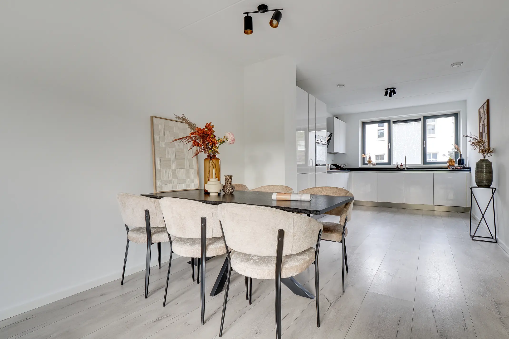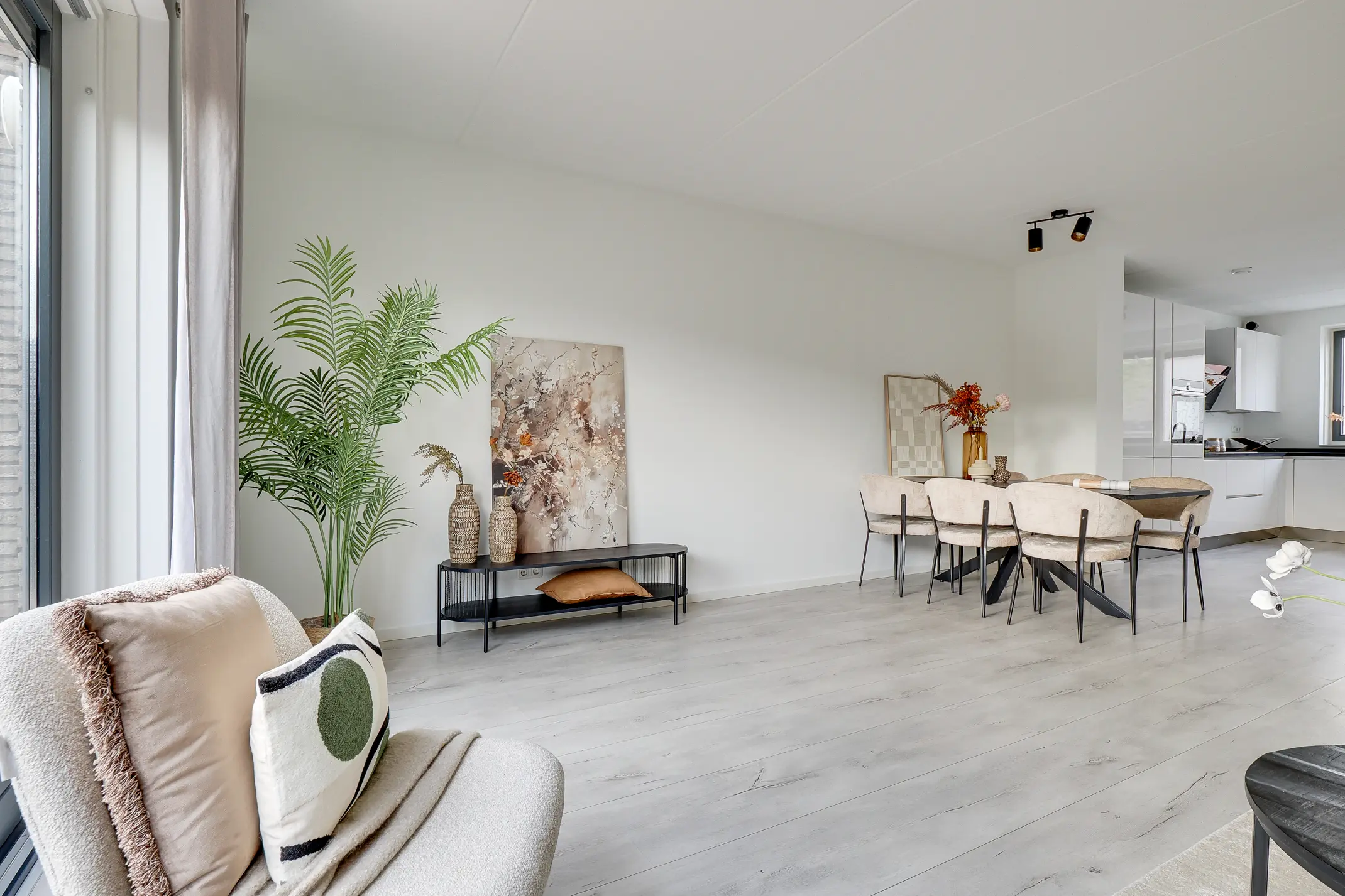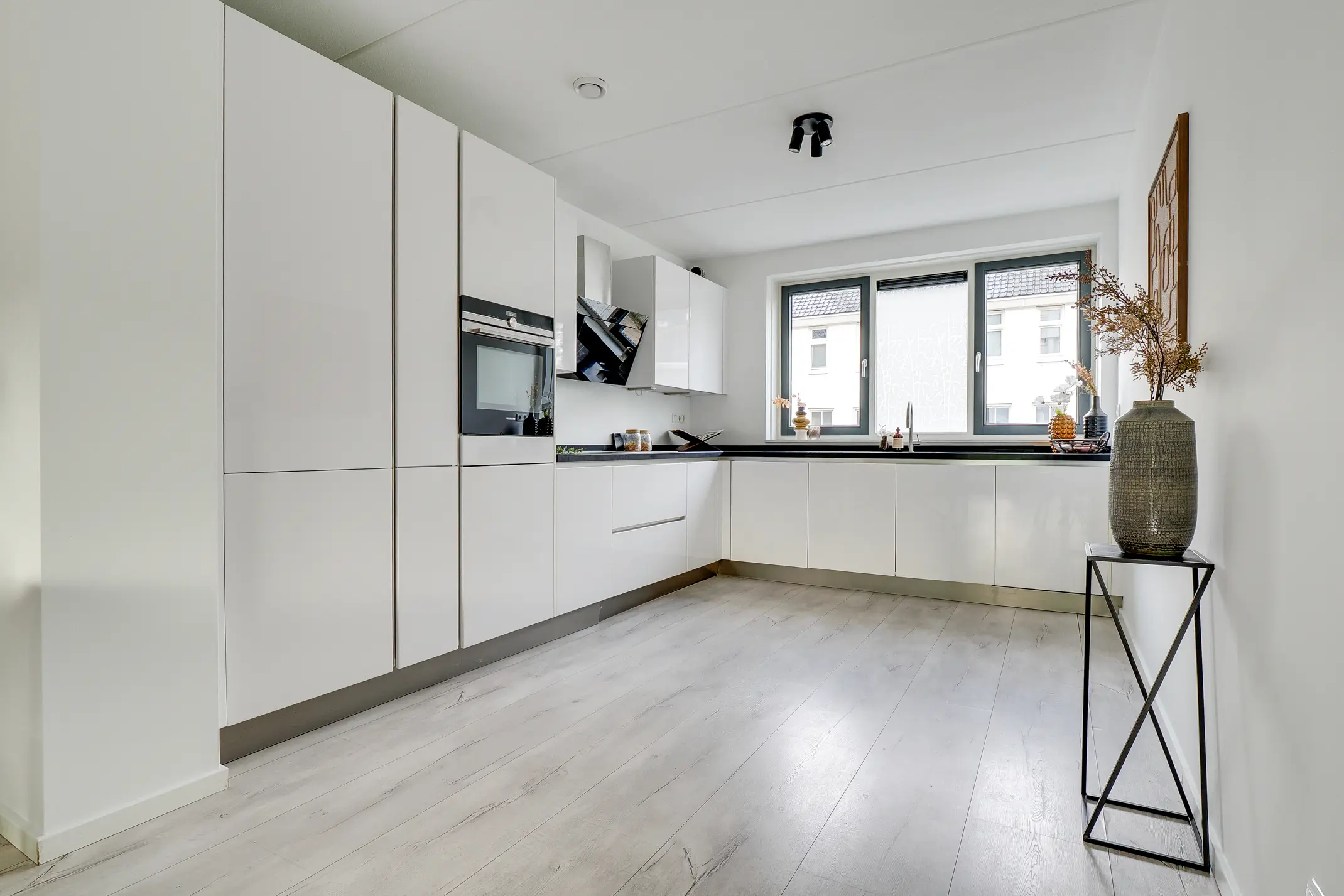 Aan de voorzijde ligt de moderne open Siemens keuken, volledig uitgerust met diverse Siemens inbouwapparatuur. De gehele begane grond is strak afgewerkt met een laminaatvloer en voorzien van vloerverwarming – comfortabel en onderhoudsvriendelijk.