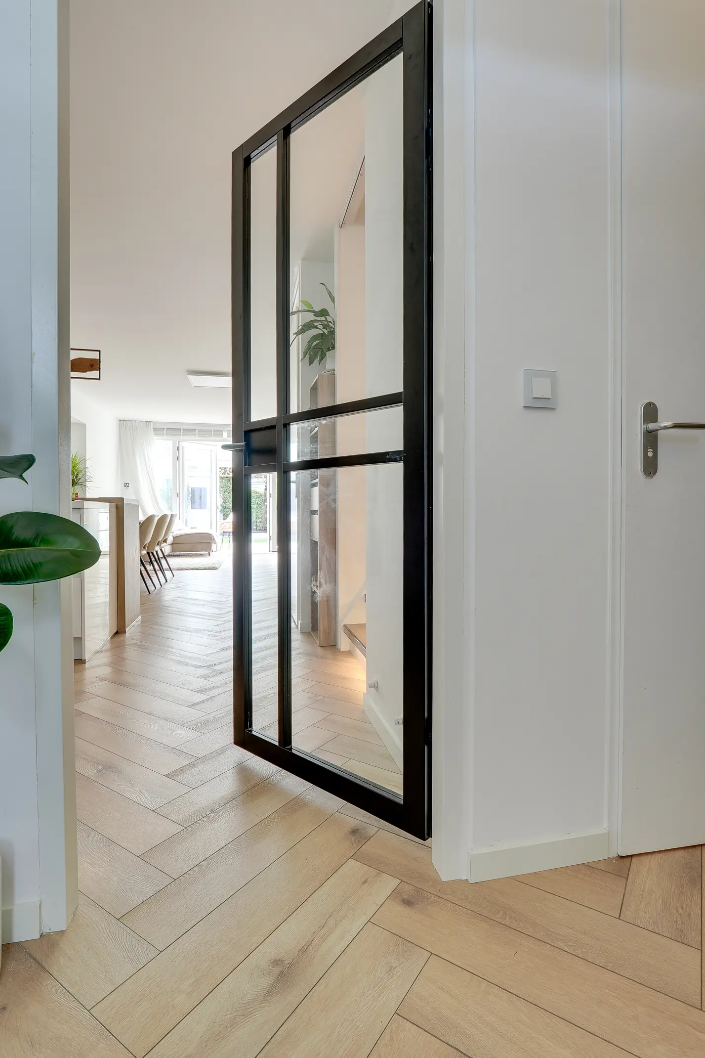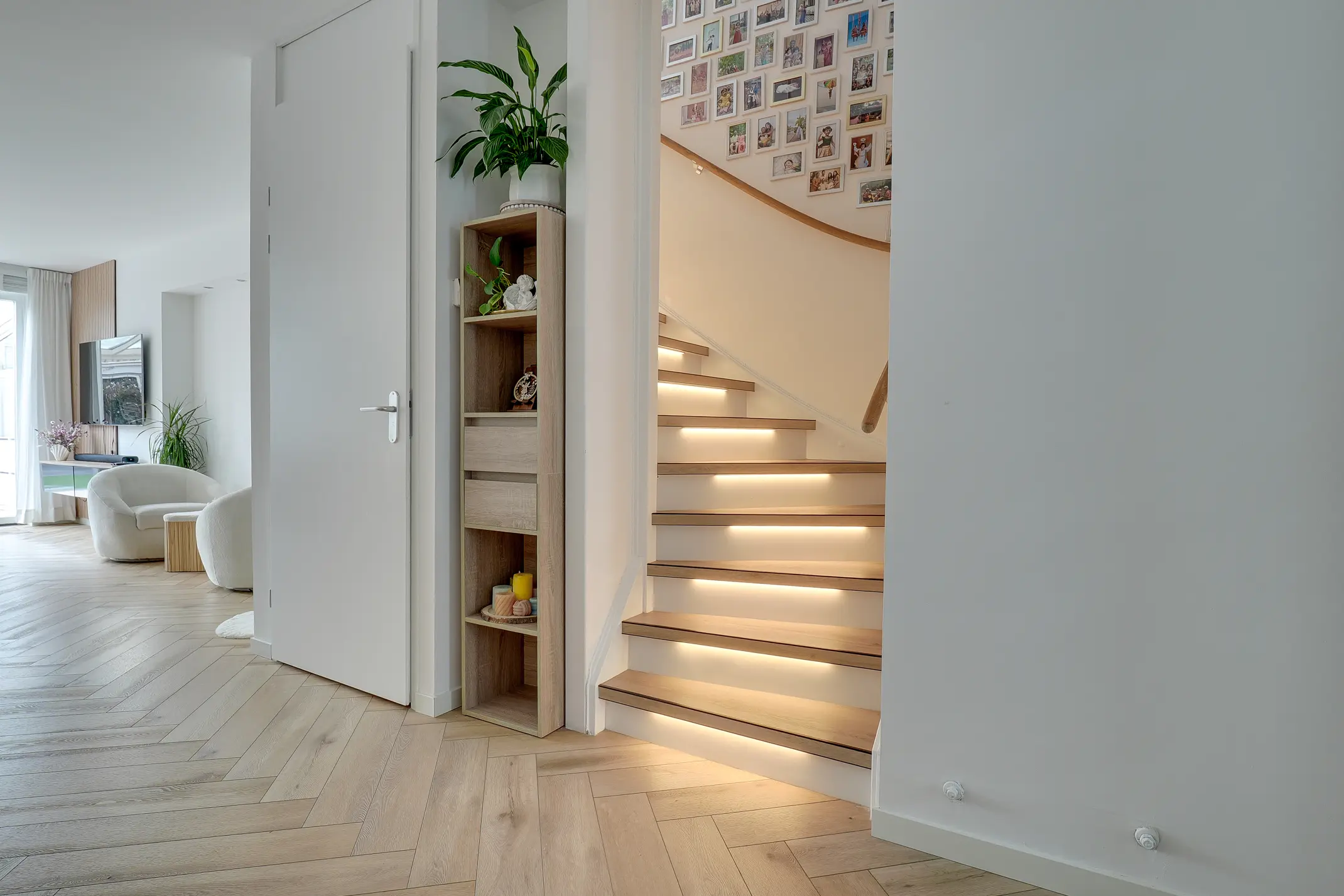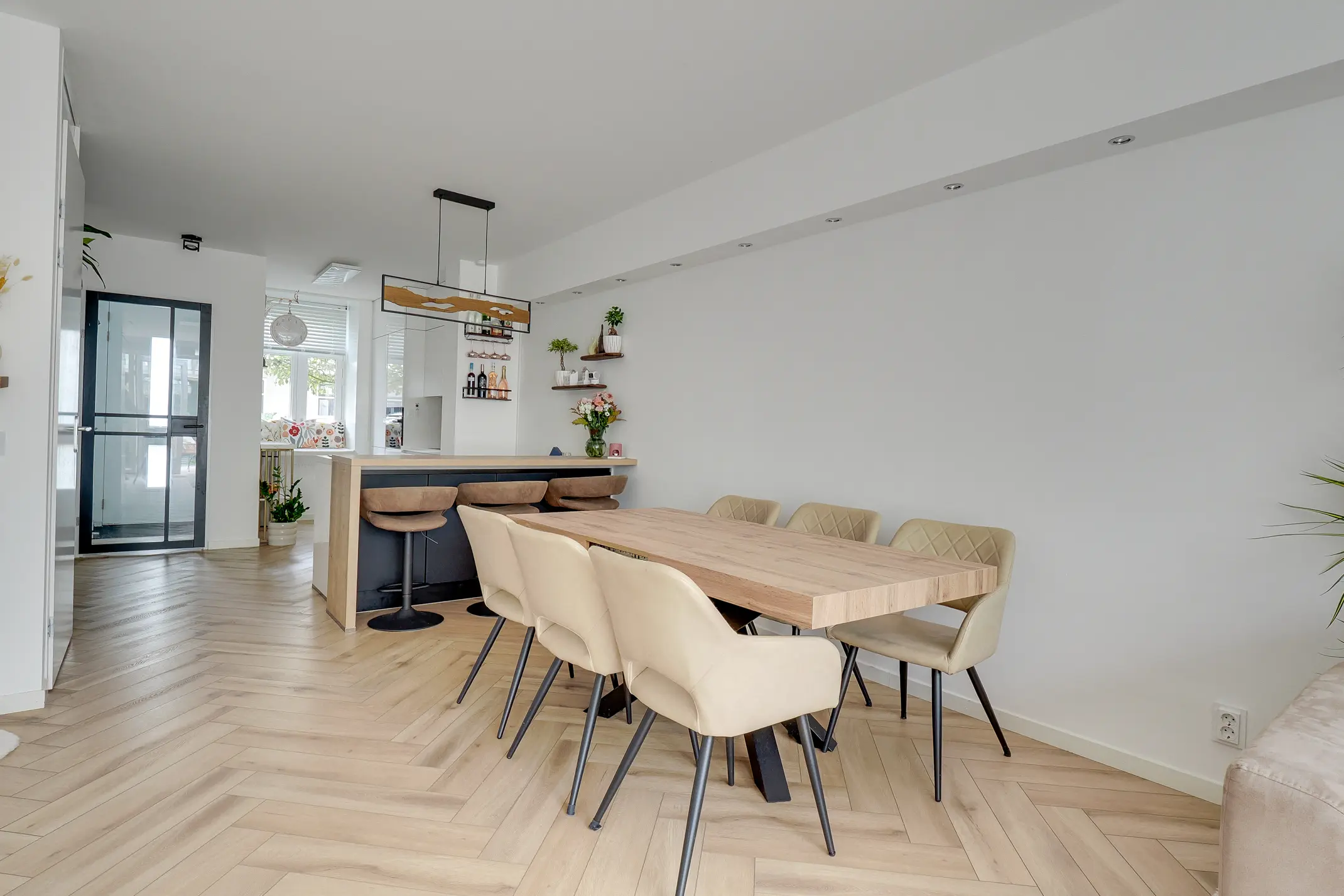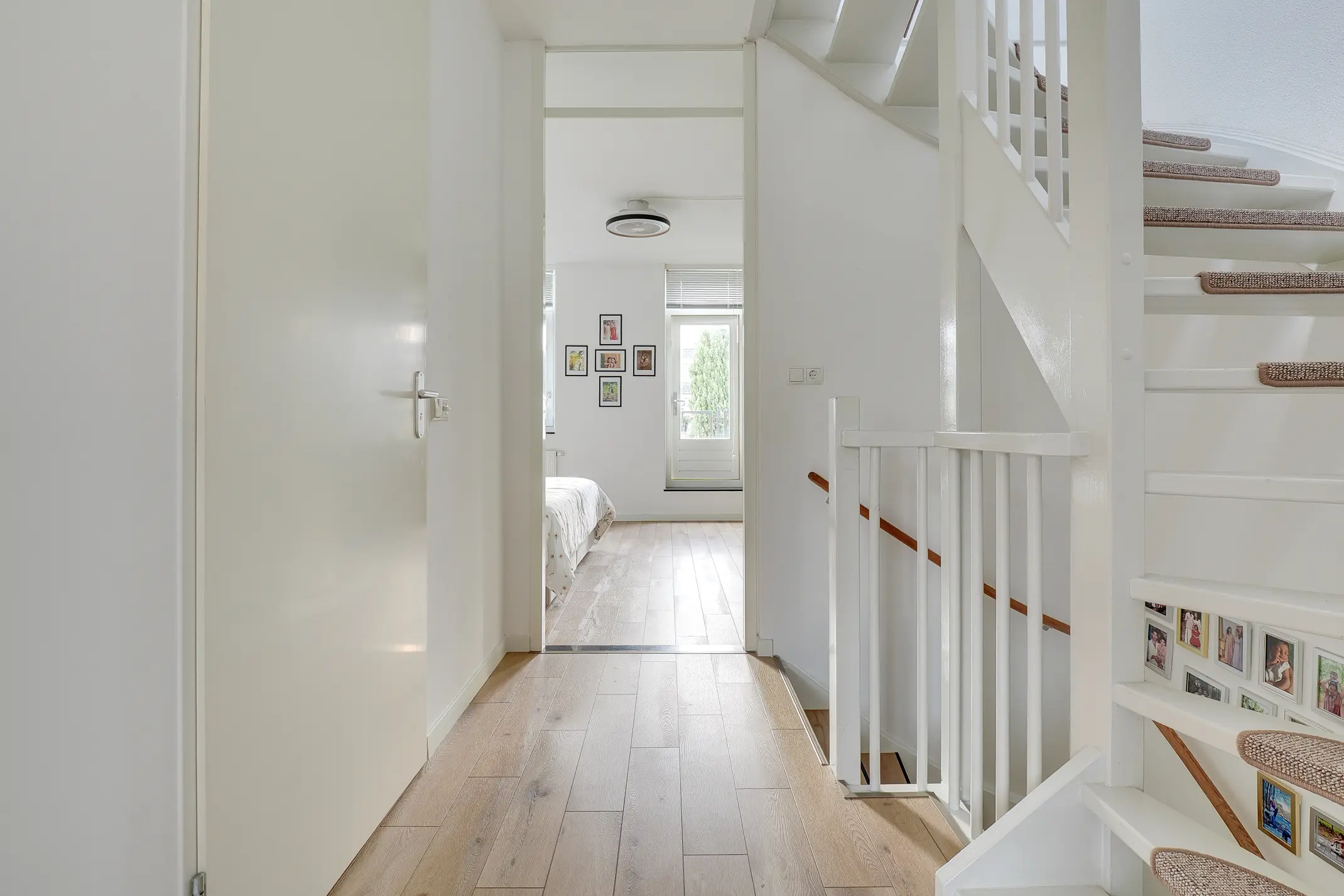 De begane grond is in 2023 volledig aangepakt met een nieuwe vloer, strak stucwerk, vernieuwde trap en toegang tot de fraaie overkapping aan de tuinzijde, waardoor binnen en buiten mooi in elkaar overlopen.
