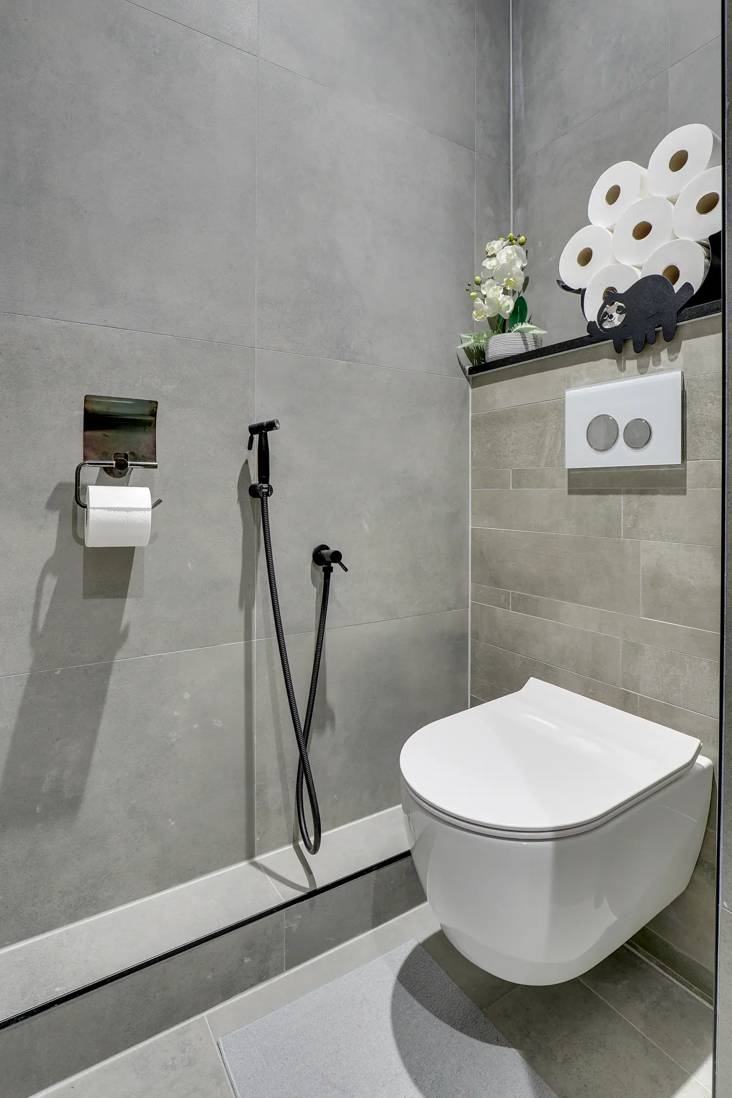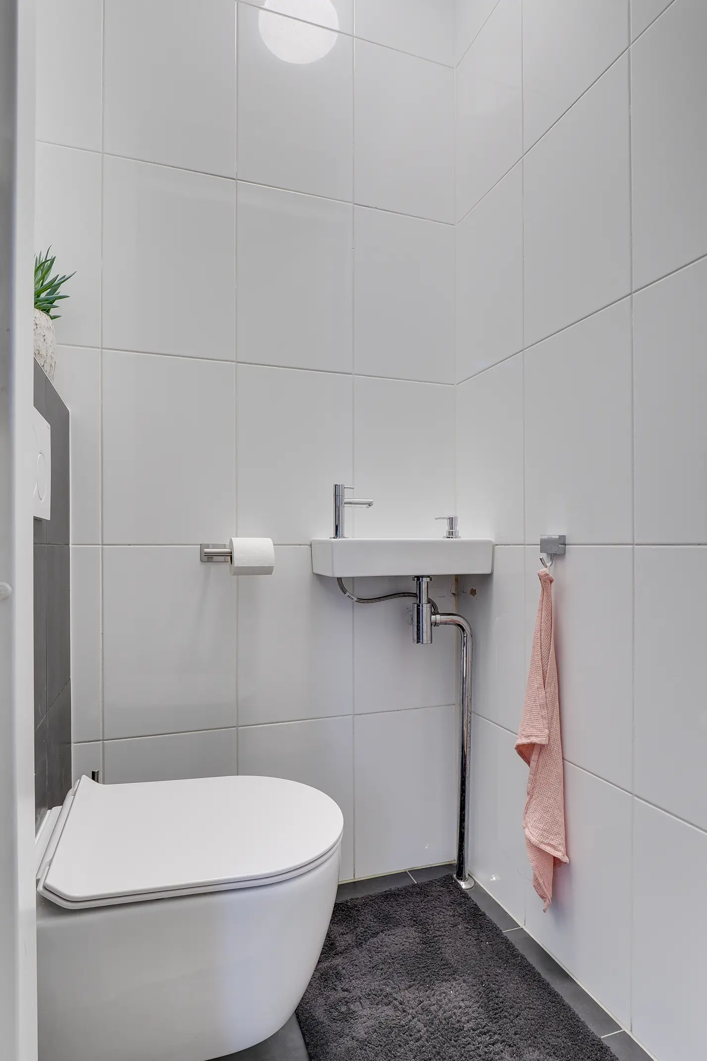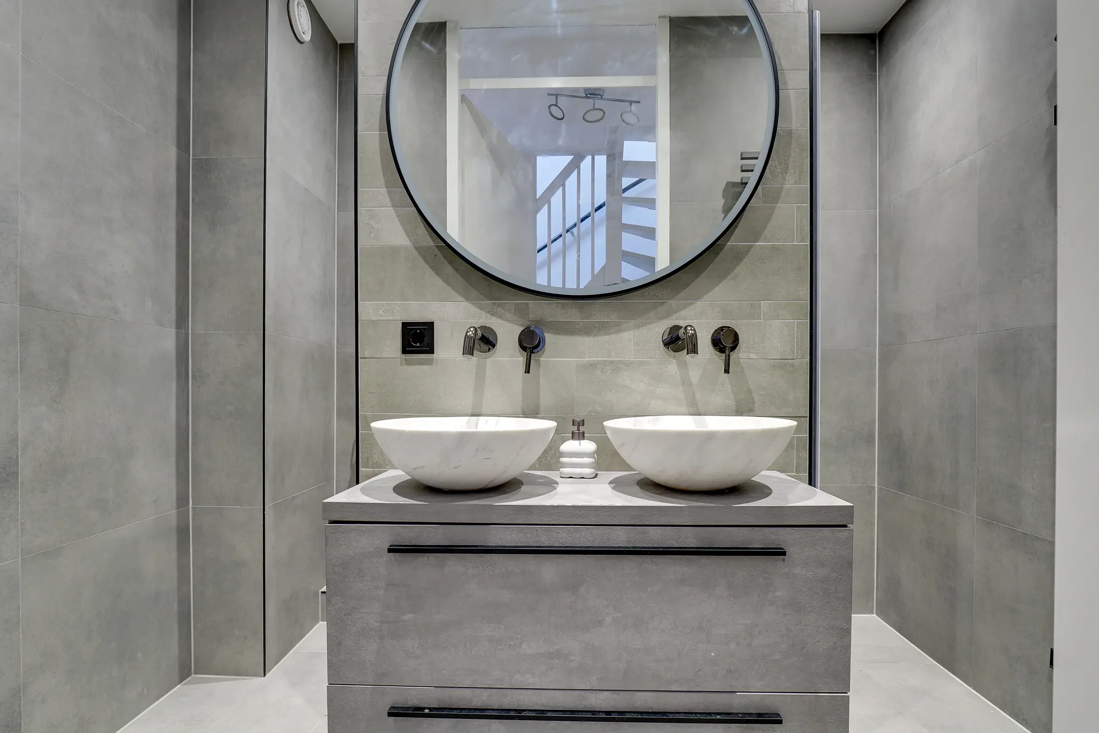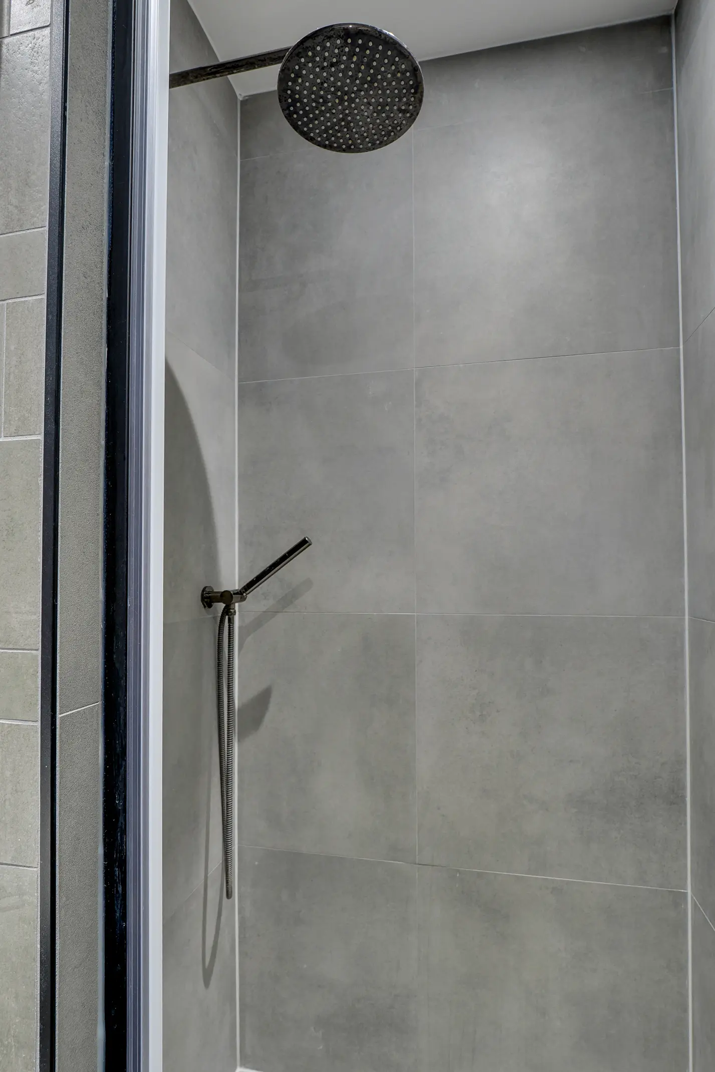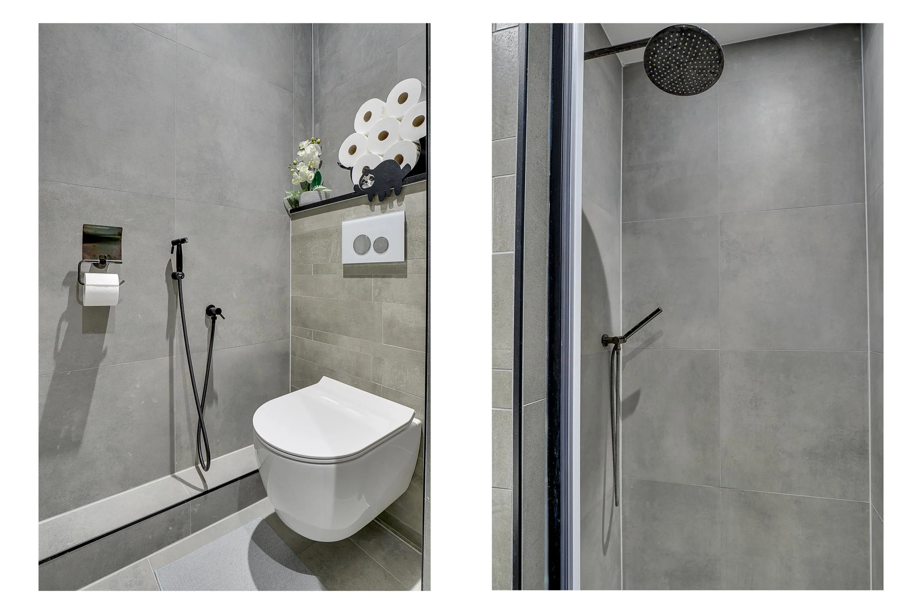 Twee slaapkamers en een moderne badkamer (2024) met inloopdouche, dubbele wastafel en tweede toilet.