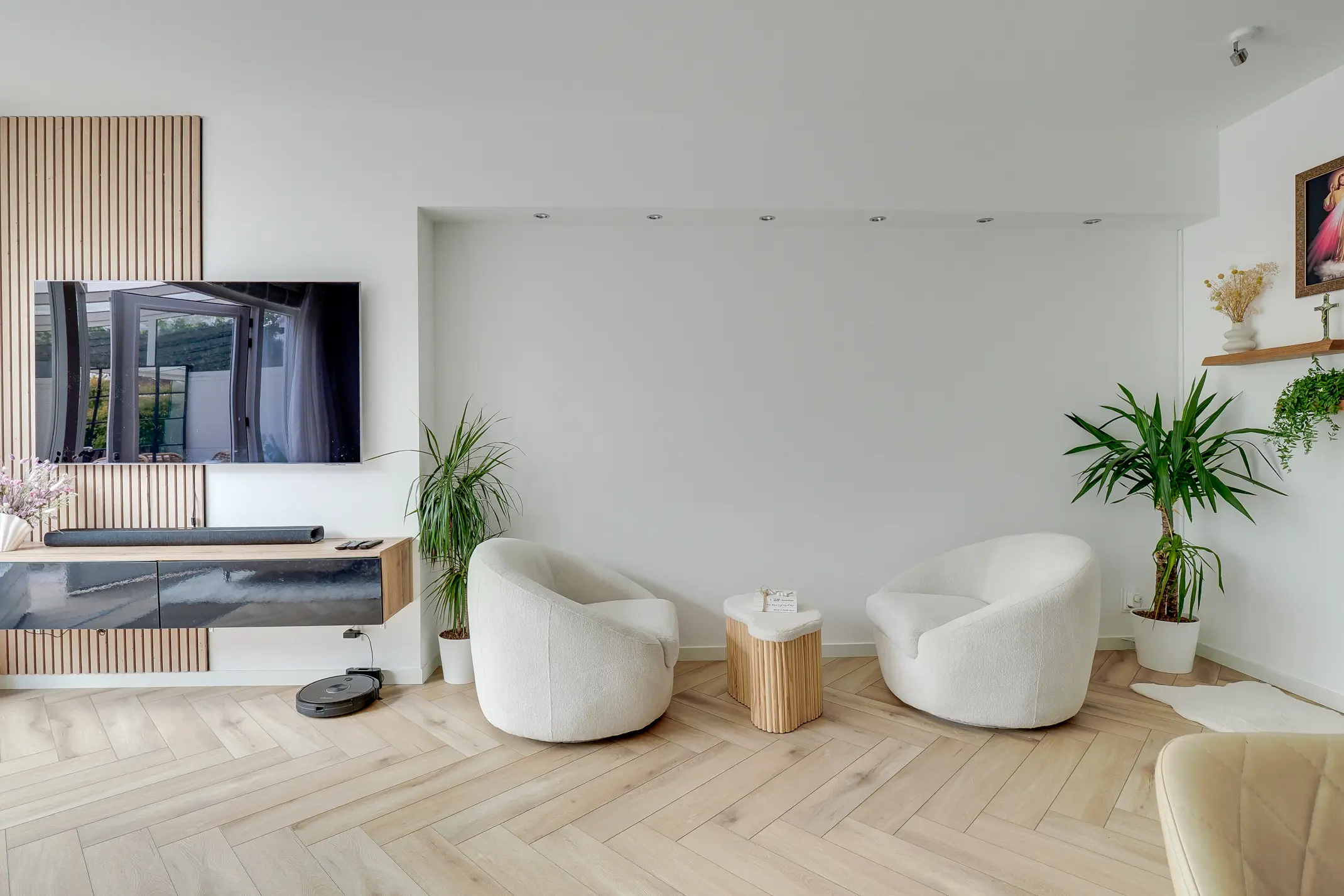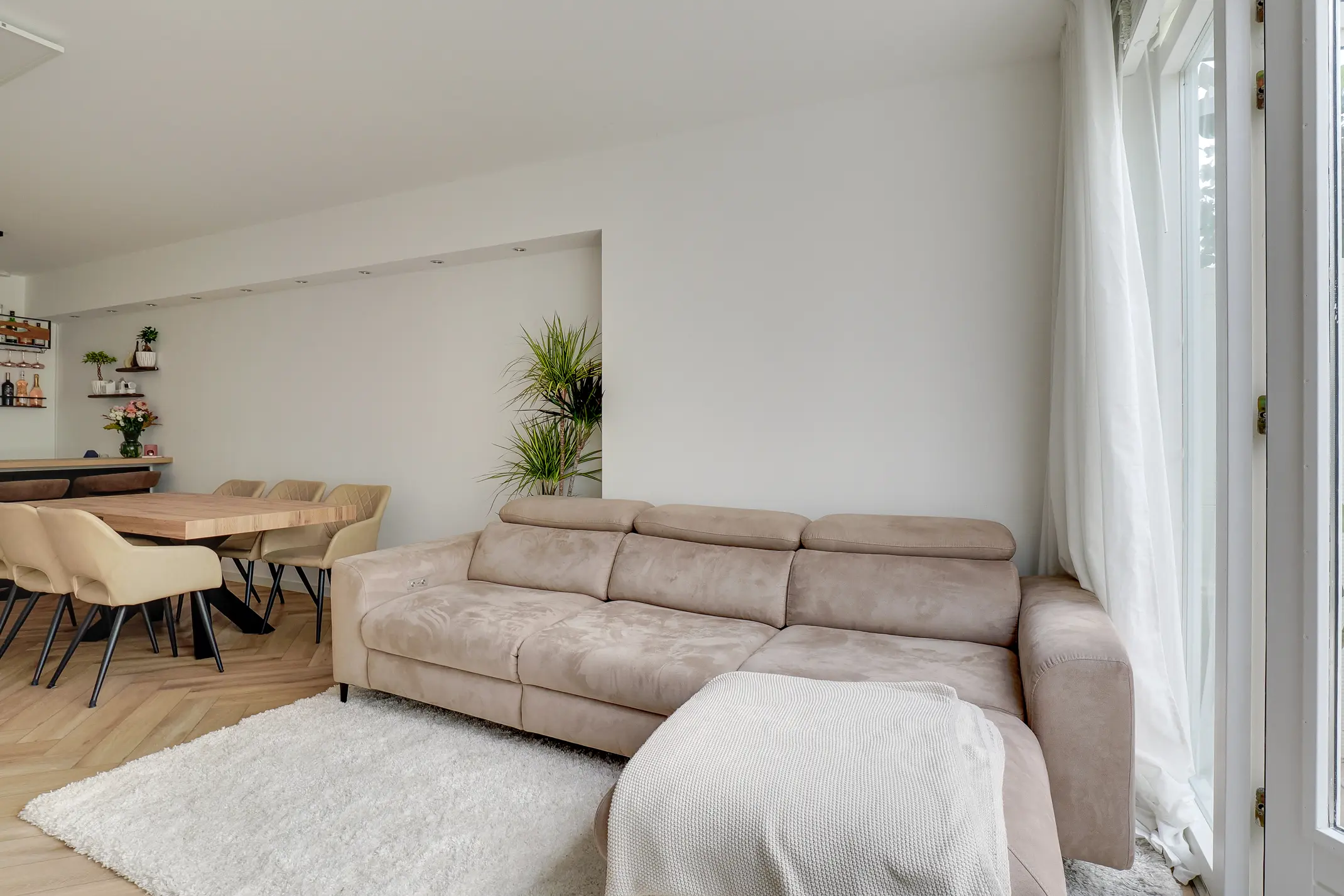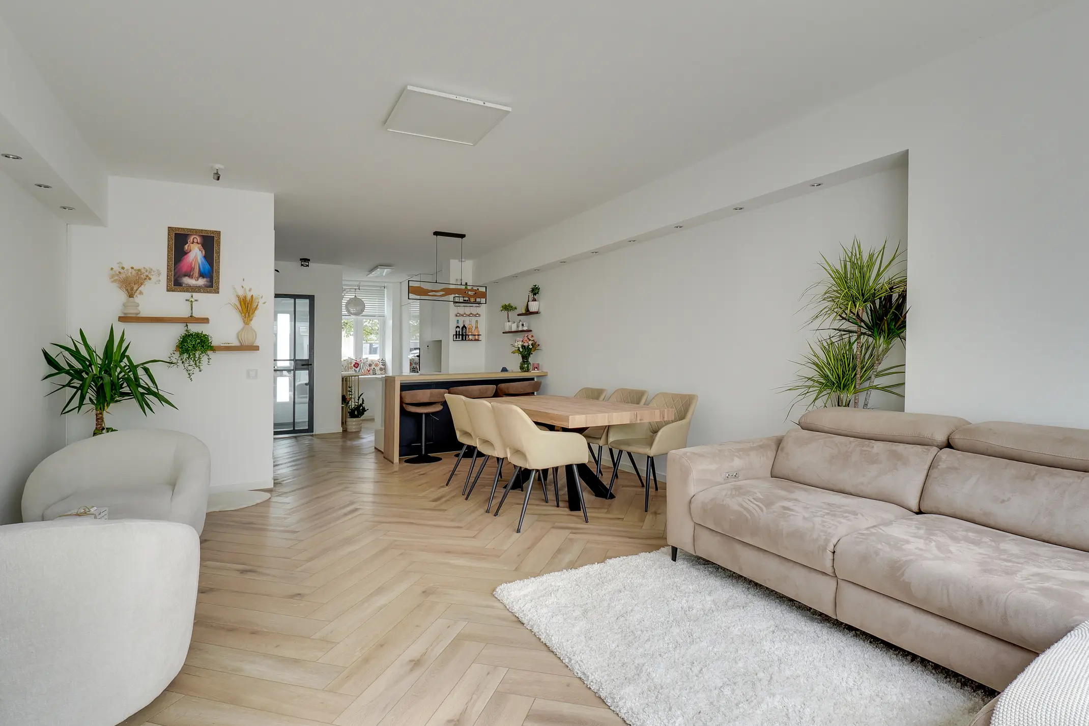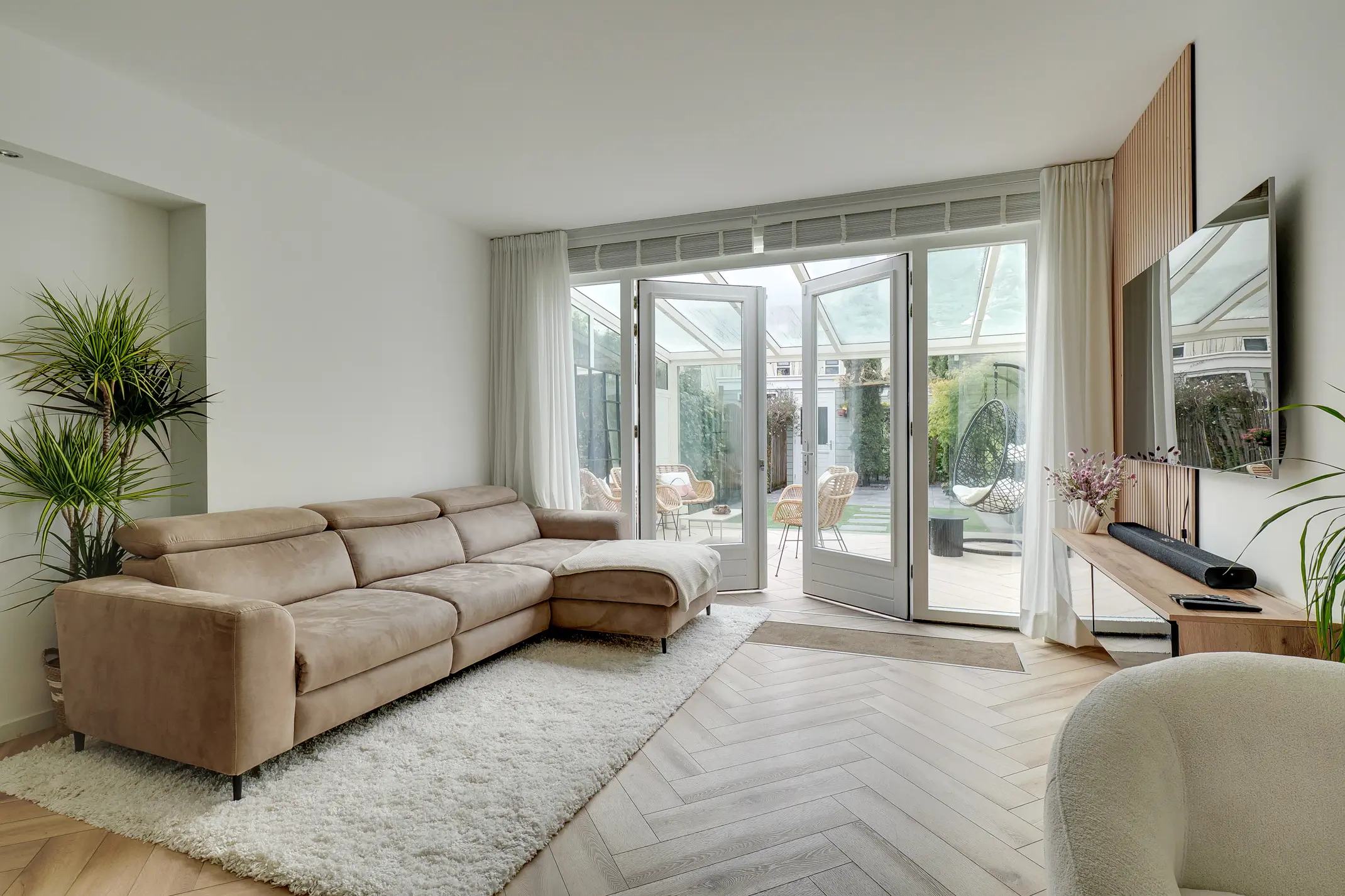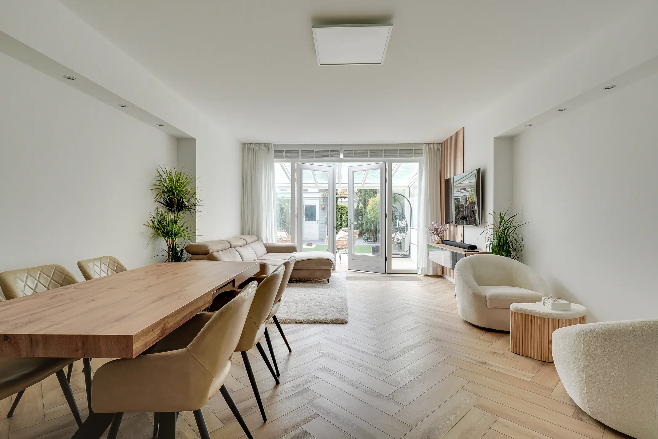 De lichte woonkamer met vloerverwarming vormt het hart van de woning. De grote raampartijen en dubbele deuren naar de tuin zorgen voor een heerlijke lichtinval.
