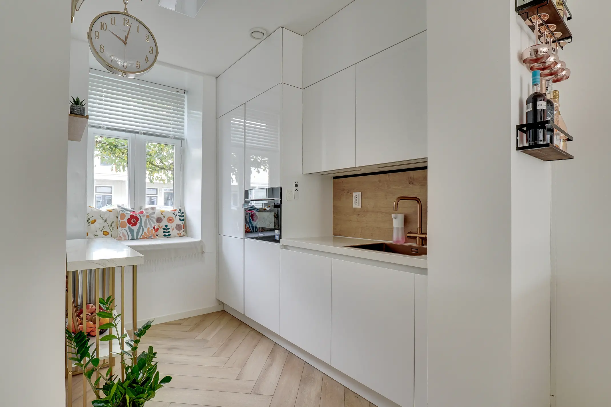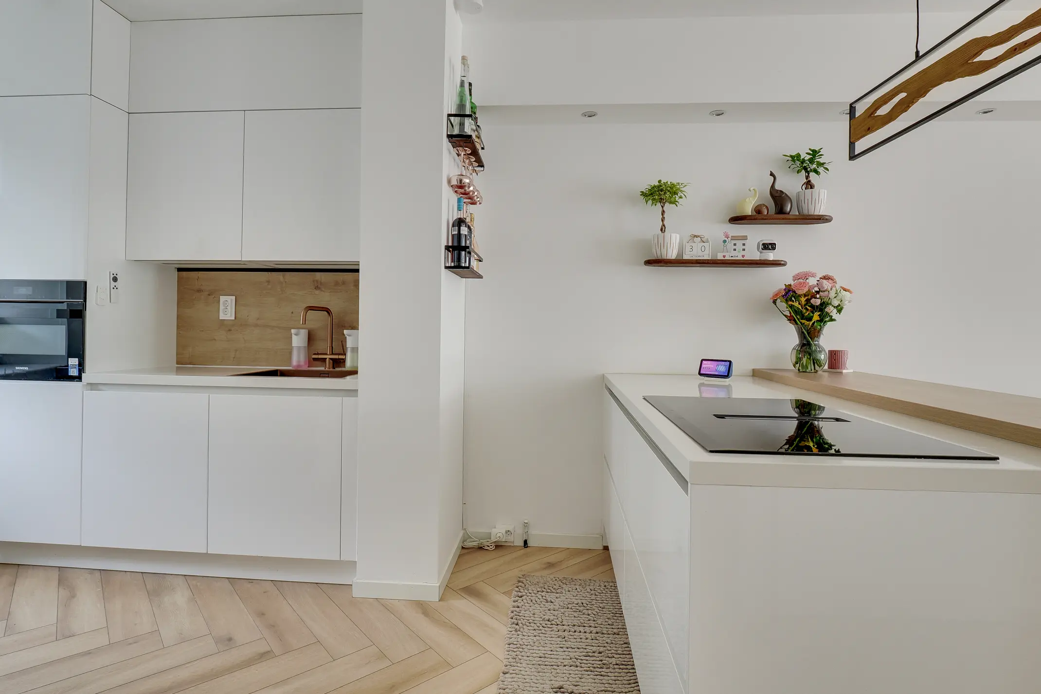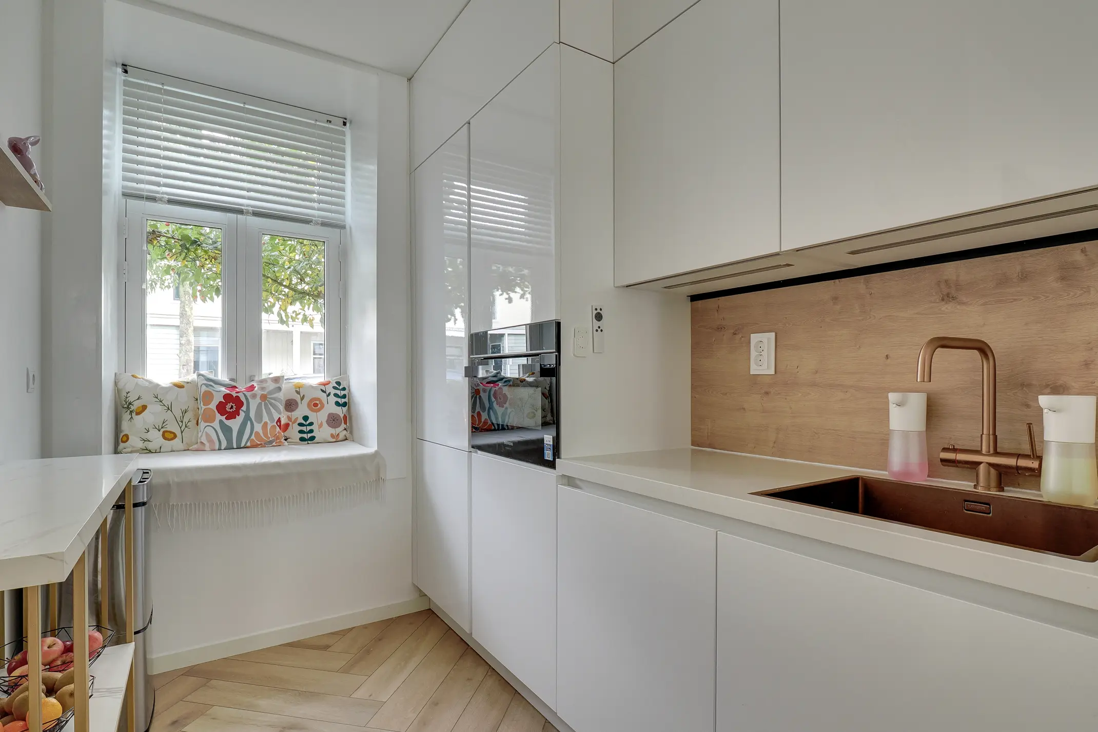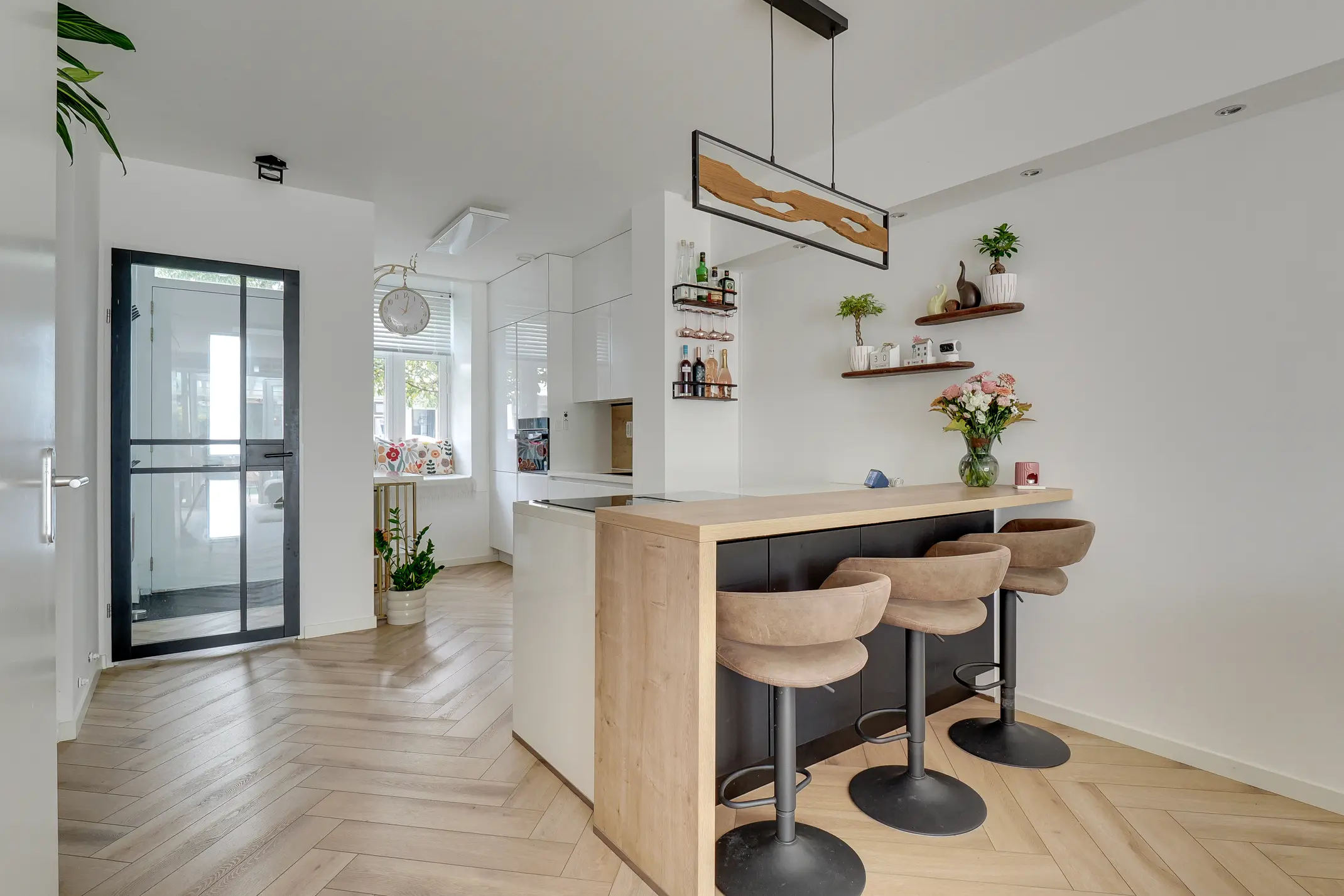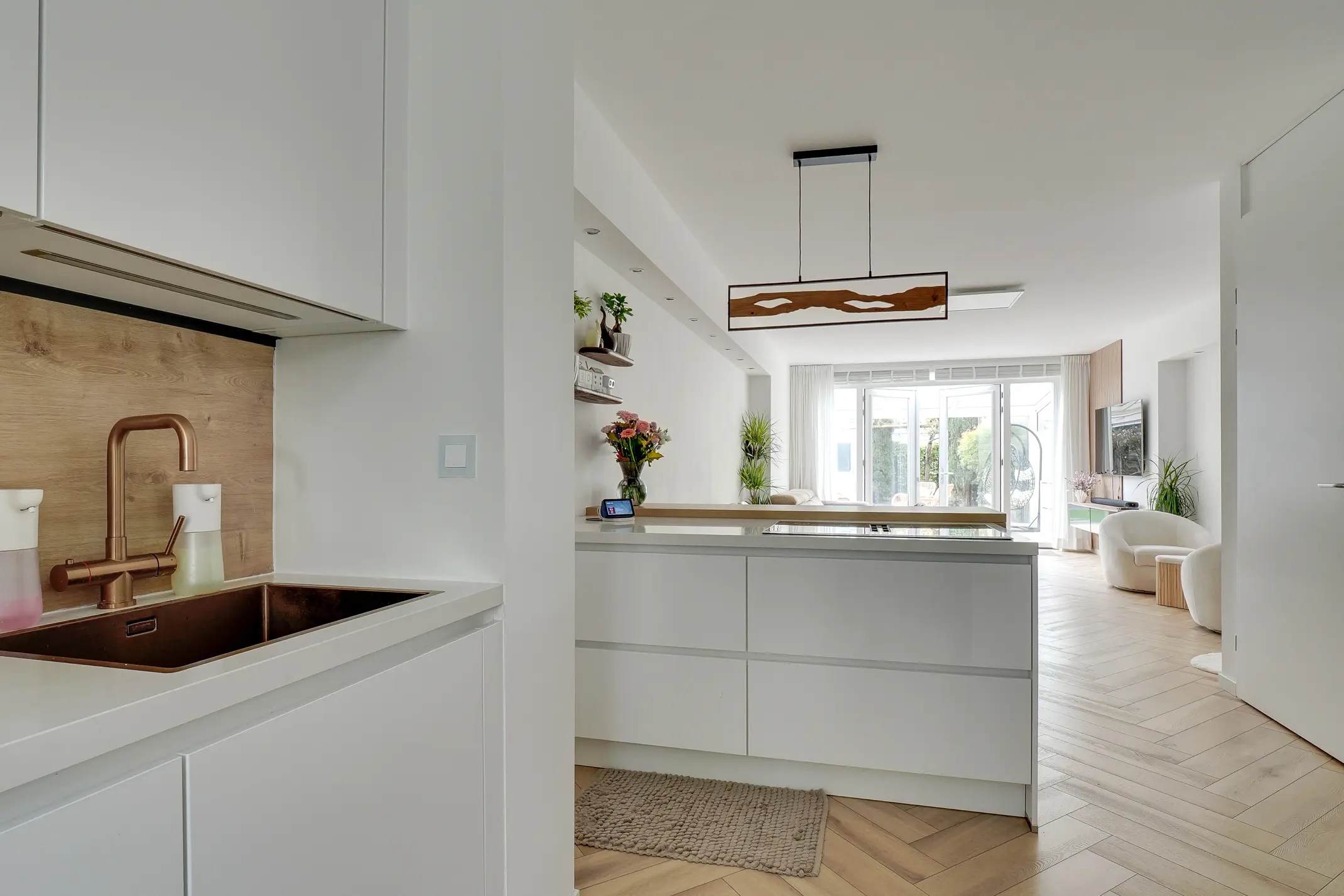 Aan de voorzijde ligt de open woonkeuken (2024), uitgerust met Siemens inbouwapparatuur met Home Connect en een Selsiuz heetwaterkraan, ideaal voor de moderne kookliefhebber.