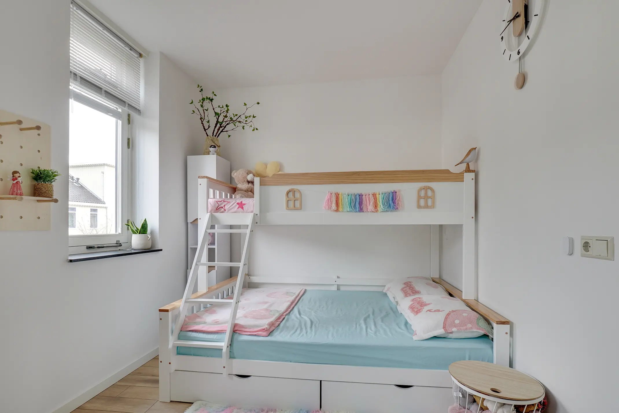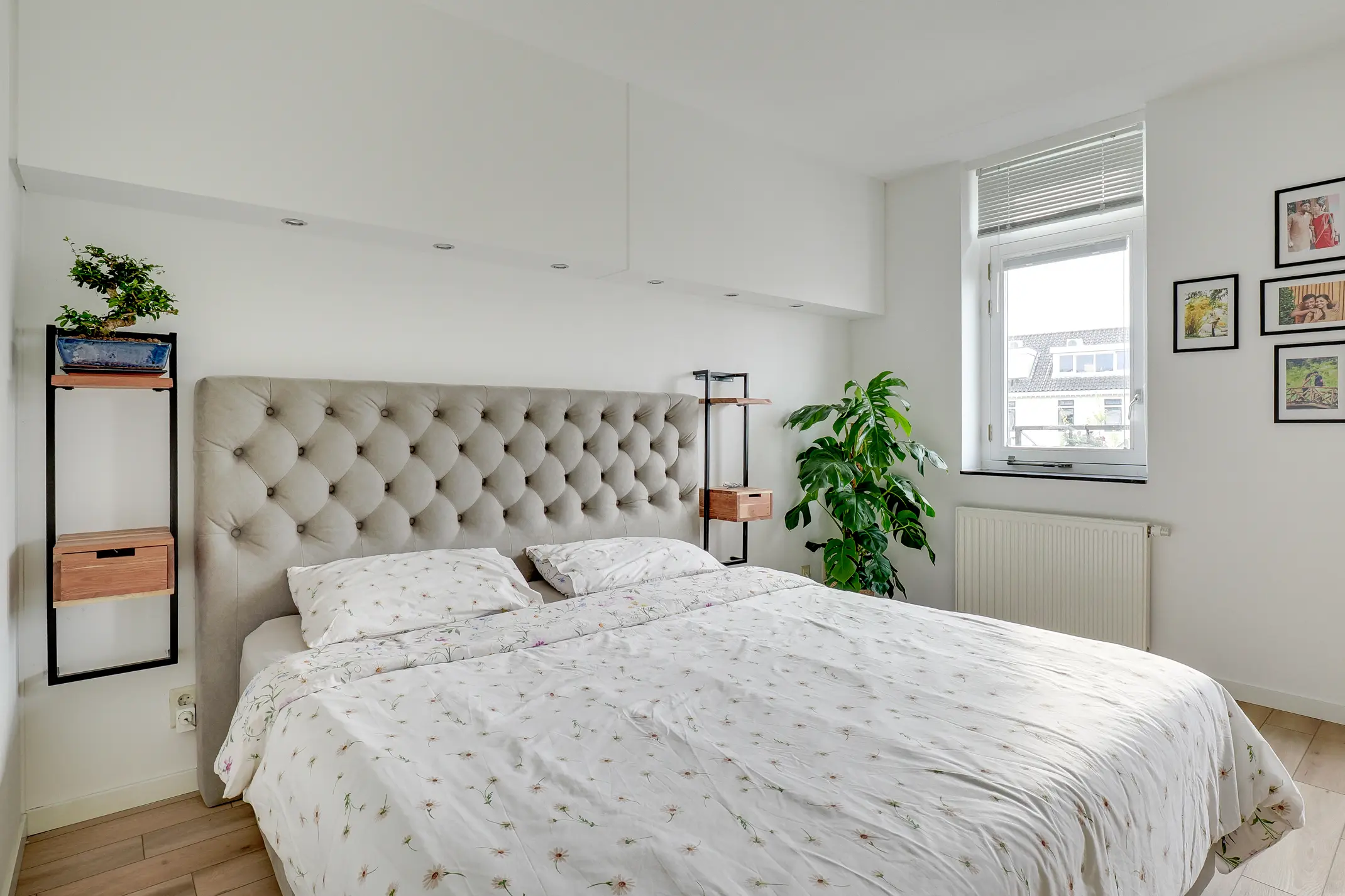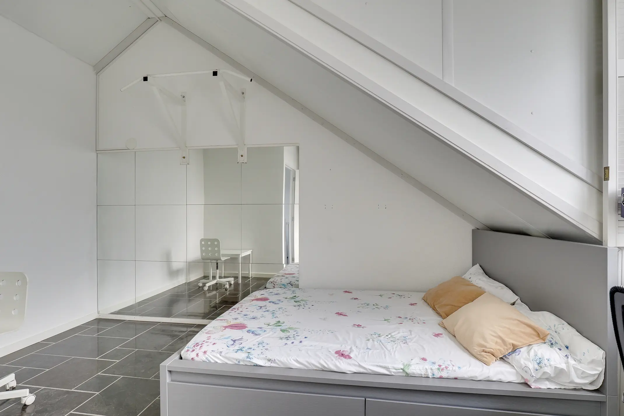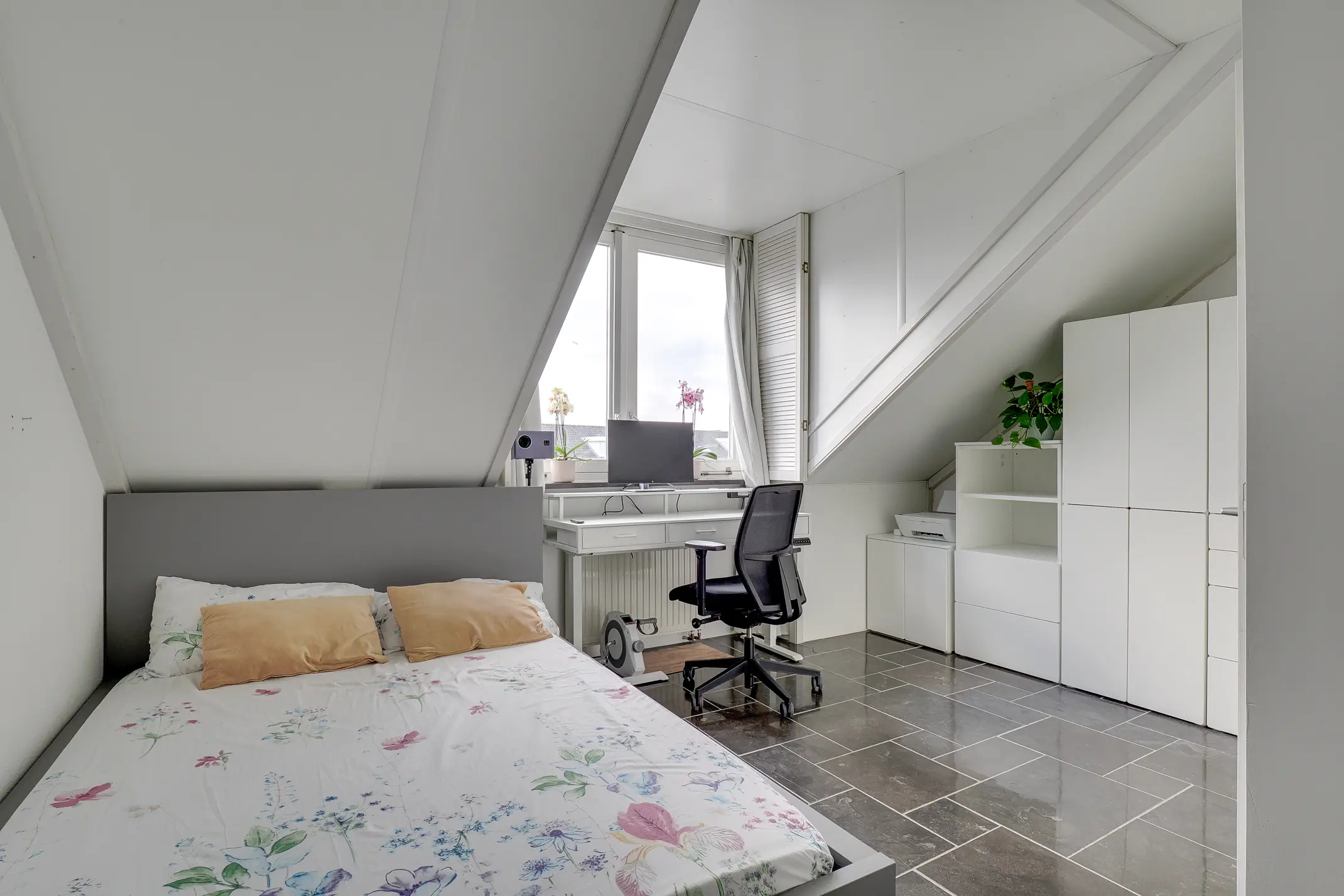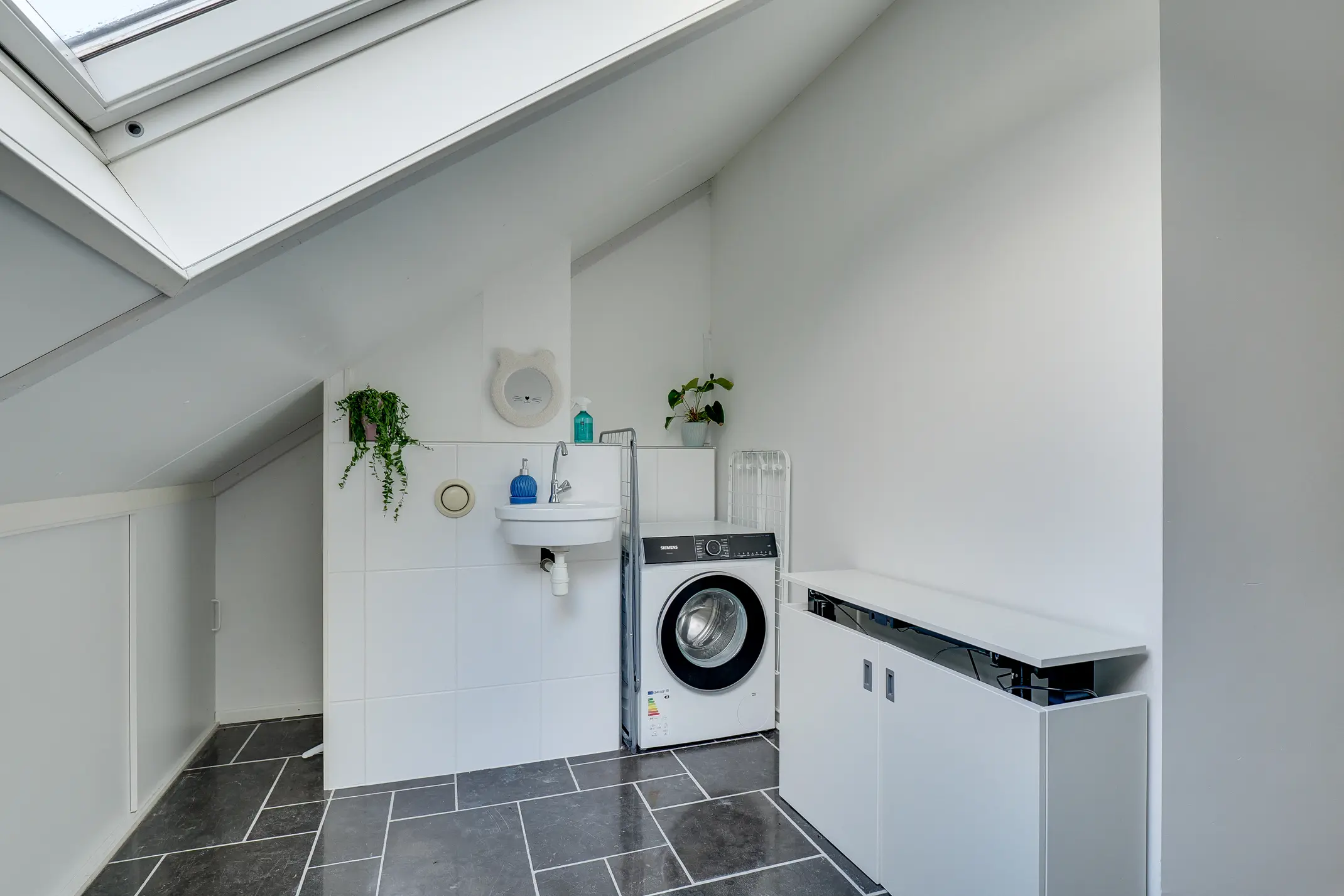 Derde slaapkamer met dakkapel en aparte wasruimte met aansluitingen voor wasmachine en droger. Deze verdieping is ideaal in te delen als logeer- of werkkamer, met praktische bergruimte onder het schuine dak.