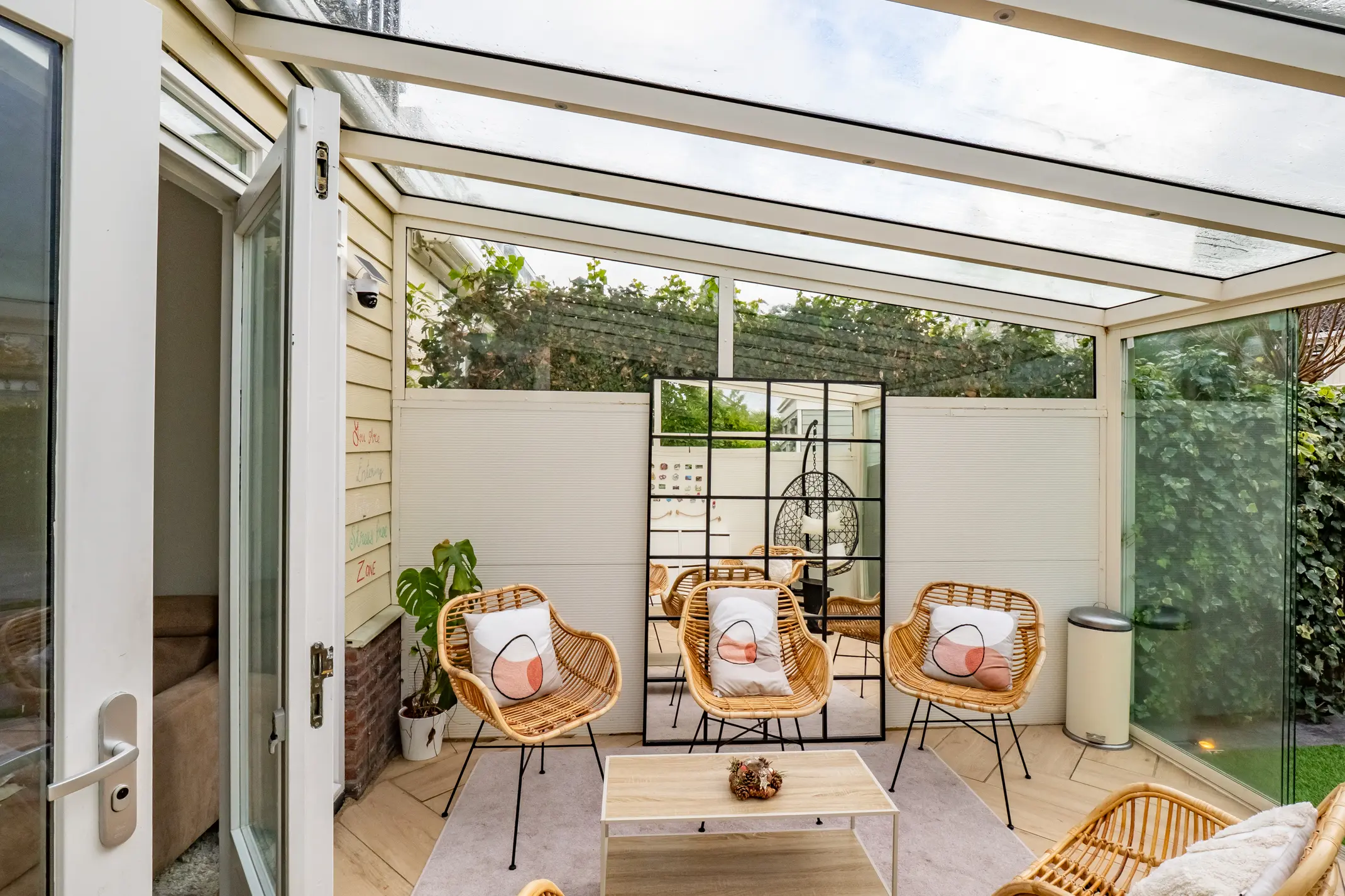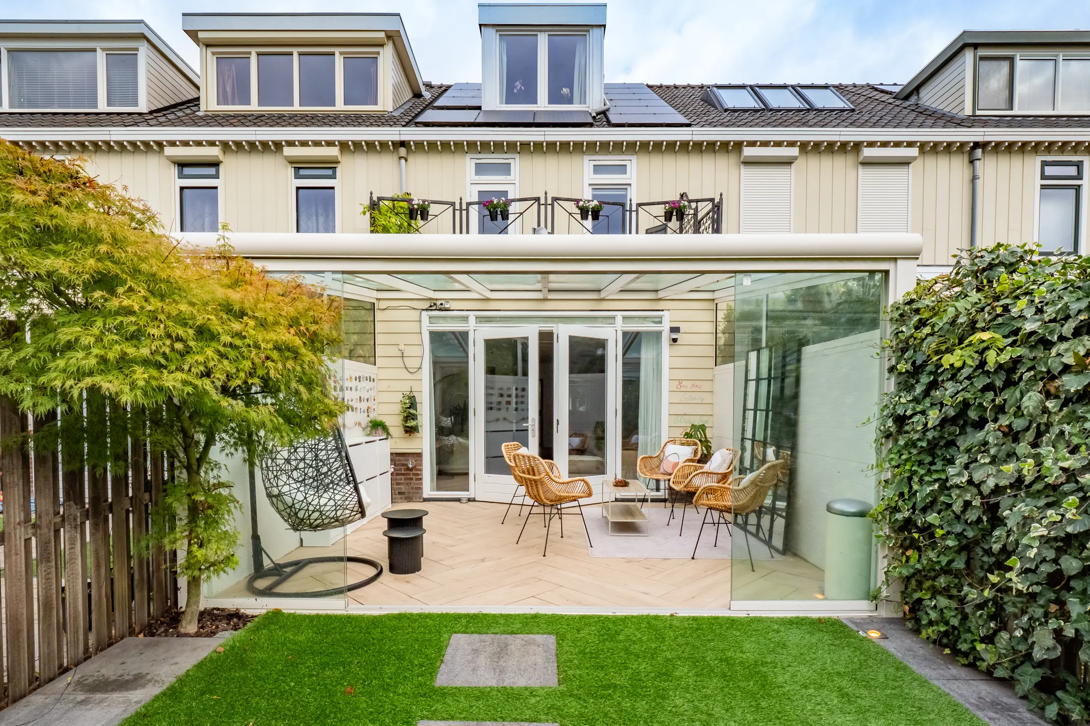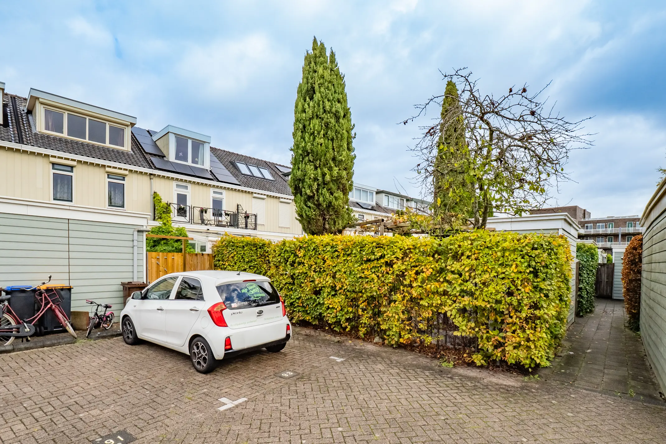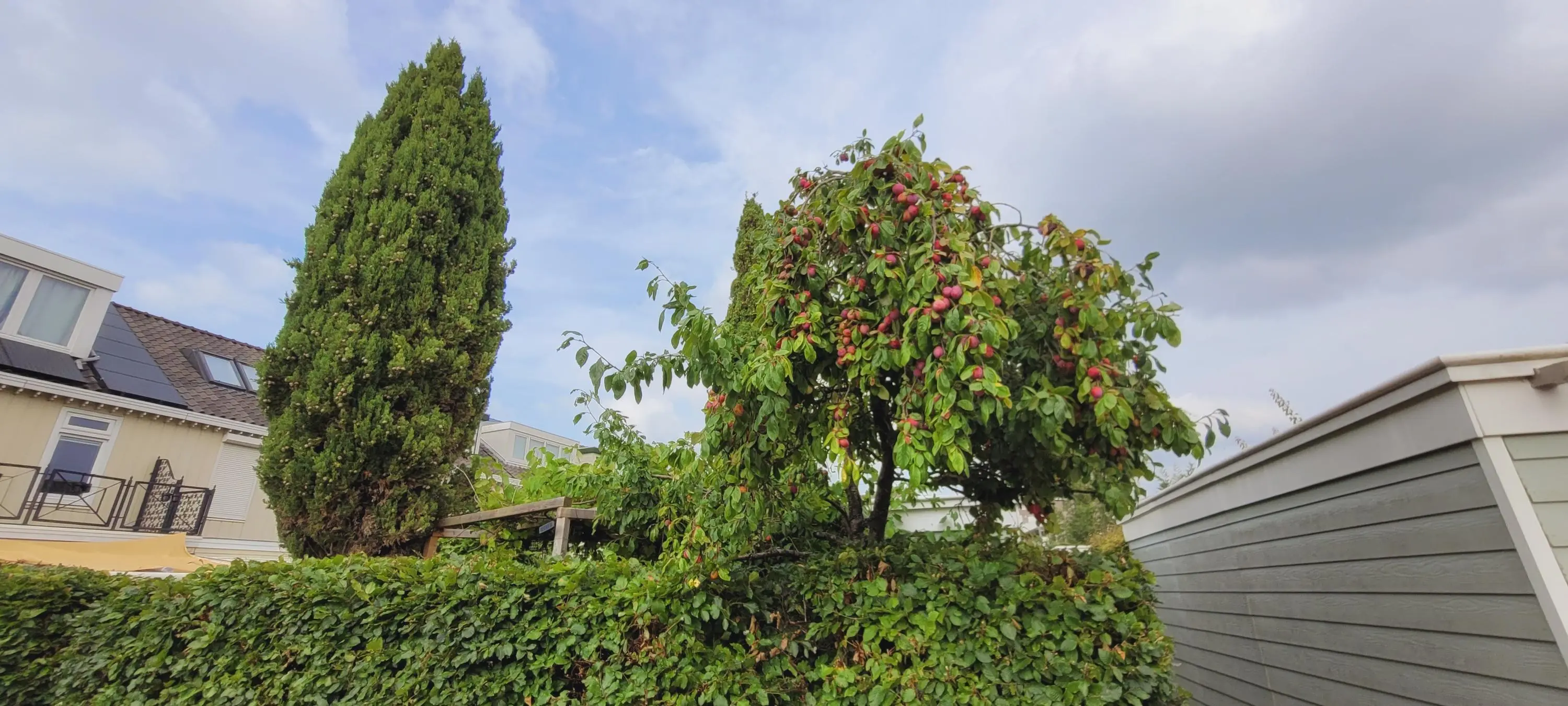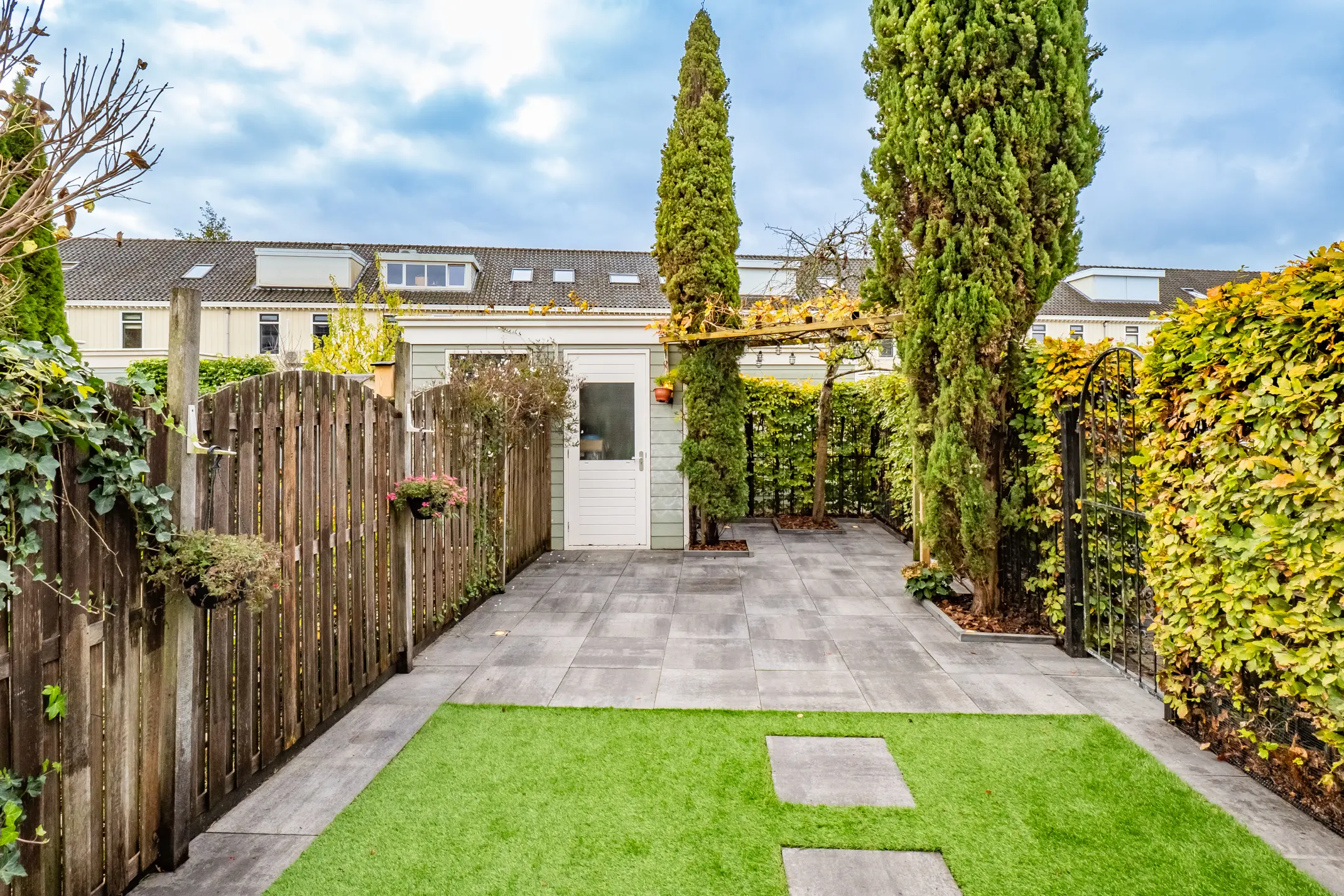 De verzorgde, diepe achtertuin (ca. 15 meter) ligt op het zuidoosten en is in 2023 volledig vernieuwd. Je vindt er een gezellige overkapping, een pergola begroeid met druiven, een pruimenboom, pijnbomen en een vrijstaande houten berging. Dankzij de achterom is de tuin praktisch én sfeervol.