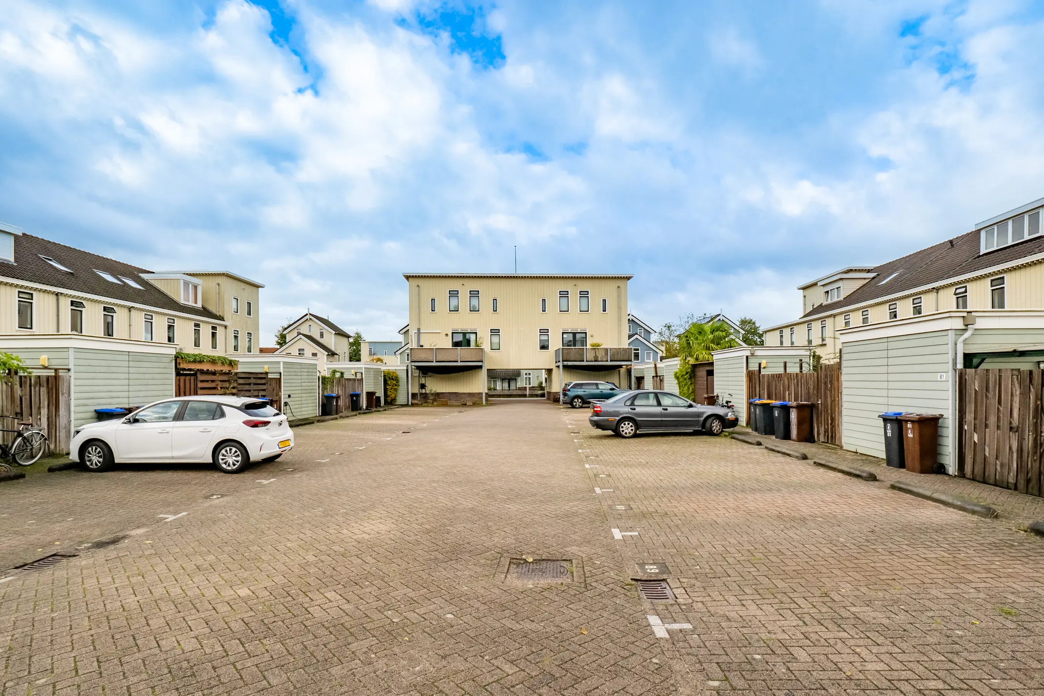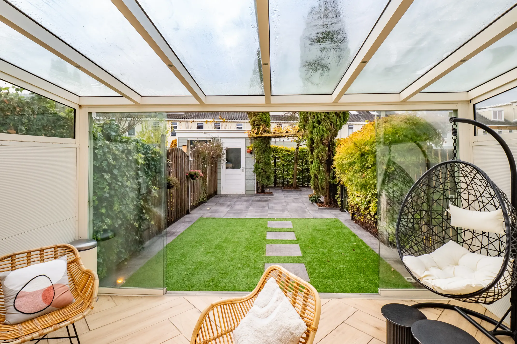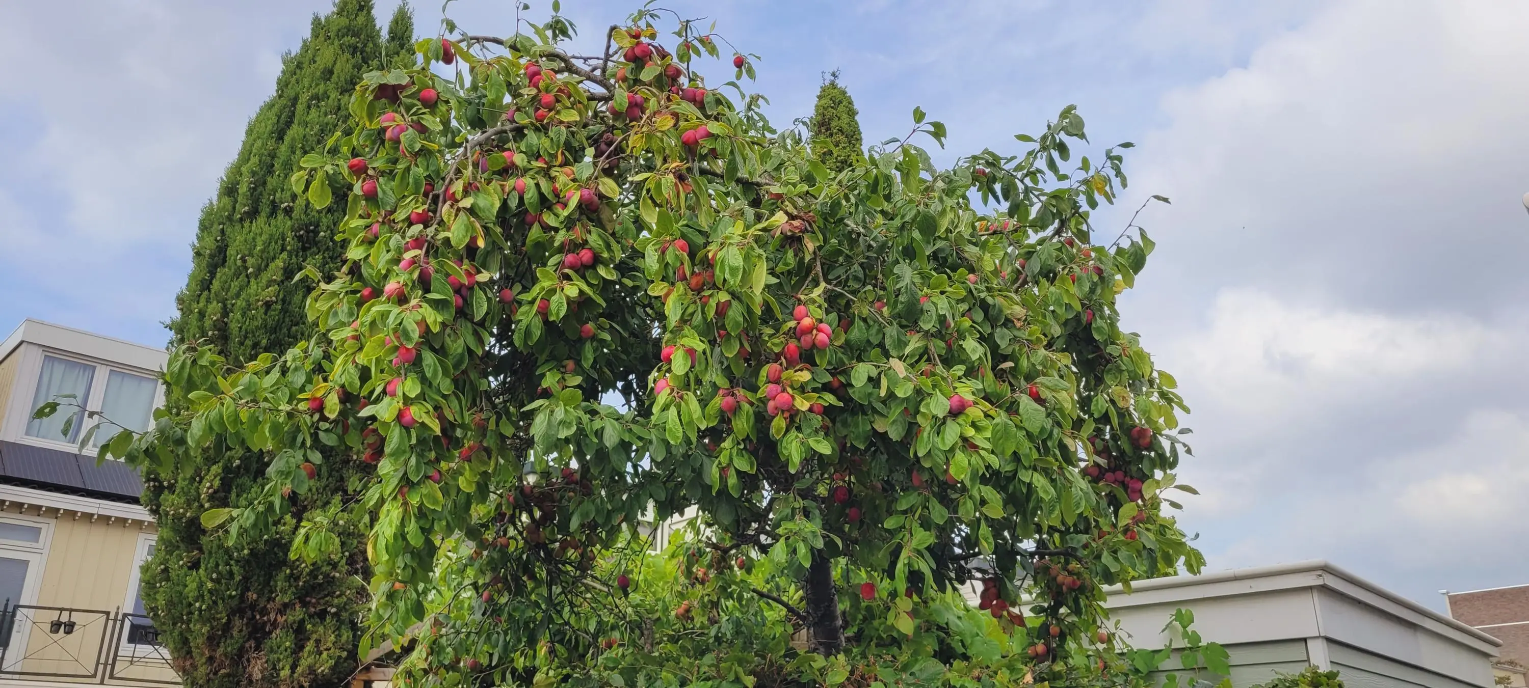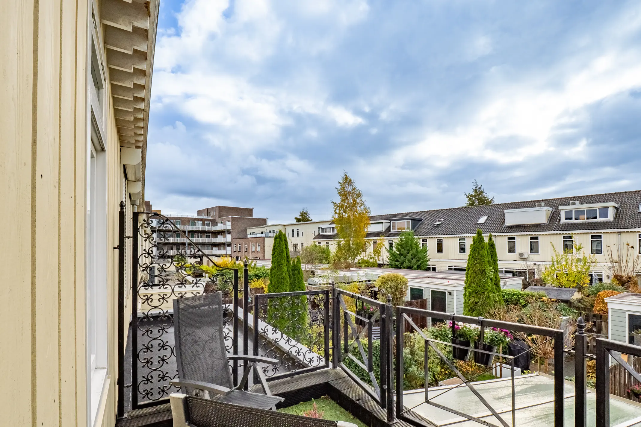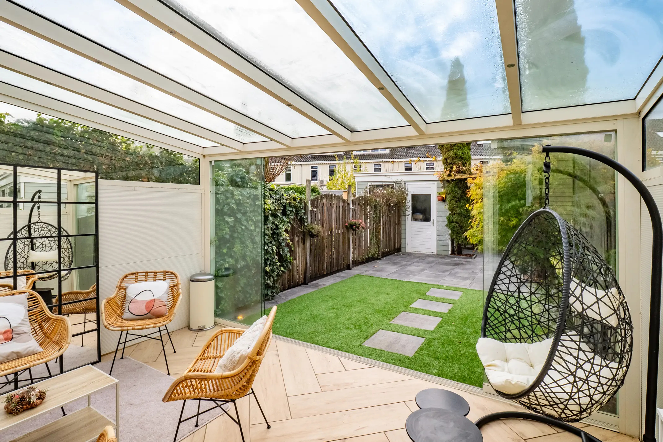 De verzorgde, diepe achtertuin (ca. 15 meter) ligt op het zuidoosten en is in 2023 volledig vernieuwd. Je vindt er een gezellige overkapping, een pergola begroeid met druiven, een pruimenboom, pijnbomen en een vrijstaande houten berging. Dankzij de achterom is de tuin praktisch én sfeervol.