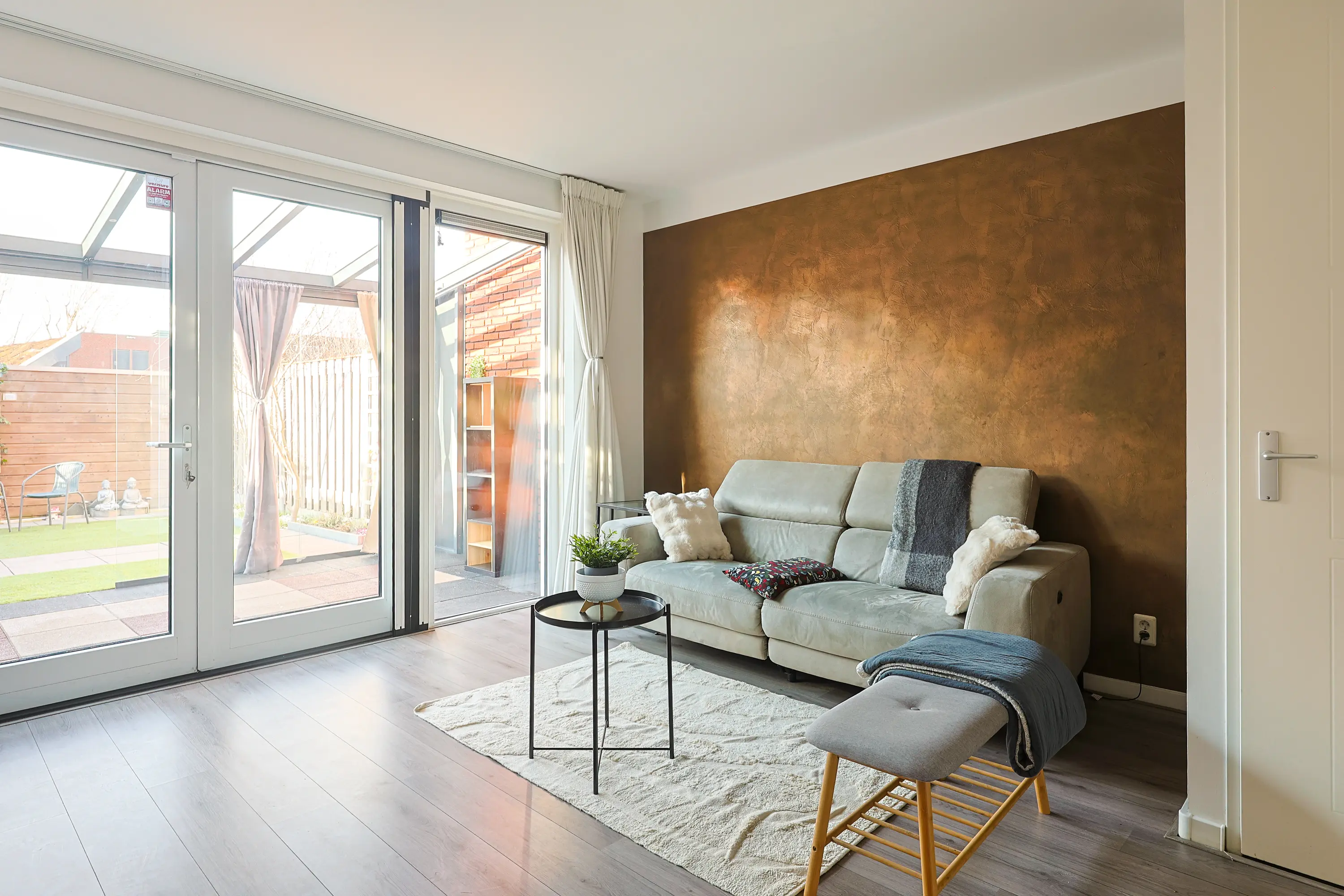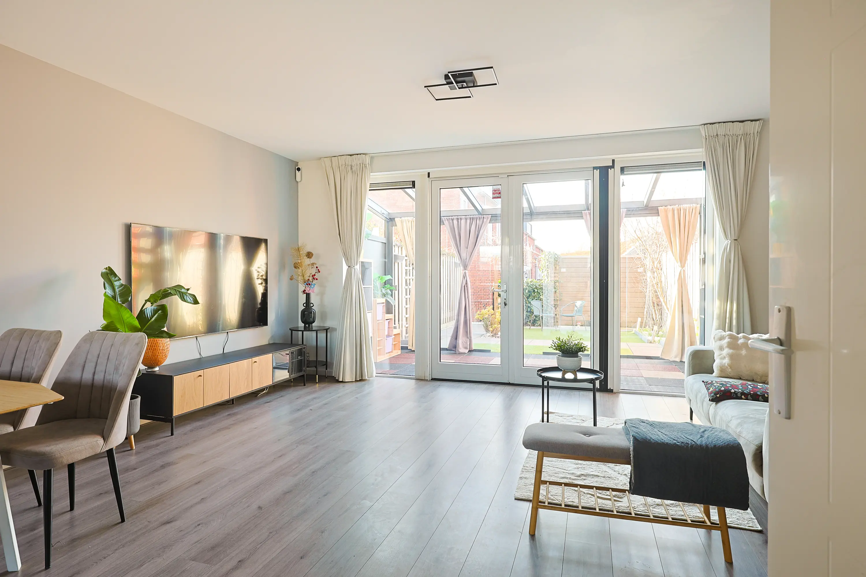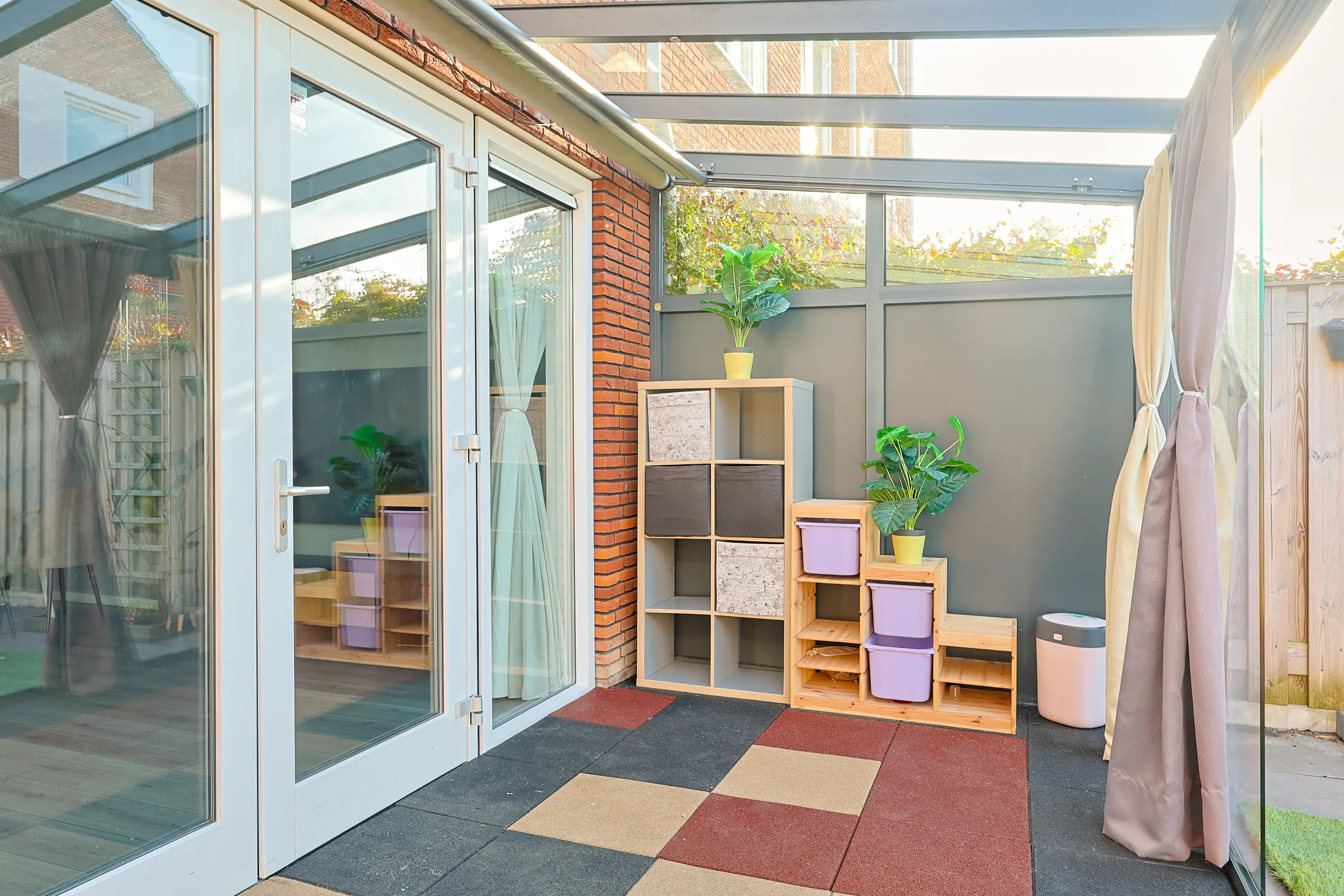 Via openslaande deuren bereik je de professioneel aangelegde serre: een volwaardige tuinkamer met geïntegreerde zonwering. De achtertuin ligt op het westen, waardoor je vanaf de middag tot in de avond van de zon geniet. Doordat er geen directe achterbebouwing is, ervaar je hier extra privacy en vrij uitzicht. Achterin de tuin bevindt zich een berging en via de achterom bereik je het parkeerterrein.