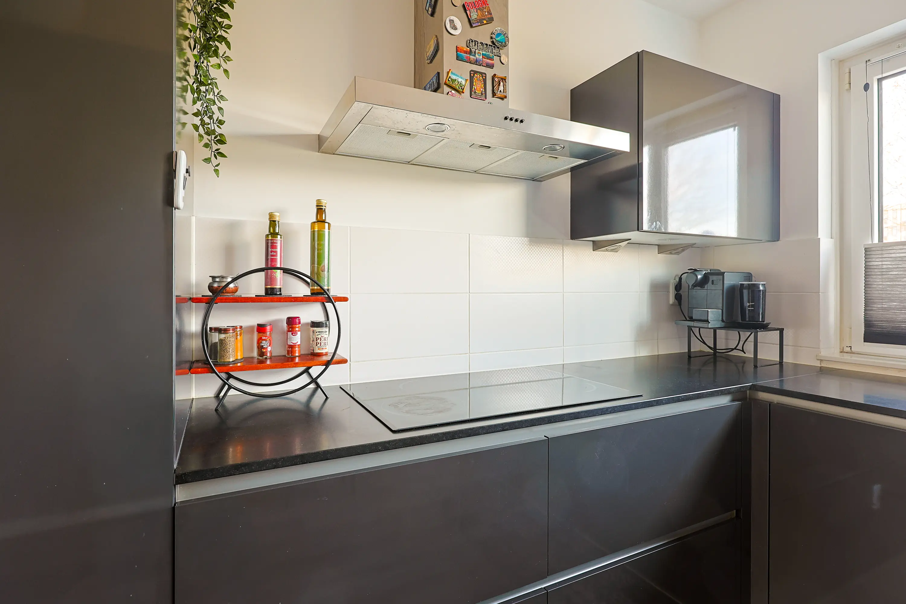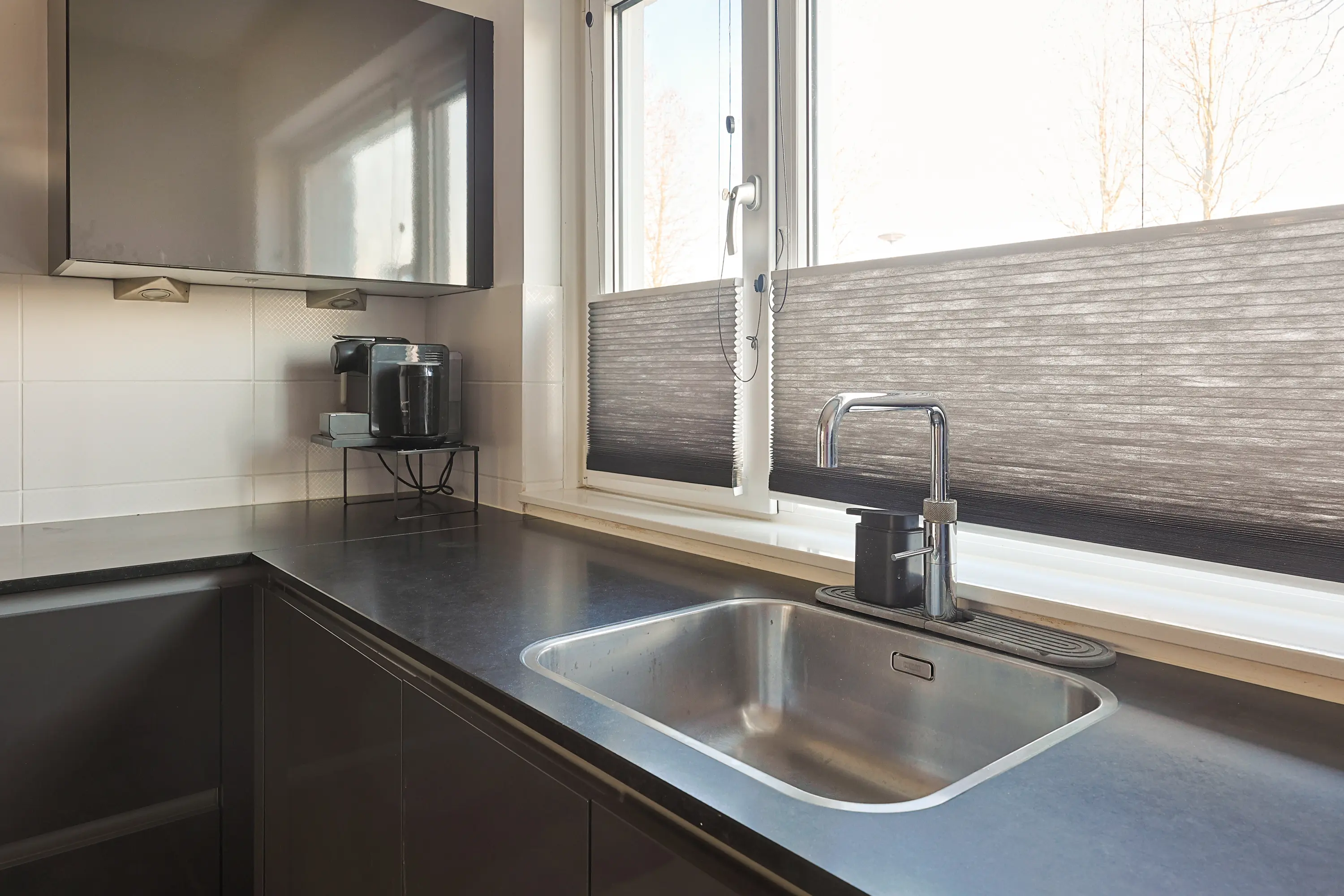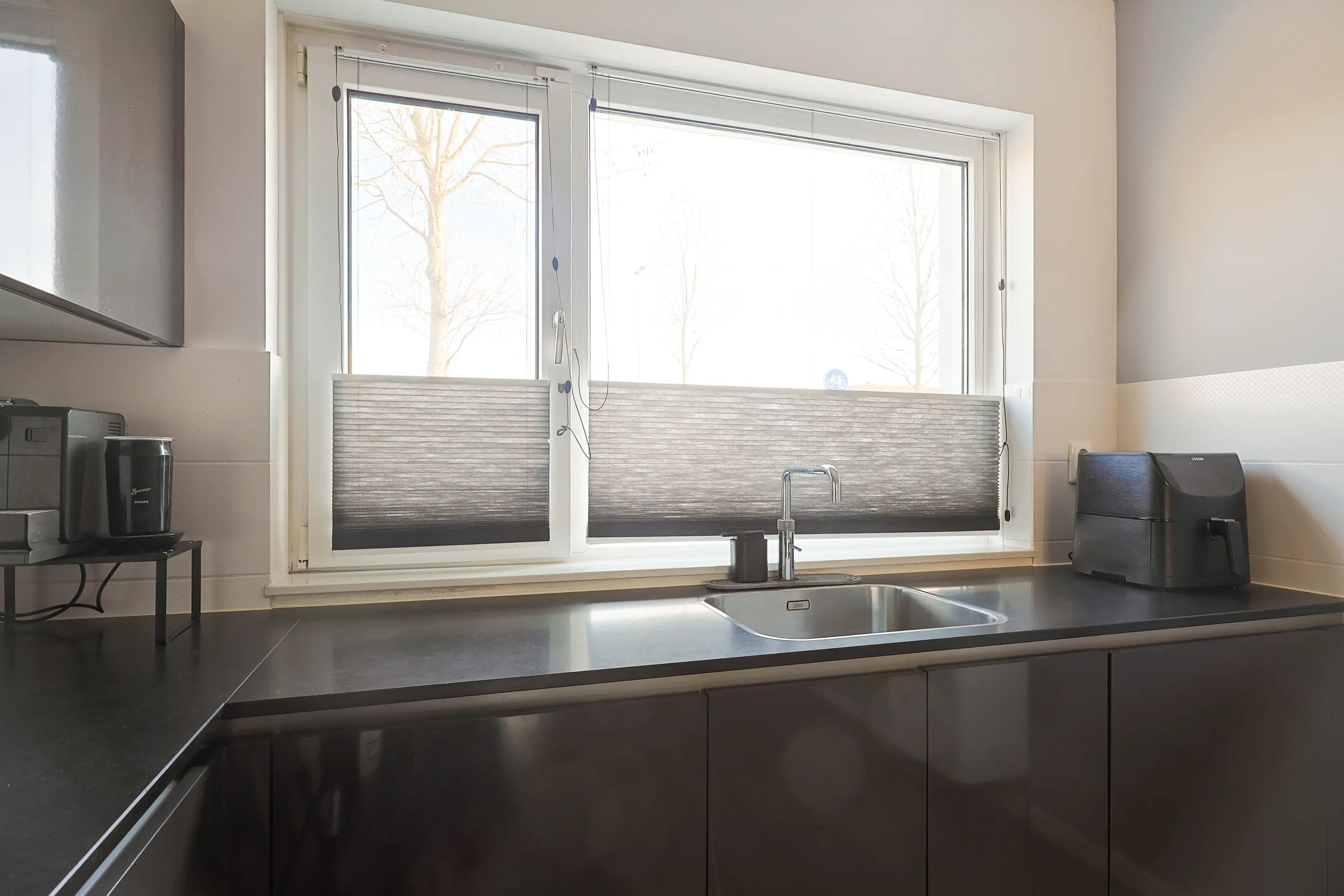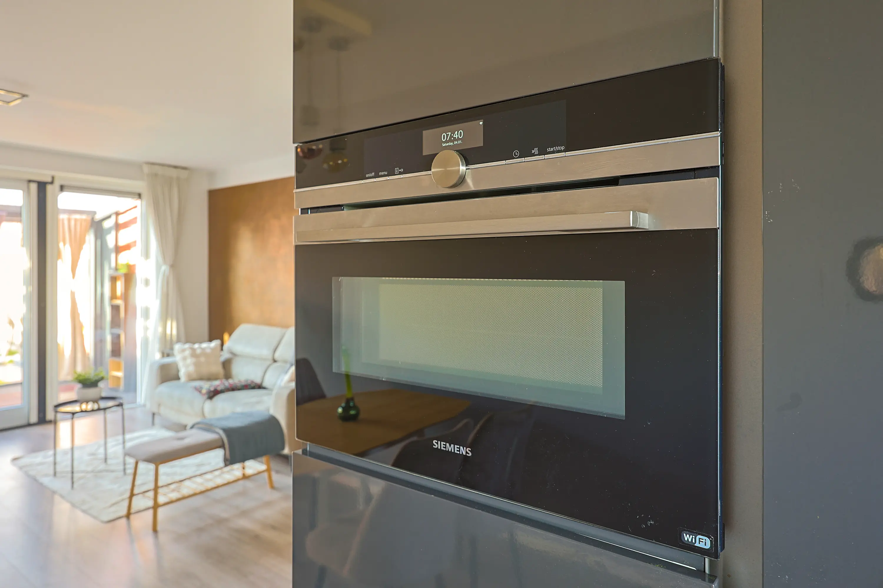 De open keuken aan de voorzijde is modern uitgevoerd en voorzien van diverse inbouwapparatuur en veel werkruimte. De oven is twee jaar geleden vervangen door een Samsung Smart Oven, wat zorgt voor extra gebruiksgemak en moderne functionaliteiten. Dankzij het grote raam is er prettig daglicht in de keuken.