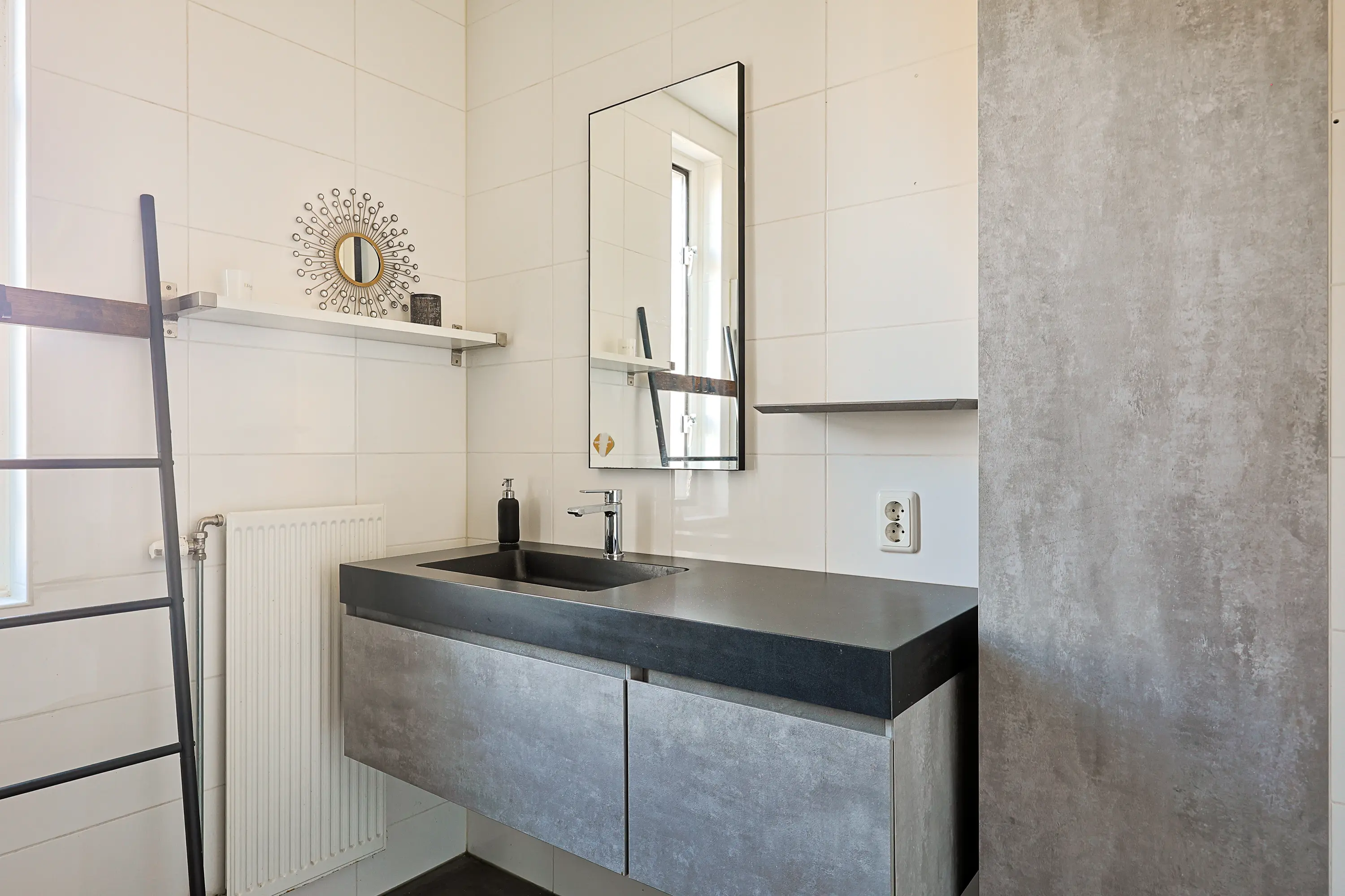 De woonkamer is ruim opgezet (meer dan 5 meter breed) en biedt volop ruimte voor een royale zit- en eethoek. De gehele begane grond is voorzien van een stijlvolle beton ciré vloer met vloerverwarming.