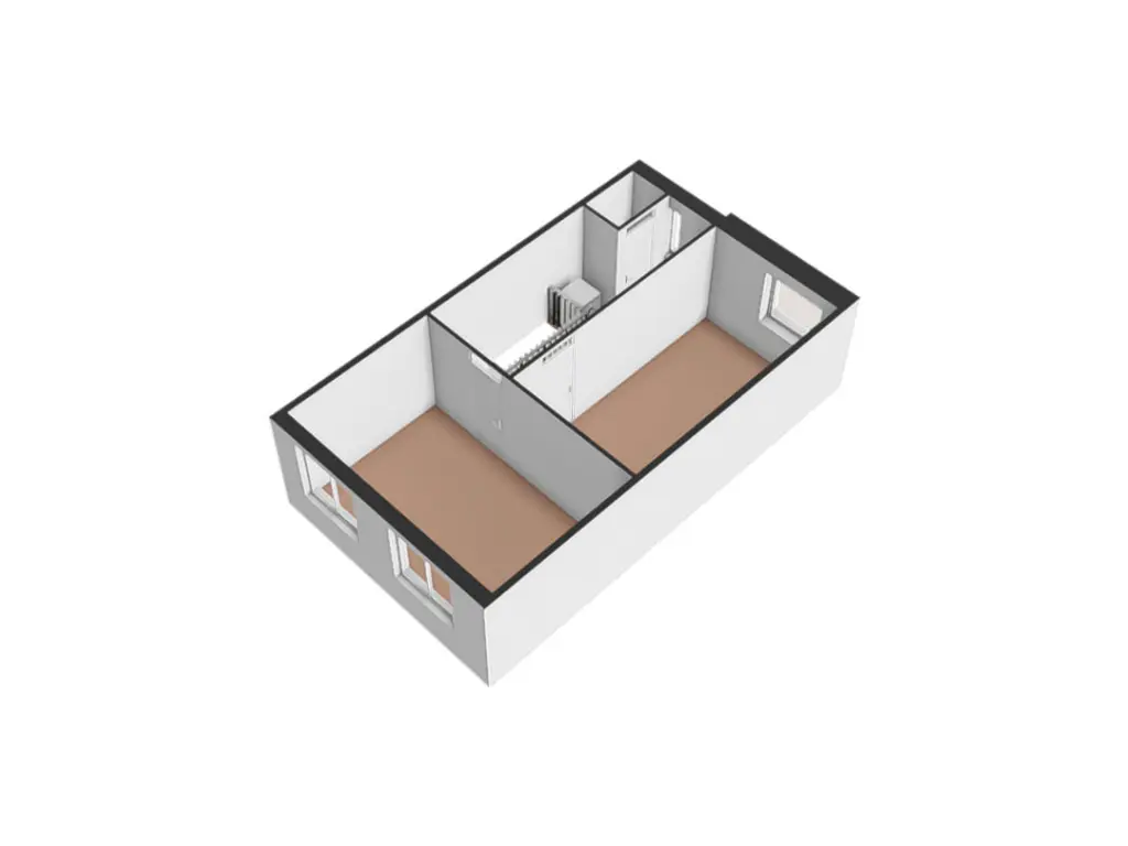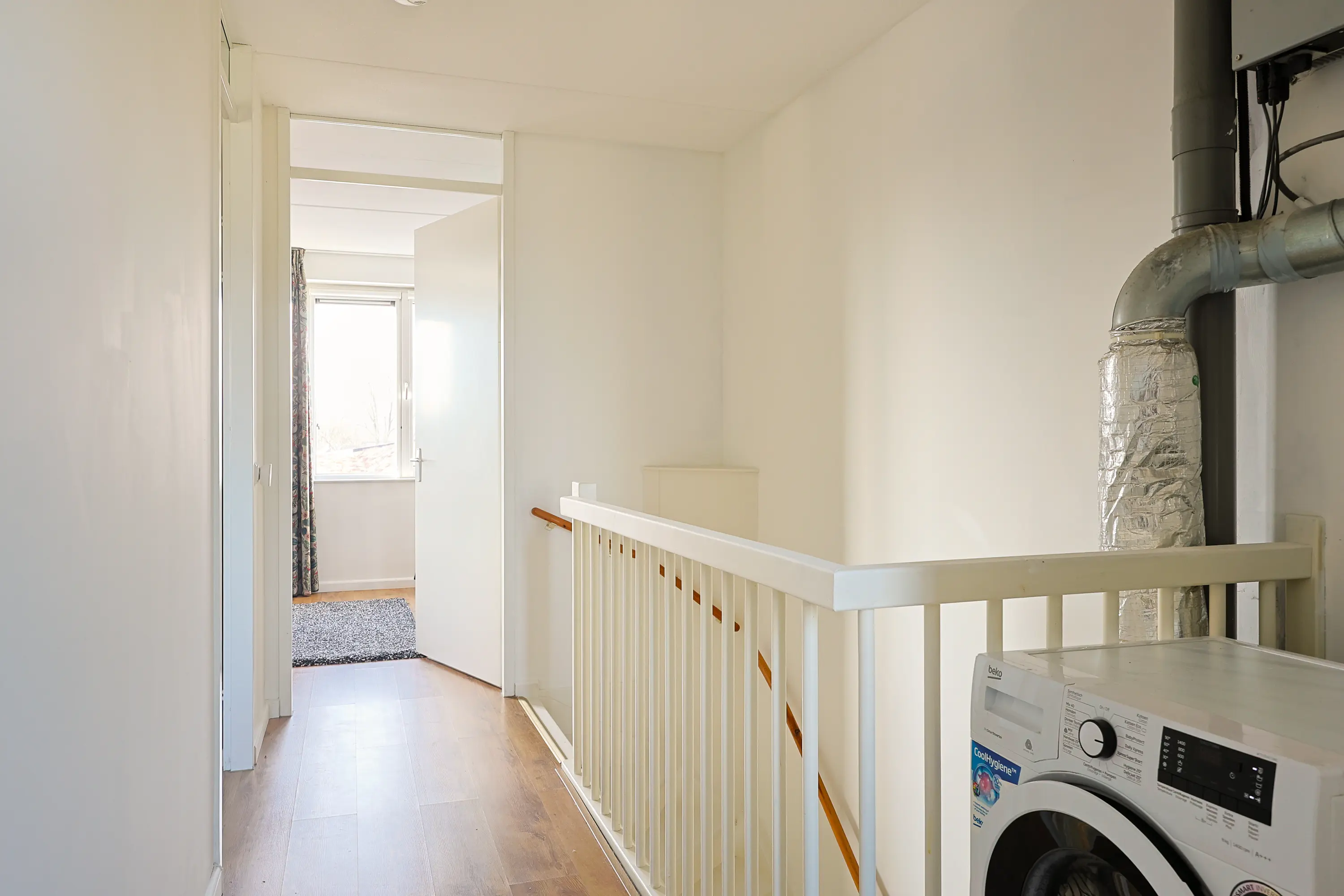 Overloop met opstelplaats voor wasmachine en droger en toegang tot twee ruime slaapkamers. Dankzij de rechte gevels is deze verdieping optimaal benut en verrassend ruim.