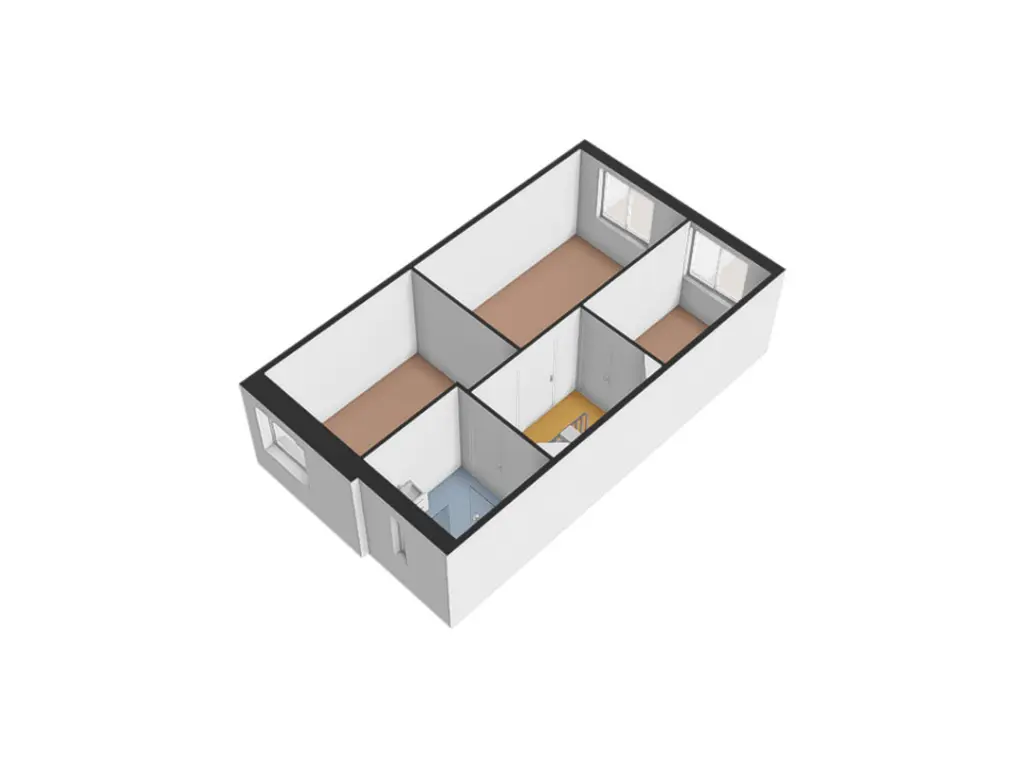 Overloop met toegang tot drie goed bemeten slaapkamers en een moderne badkamer aan de voorzijde met raam (daglicht en ventilatie).