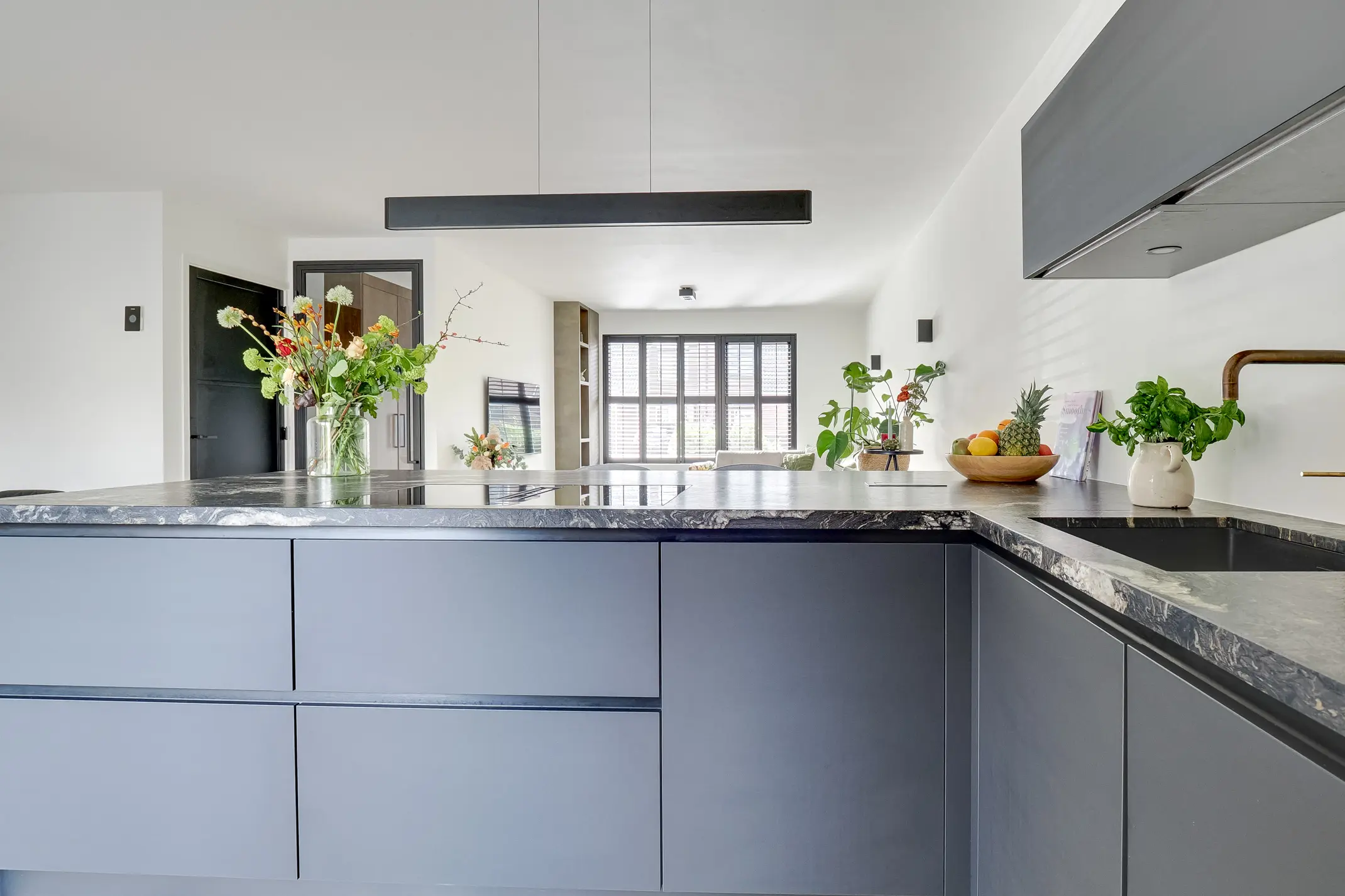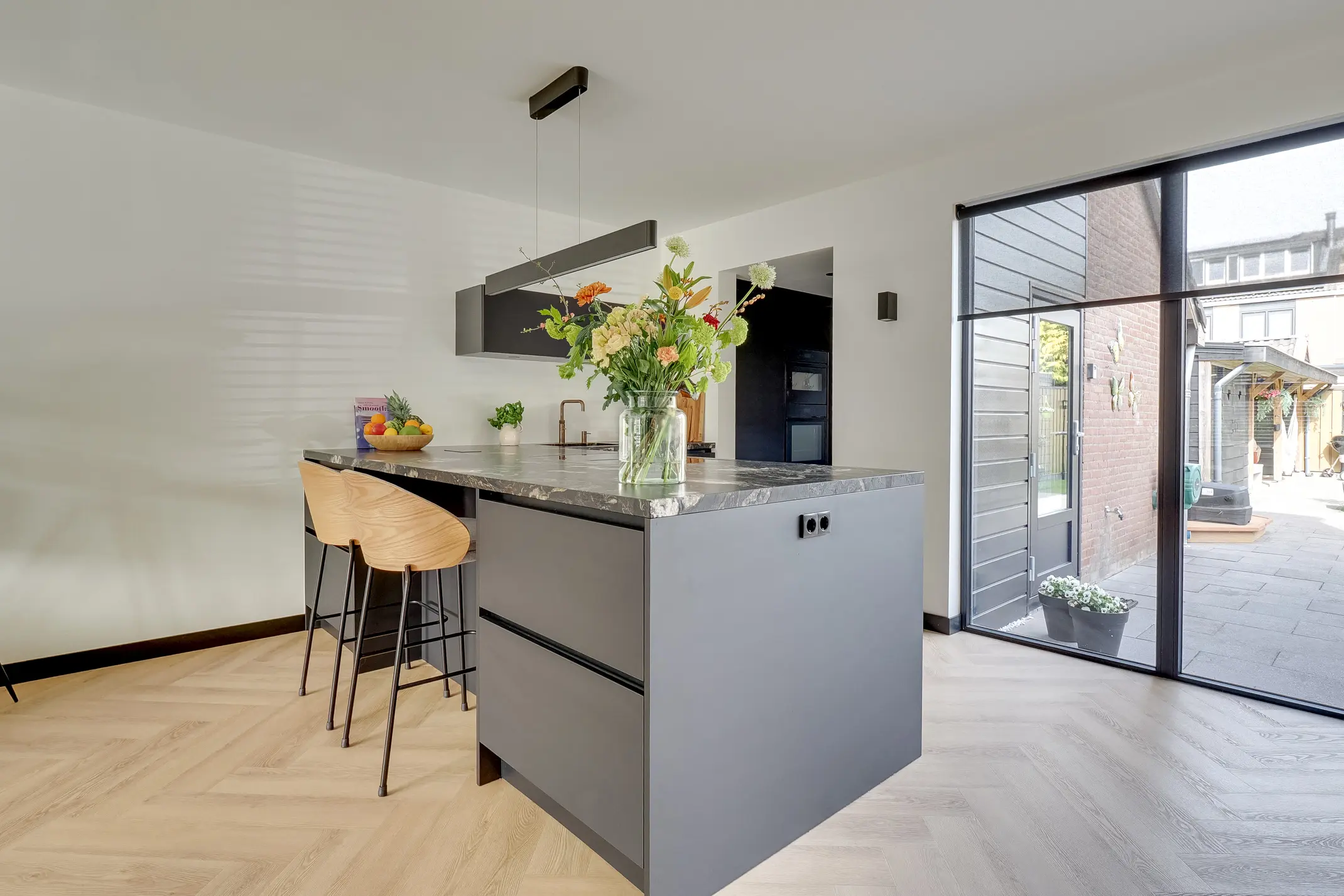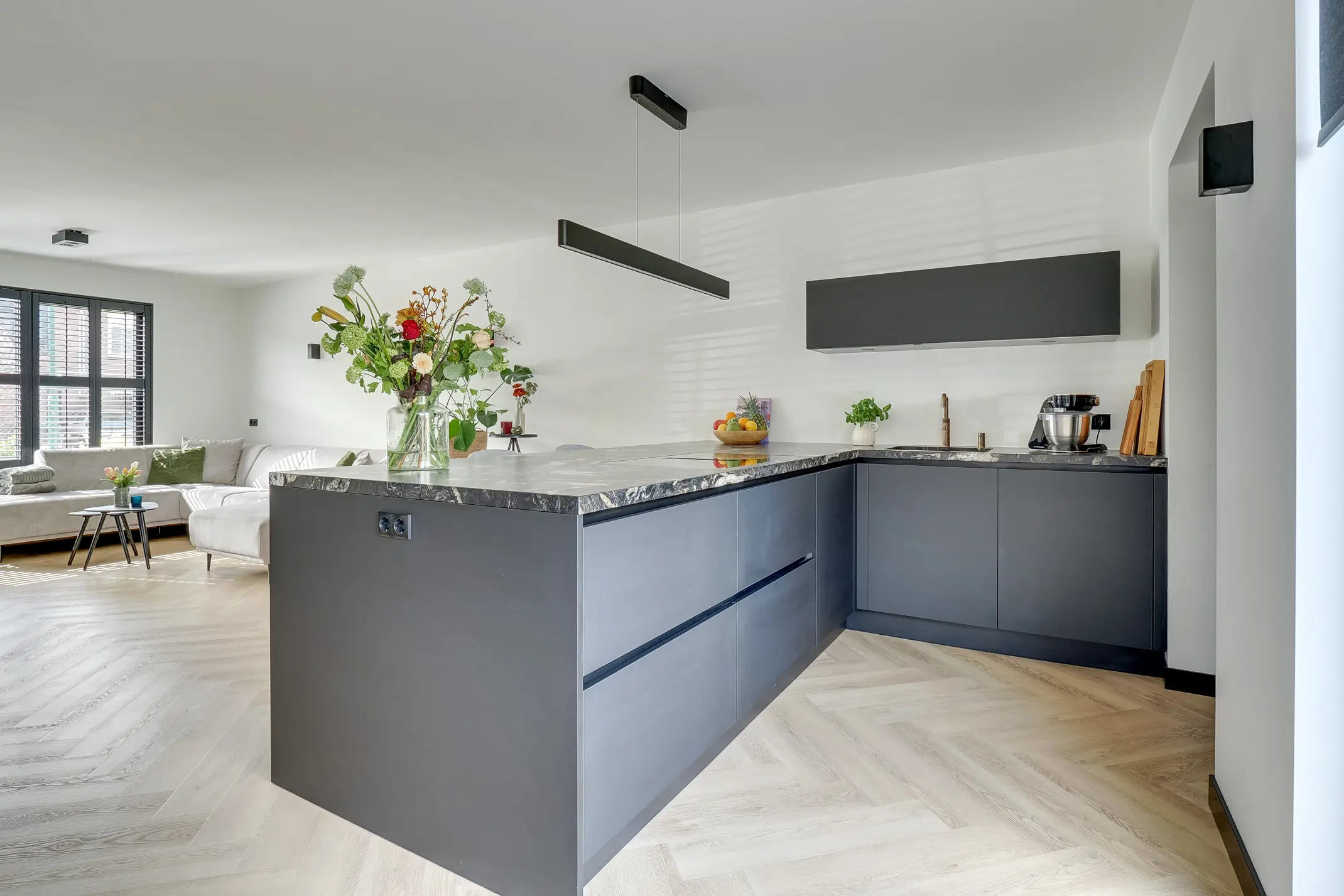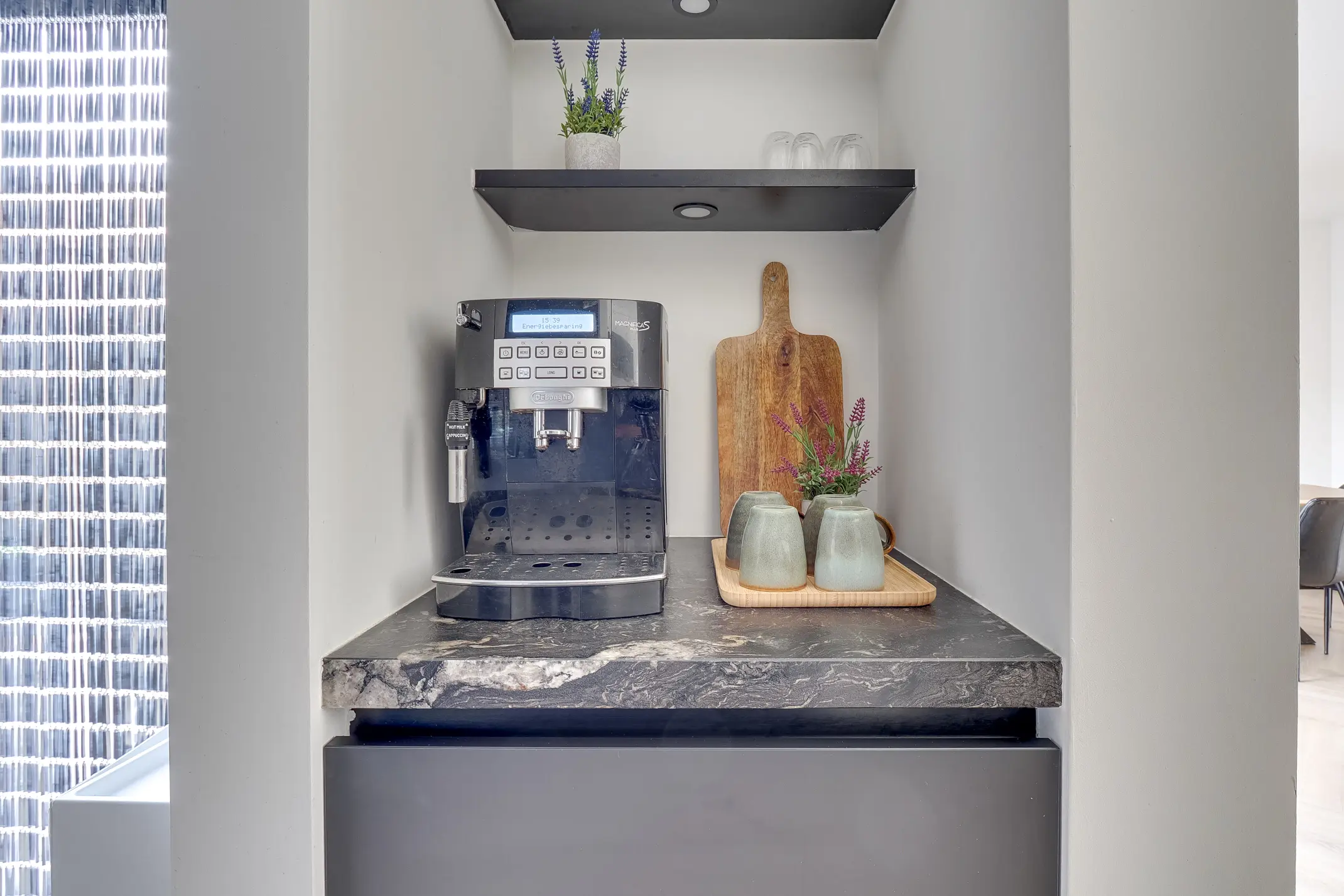 De moderne eilandkeuken (2024) is een echte eyecatcher en van alle gemakken voorzien. Denk aan hoogwaardige Neff-apparatuur, twee ovens, een slimme kookplaat, kokendwaterkraan en een stijlvolle koffiecorner. Het geborsteld granieten blad en de greeploze afwerking maken het geheel compleet.