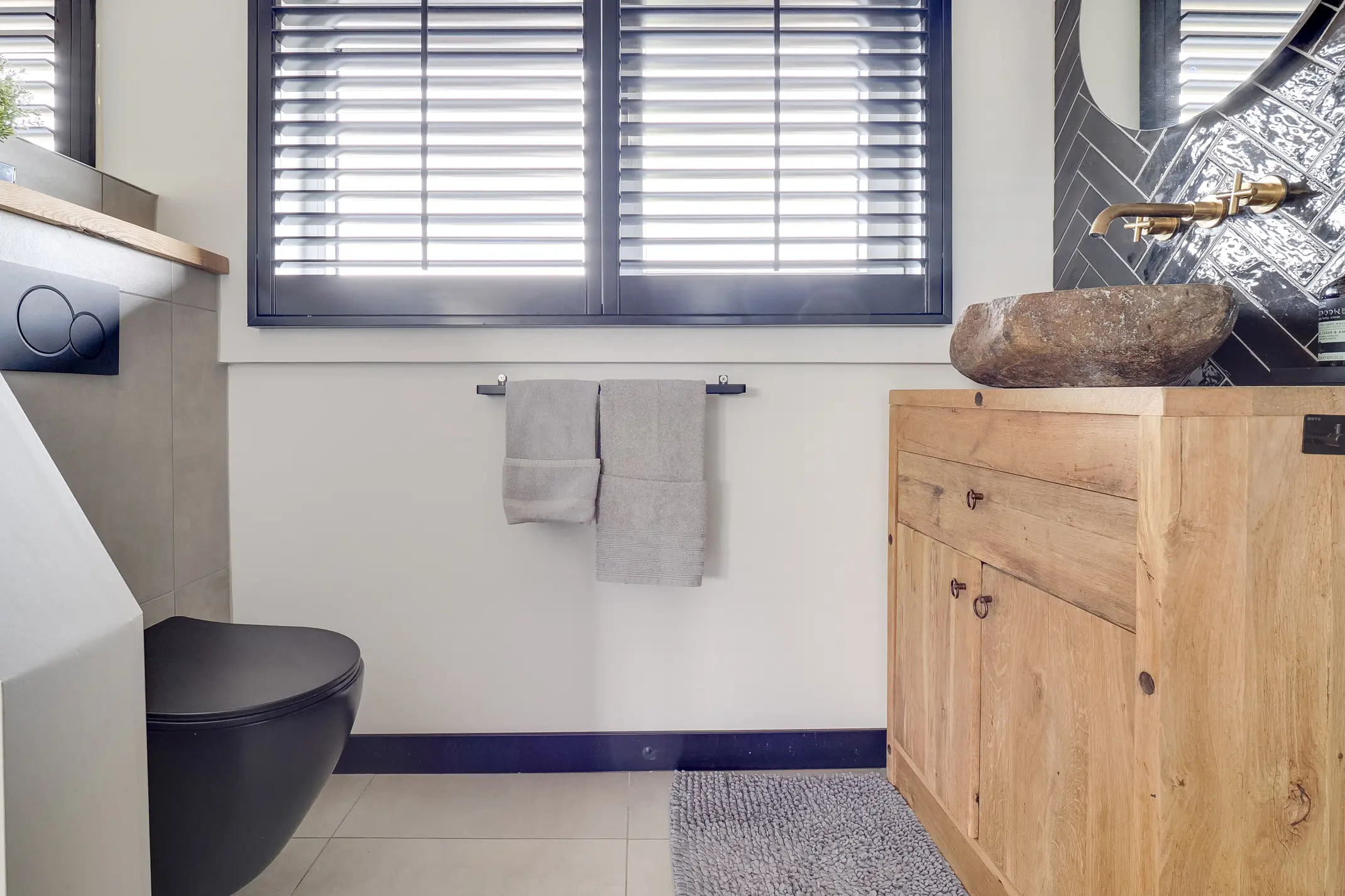 Het toilet op de begane grond is modern uitgevoerd met automatische verlichting en afzuiging.